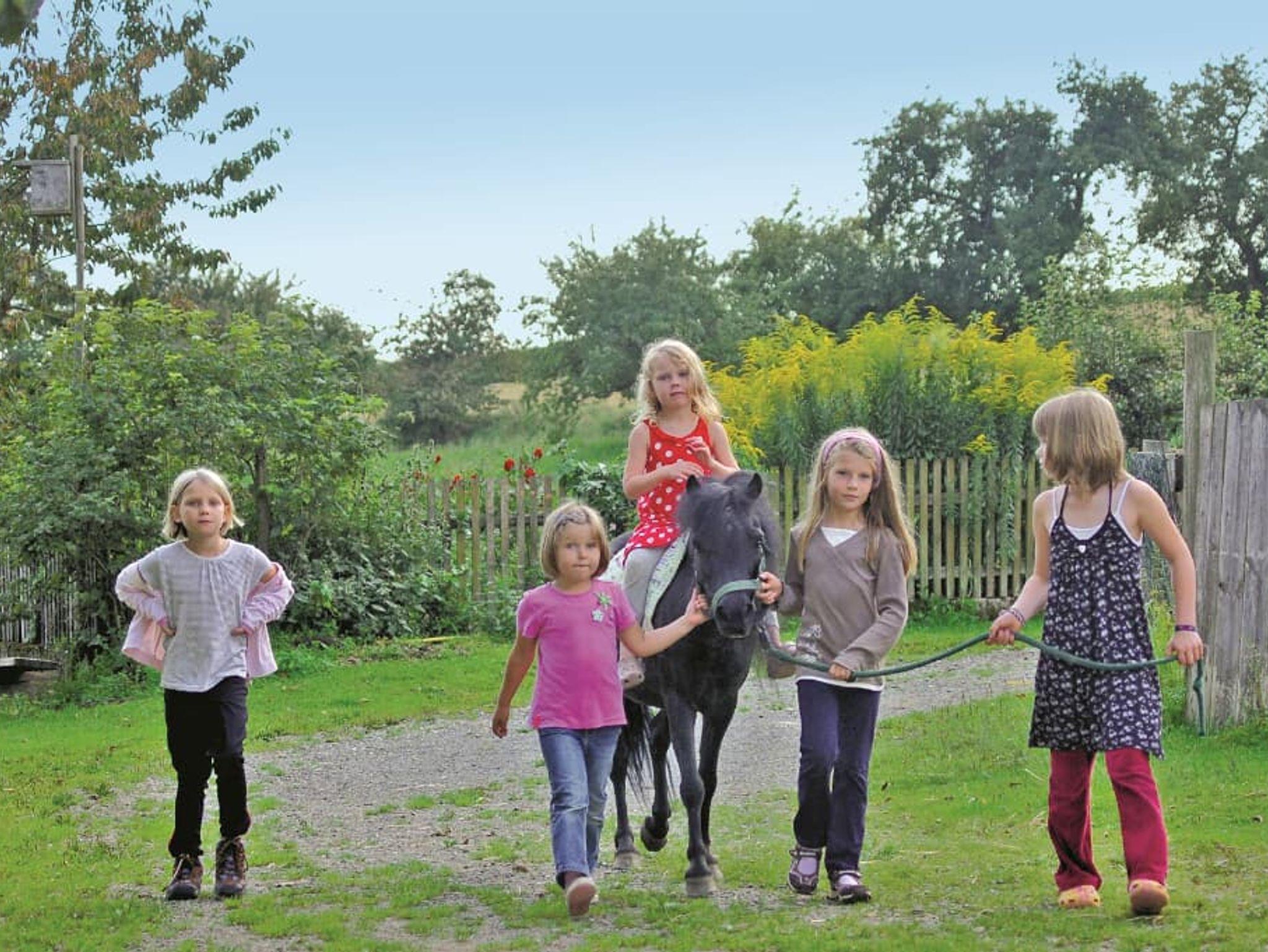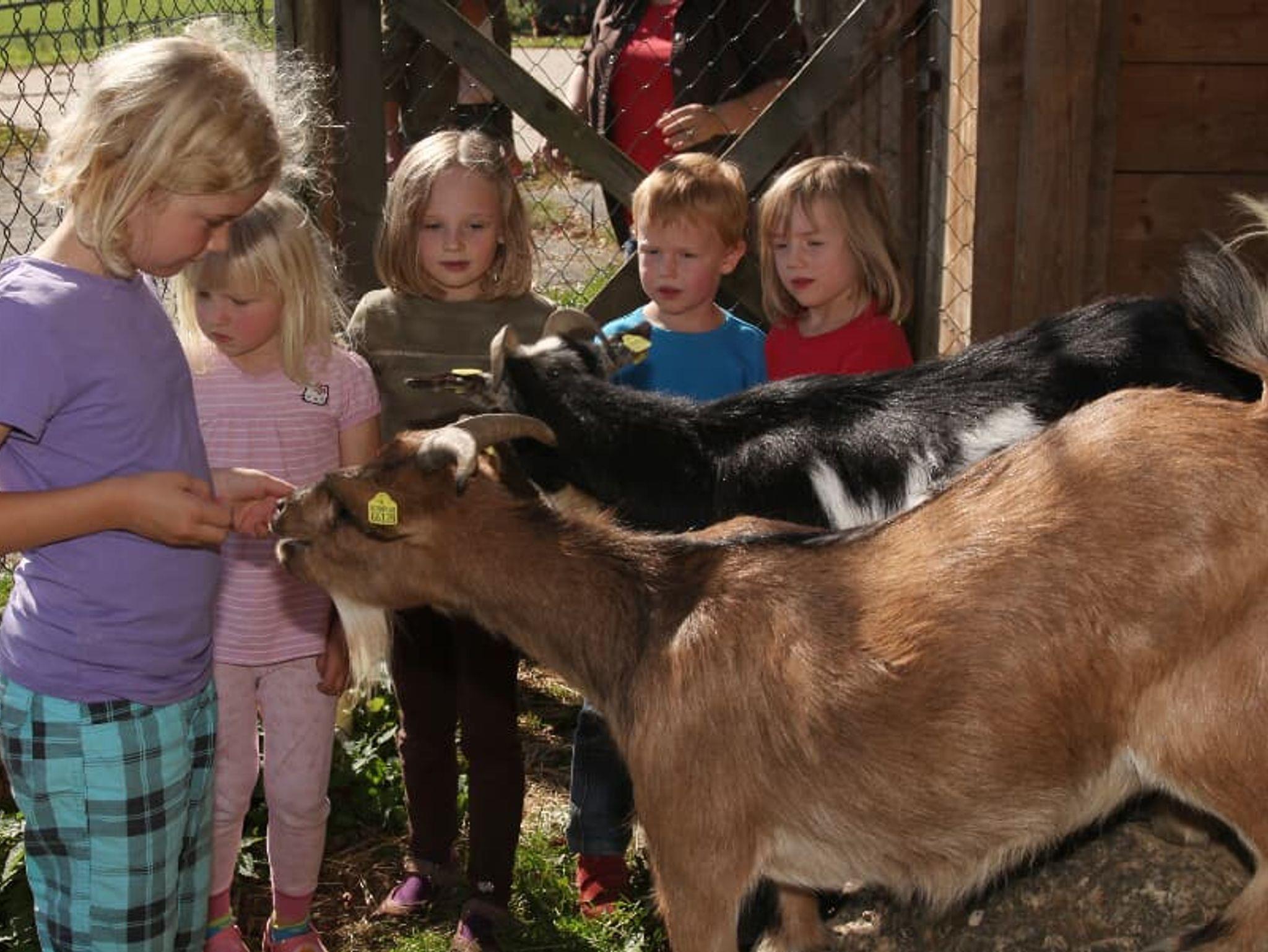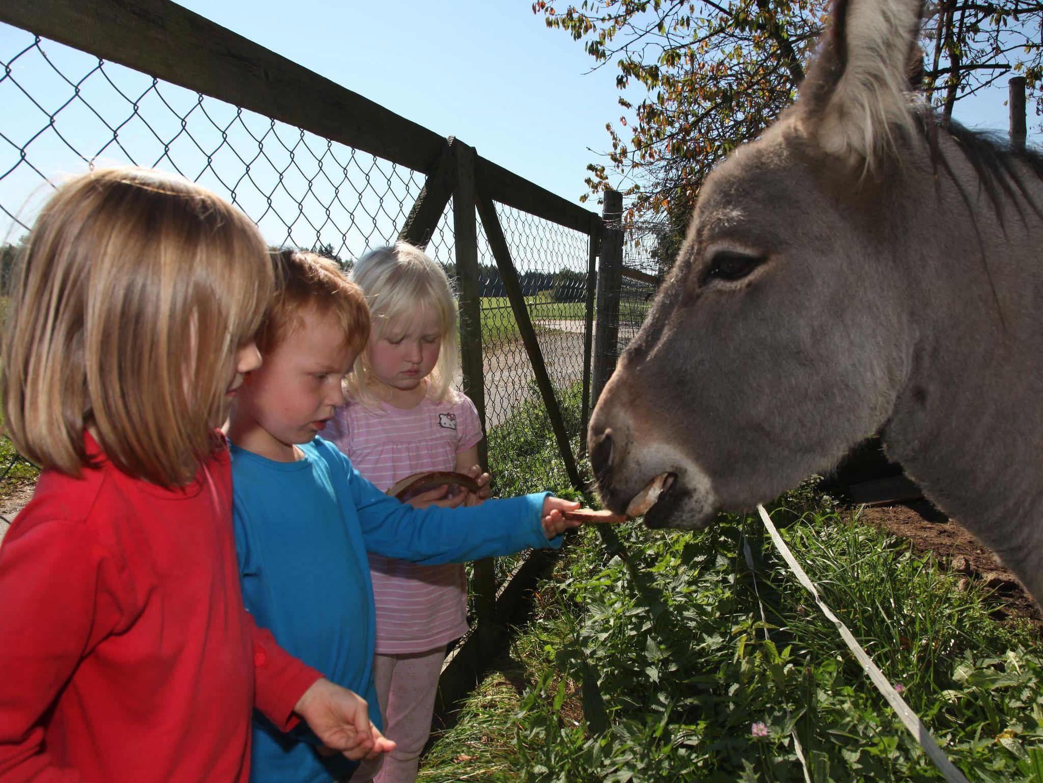 Auf dem Hof leben Schafe, Ponys, Ziegen, Hasen, Hühner, Enten, ein Esel und die lieben Kätzchen. Jedes Kind darf sein Lieblingstier versorgen. Die absoluten Renner sind: Ponyreiten und Lagerfeuer mit Stockbrotbacken…