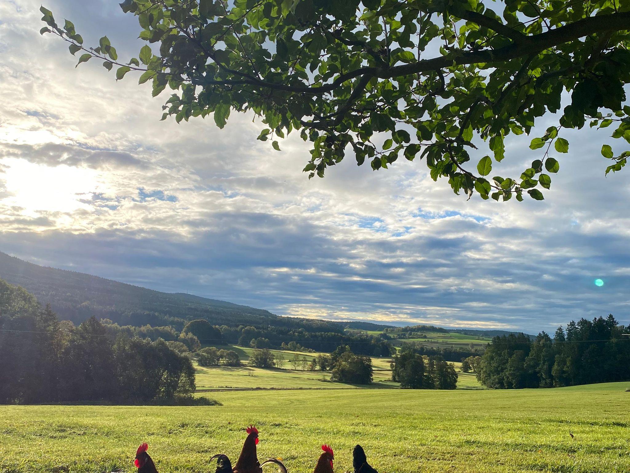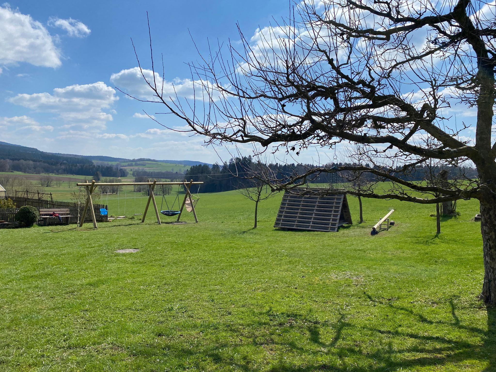 Ein Ferienhof mitten im Grünen am Ortsrand von Gaisthal. Das Besondere am Hanauerhof sind ein weiter Panoramablick zum Frauenstein und in das Aschatal, viel Platz und große Bäume rund um den Hof.