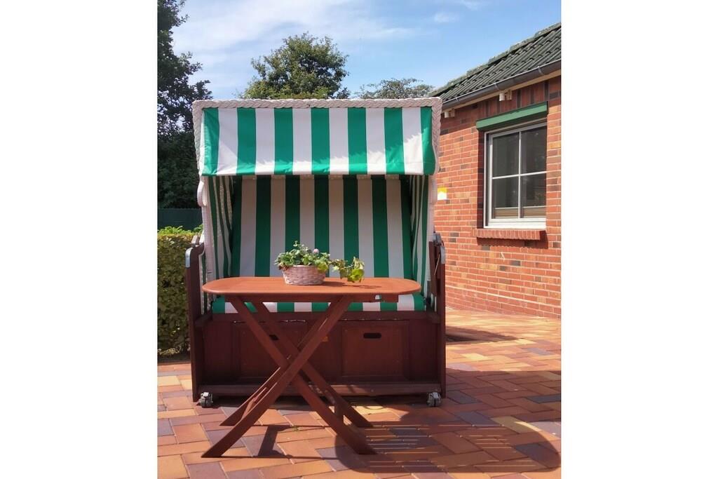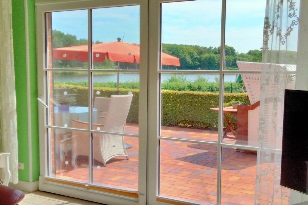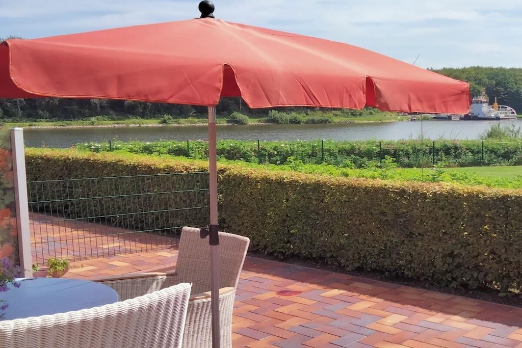 Ferienwohnung in Schafstedt mit traumhaftem Blick auf den Nord-Ostsee-Kanal und großer Terrasse mit Strandkorb.