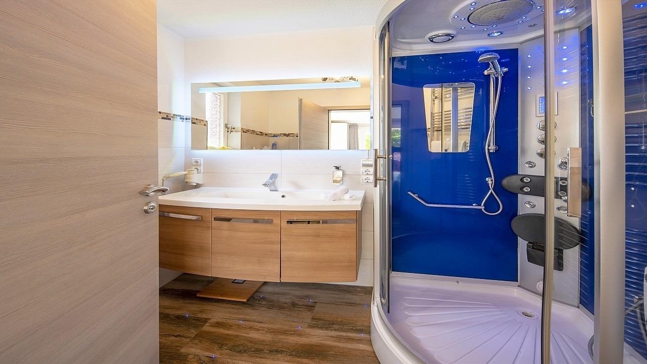 Die im gesamten Bad, blau leuchtenden Boden-LED´s bieten eine tolle Atmosphäre. Ein großer, beleuchteter Spiegel mit Uhrzeit, ein Hotelfön und eine Personenwaage sind vorhanden. Moderne Heizung aus Chrom mit Handtuchwärmer.