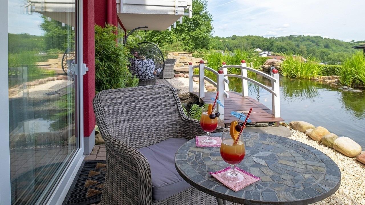 Zwei wundervoll und aufwendig angelegte Zierteiche mit Kois und anderen Fischen, 2 Wasserfälle, 2 Bachläufe und eine gepflegte Zierkiesanlage gehören zur Anlage. Die Aussenanlagen sind abends romantisch angestrahlt. In den Teichen befinden sich auch Schildkröten. Sitzen Sie gemütlich bei einem Kaffee oder einem Cocktail auf dem Balkon oder der Terrasse und schauen Sie den Fischen und den Schildkröten zu. Oder blicken Sie ins Tal auf den See.