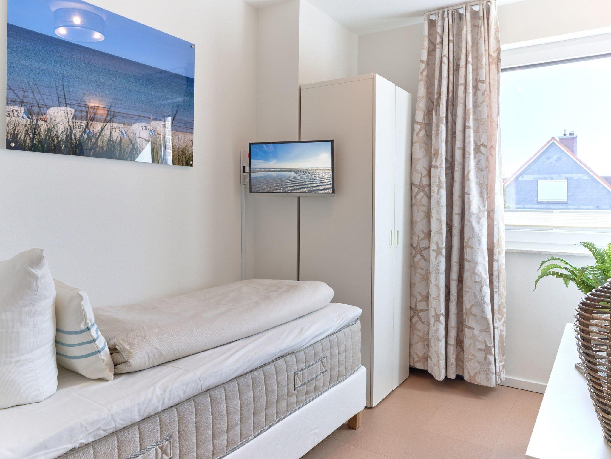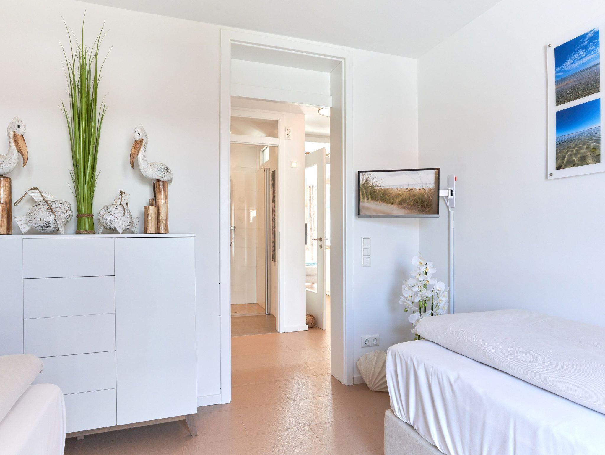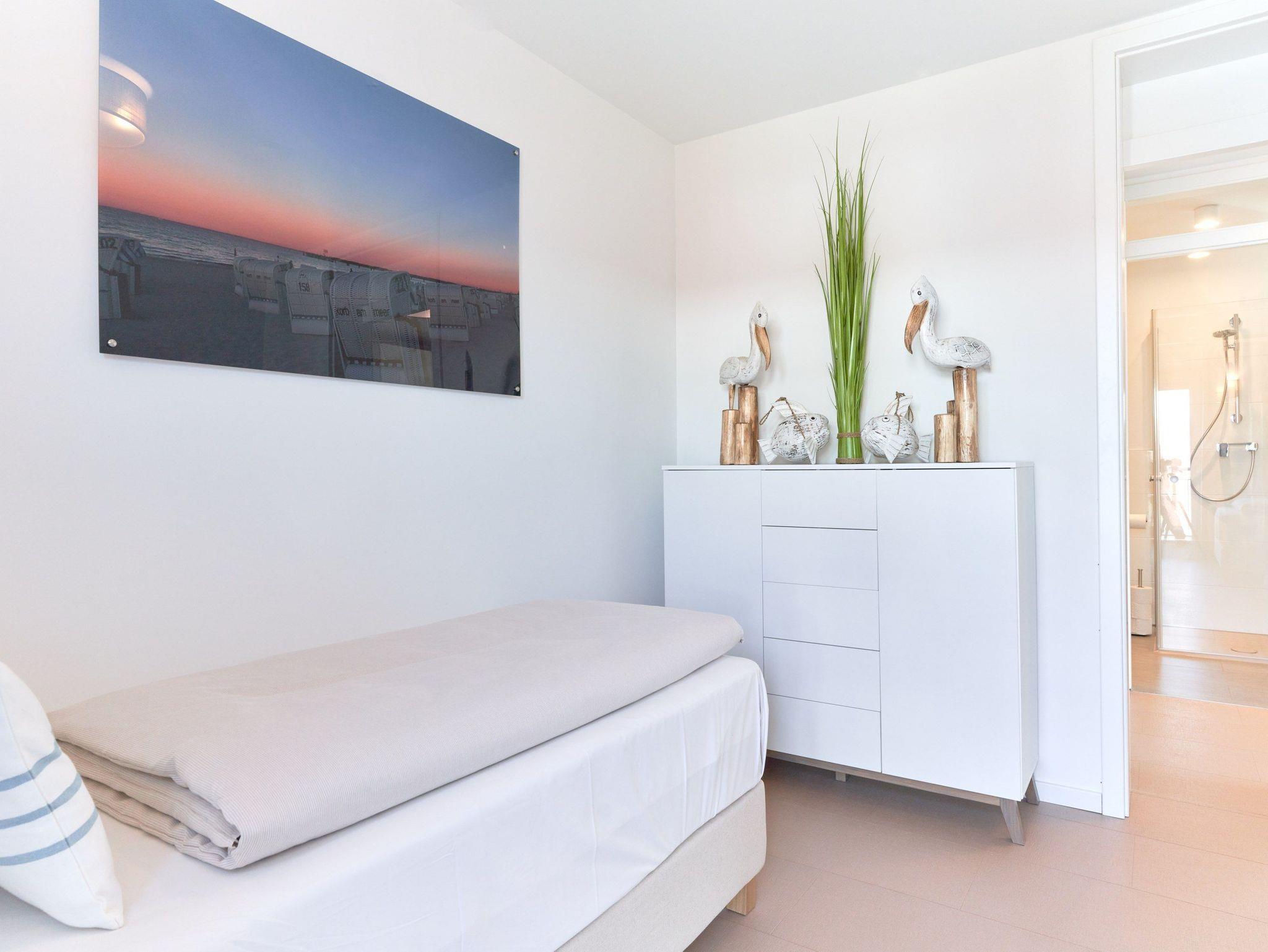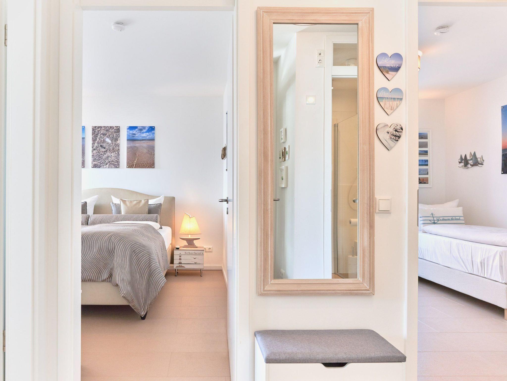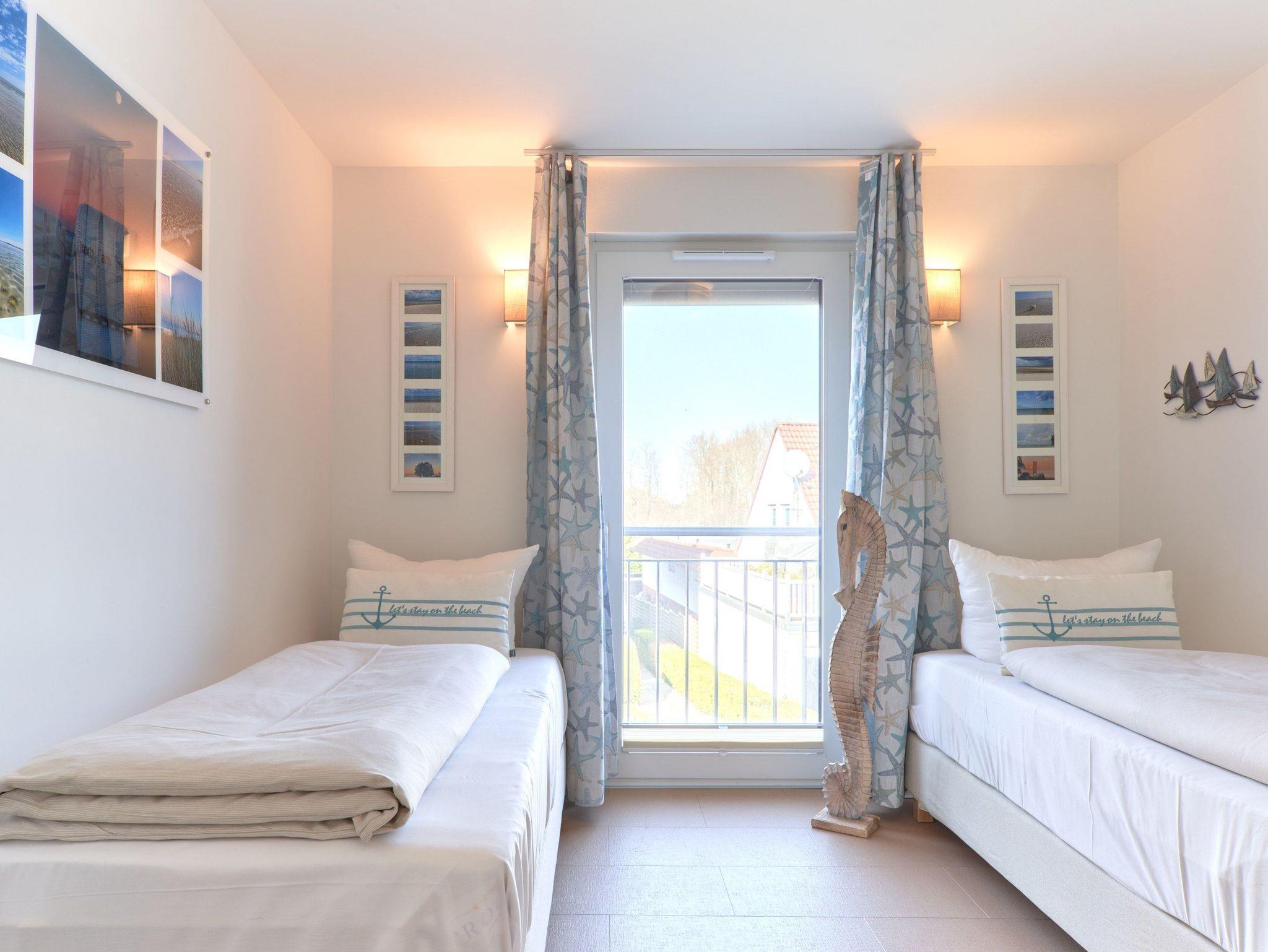 Genießen Sie Ihren Urlaub in dieser lichtdurchfluteten Ferienwohnung. Es warten auf Sie drei Schlafzimmer; 1. Schlafzimmer mit einem Doppelboxspringbett, 2. Schlafzimmer mit zwei Einzelboxspringbetten sowie ein 3. Schlafzimmer mit einem Einzelboxspringbett. Alle Zimmer lassen sich durch Außenrollläden verdunkeln, auch sind die Schlafzimmer je mit einem TV ausgestattet. Im Wohn-Essbereich erwartet Sie eine großzügige, helle sowie sehr gut ausgestatte[nbsp] Küche. Angrenzend ist der Essbereich, hier lässt es sich sehr gut sitzen, auch für lange Spielabende. Der Wohnbereich ist mit einem bequemen Sofa eingerichtet. TV und Musikanlage sind selbstverständlich ebenso wie das kostenlose WLAN. Auf dem Balkon stehen Ihnen zwei Liegen sowie ein Tisch mit vier Stühlen zur Verfügung. In heller Optik gehaltenes Duschbad mit bodengleicher Dusche, Handtuchheizkörper, Fön, Kosmetikspiegel.