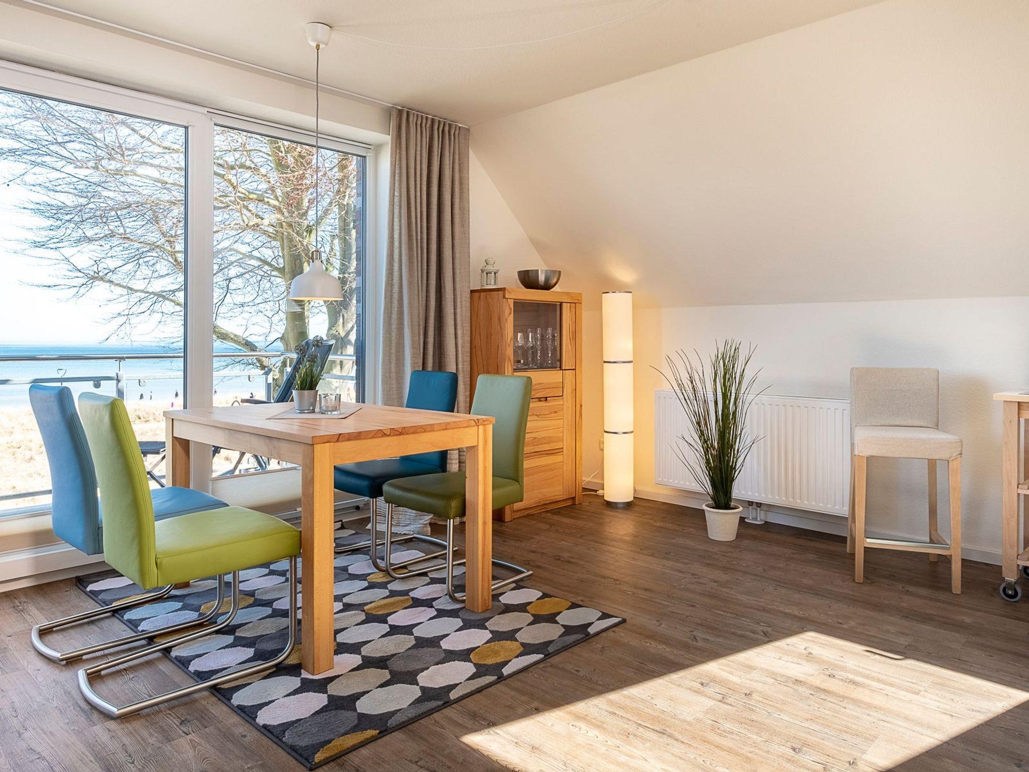 Heller, großer Wohn-Essbereich mit weitem Blick auf die Ostsee. Tiefer sowie breiter Balkon mit Tisch und Stühlen, Ostseeblick pur. Schöner Wohnbereich mit einem Sofa, 2 Sesseln sowie Beistelltischen. Flach-TV, DVD-Player, Bose-Radio, CD-Player, Bücher, Spiele und DVD´s. Der Essbereich bietet Ihnen Platz für 4 Personen. Hier können Sie ausgiebig frühstücken und den Ostseeblick genießen. Die moderne Küche ist komplett ausgestattet und lässt keine Wünsche offen. Neben der Filterkaffeemaschine steht Ihnen hier zusätzlich eine Nespresso-Maschine zur Verfügung. Kleiner Abstellraum. Selbstverständlich steht Ihnen auch in dieser Wohnung kostenloses WLAN zur Verfügung.