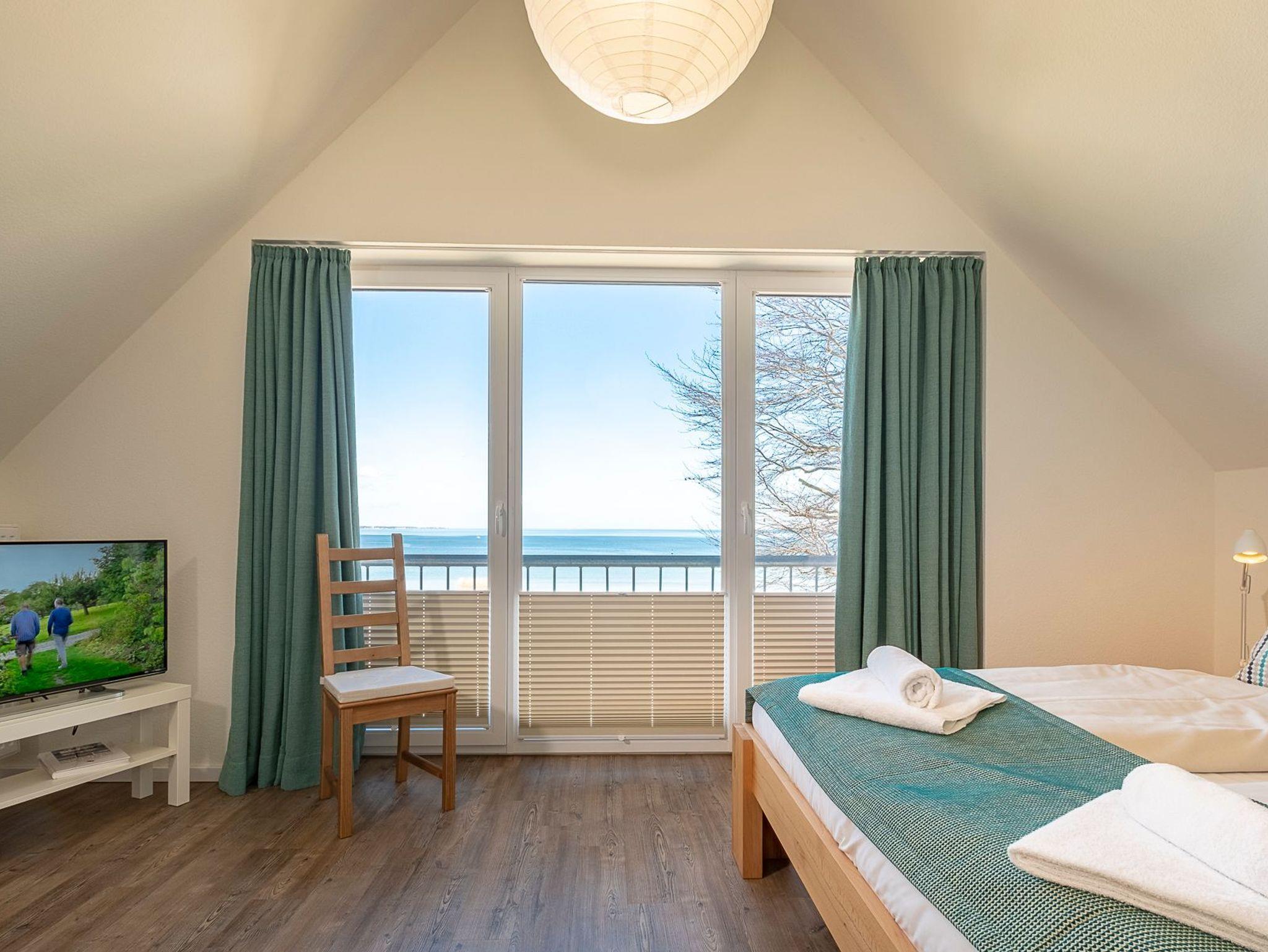 Sehr schöne 3-Zimmer-Ferienwohnung, ca. 72 m², für 3 + 1 Personen, toller, weiter Ostseeblick. Die Wohnung geht über zwei Ebenen. Balkon, Tageslichtbad, Gäste-WC, PKW-Stellplatz, Fahrradschuppen