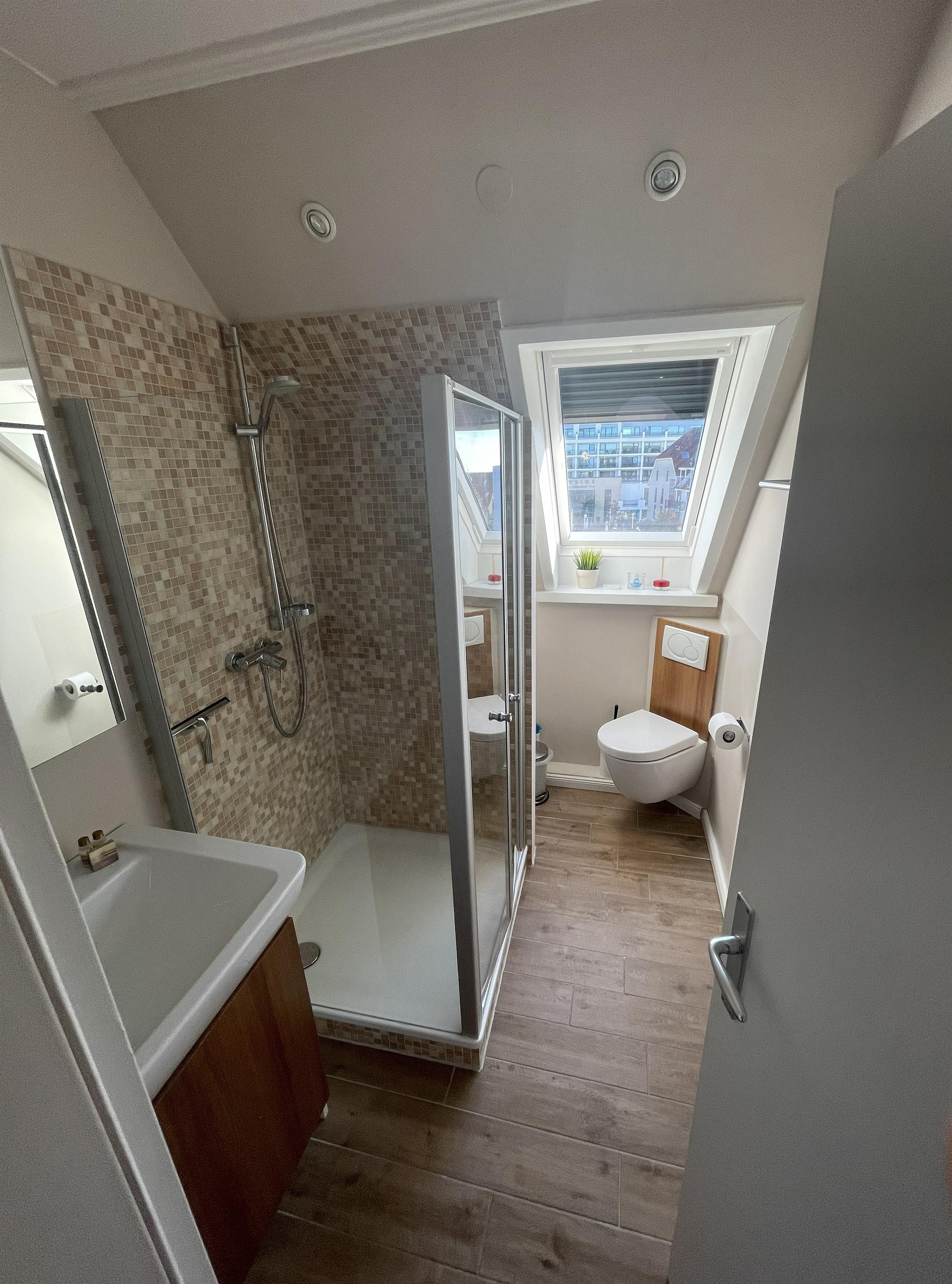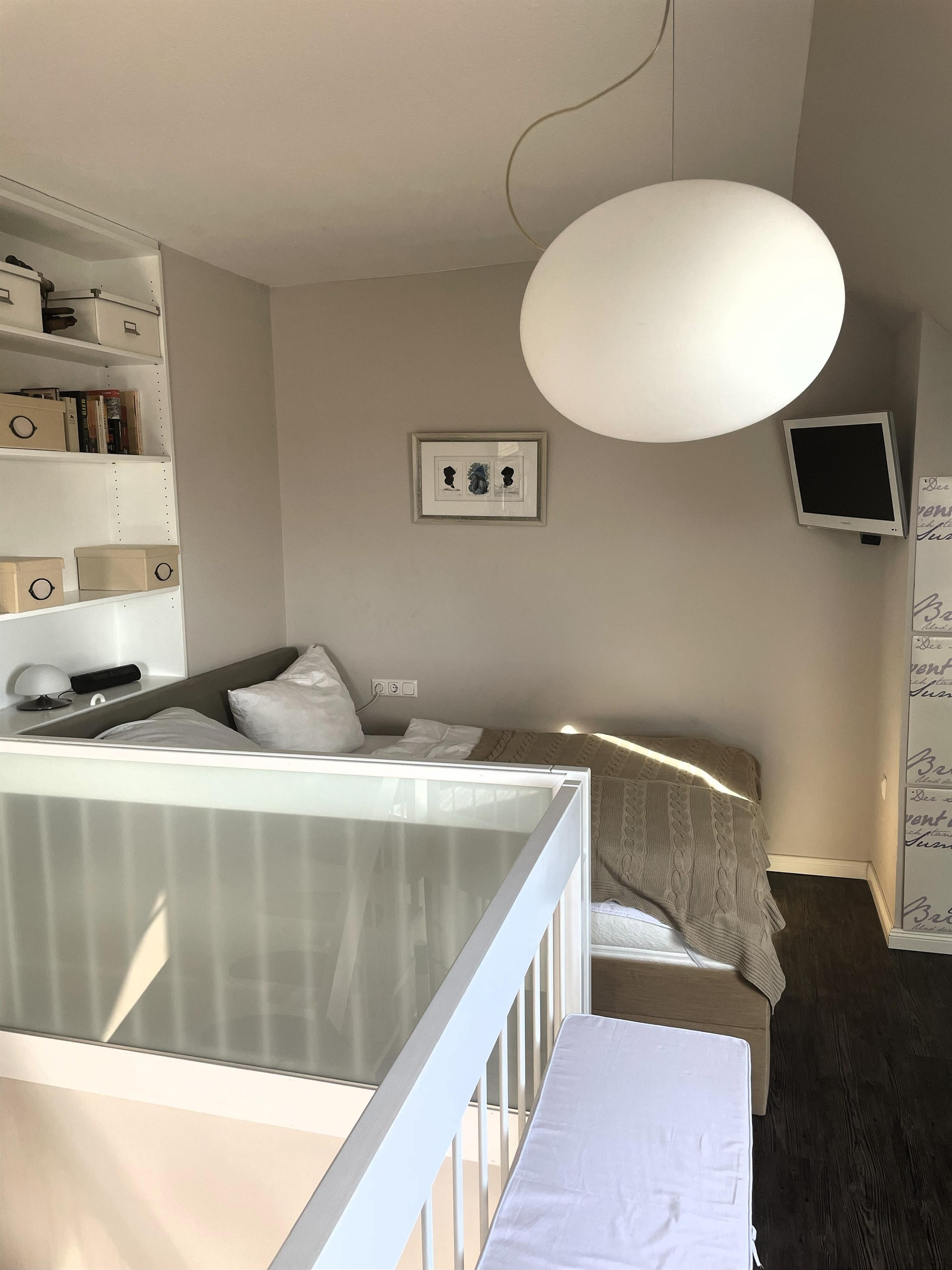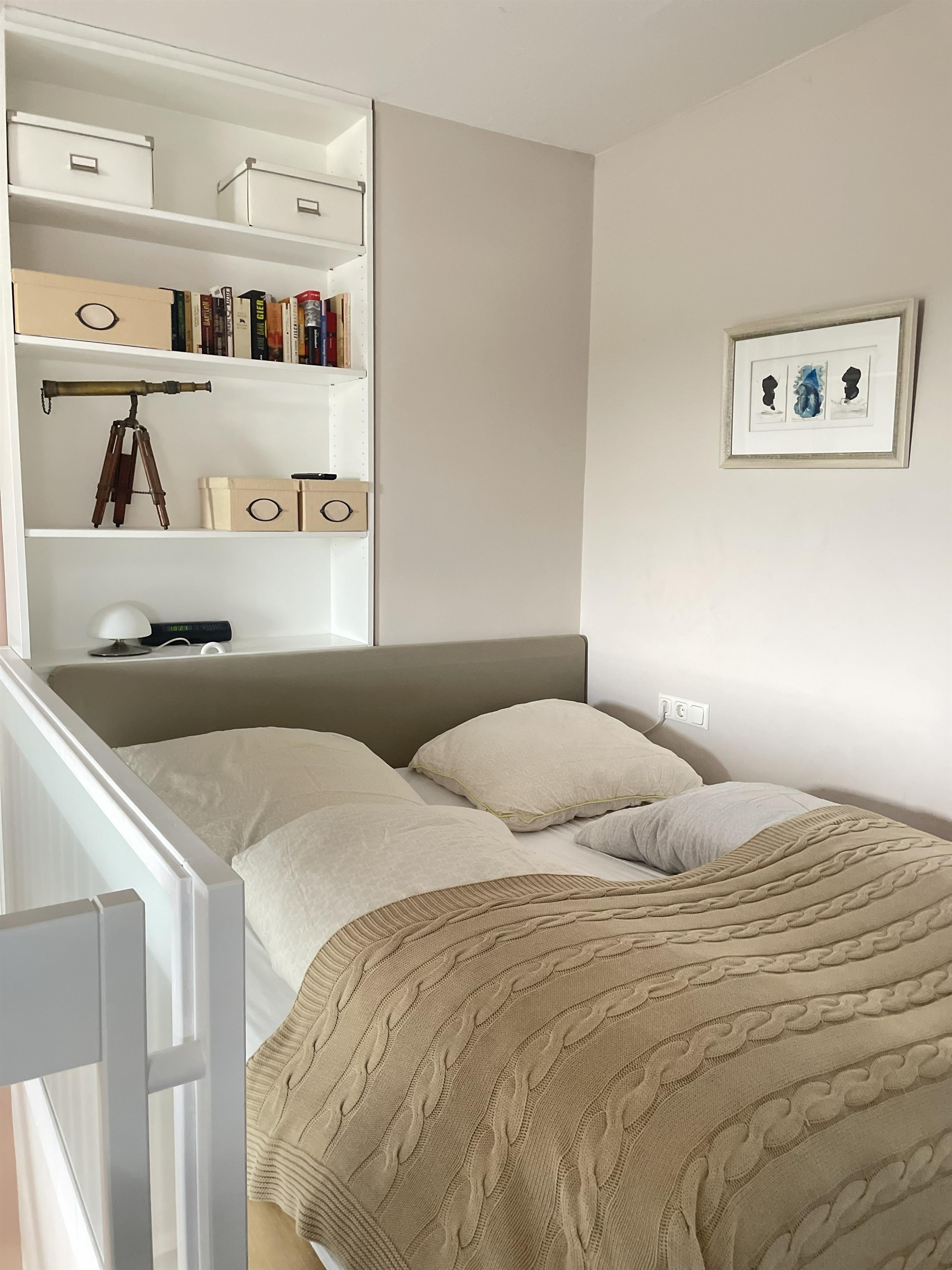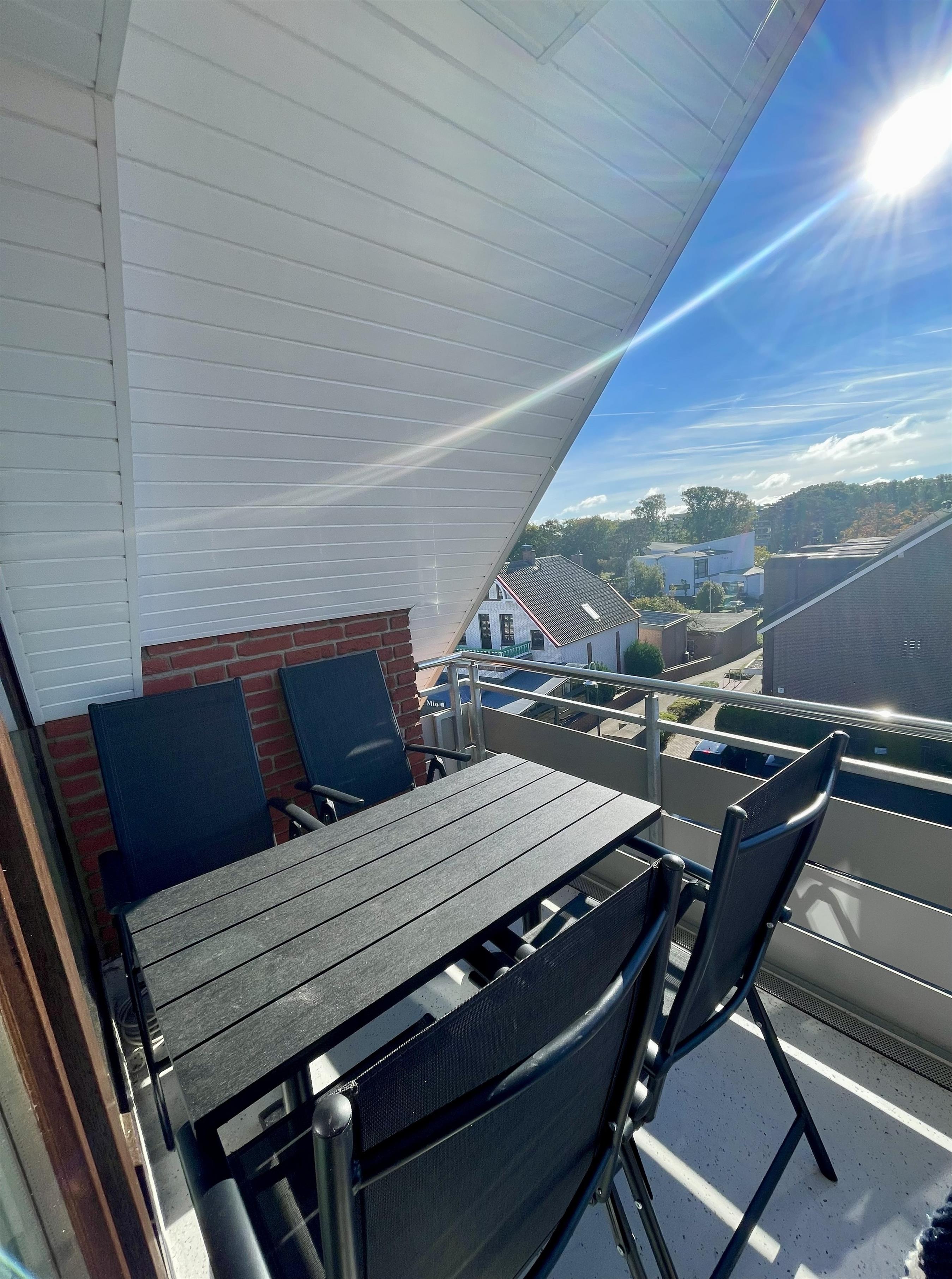 Wohnen mit Stil – dem Meer so nahIn der dritten Etage betreten Sie einen hellen Flur, der direkt in den modernen Wohn-Essbereich mit angeschlossener Pantryküche führt. Warme Farben, natürliche Materialien und liebevolle Details schaffen ein Ambiente, in dem man sofort zur Ruhe kommt. Das komfortable Sofa und der gemütliche Schwingsessel laden zum Entspannen ein – beim Fernsehen mit TV und DVD Player, beim Lesen oder beim Blick in den Scharbeutzer Kurpark.Vom Wohnbereich aus gelangen Sie auf den Süd-Balkon mit leichtem Meerblick – der perfekte Ort für genussvolle Stunden im Freien. Hier befindet sich eine elegante Essecke für vier Personen – ideal für ein gemütliches Frühstück in der Morgensonne oder ein entspanntes Abendessen mit Blick über Scharbeutz. Genießen Sie die frische Ostseeluft und das besondere Licht der Lübecker Bucht.Moderne Loungesessel laden anschließend dazu ein, den Tag bei einem Glas Wein und dem sanften Klang der Wellen stilvoll ausklingen zu lassen.Auf dem zweiten Balkon auf der oberen Etage erwarten Sie weitere komfortable Loungesessel – perfekt, um Sonne zu tanken, zu lesen oder einfach den Moment zu genießen.Komfort und AusstattungDer elegante Essbereich mit gemütlichen Freischwinger-Stühlen bietet genügend Raum für gemeinsame Mahlzeiten. In der modernen Pantryküche finden Sie alles was das Herz begehrt: Cerankochfeld, Backofen, Geschirrspüler, Kaffeemaschine, Wasserkocher, Toaster und einen exklusiven Weinkühlschrank – ideal für Genießer.Über die stilvolle Wendeltreppe gelangen Sie in den offen gestalteten Schlaf- und Relaxbereich. Hier erwartet Sie ein gemütliches Daybed zum Entspannen, lesen oder für Filmabende auf dem großen Flachbildfernseher mit Soundsystem. Wer aktiv bleiben möchte, nutzt das bereitliegende Hantelset. Das komfortable Doppelbett (1,60 x 2,00 m) – Einstieg nur über das Fußende möglich – sorgt für erholsamen Schlaf, während sich das Daybed zu einem Doppelbed für zwei Kinder verwandeln lässt – ideal für den Familienurlaub an der Ostsee.Wohlfühlbad und ExtrasDas Badezimmer in der unteren Etage ist hell und modern gestaltet, mit Dusche, Waschbecken, Spiegelschrank und großen Dachfenster. Ein Föhn steht selbstverständlich auch zur Verfügung.Zur weiteren Ausstattung gehören kostenfreies WLAN, Kinderreisebett, Hochstuhl, eine elektrische Markise auf dem unteren Balkon sowie ein reservierter Parkplatz direkt am Haus. Die Wohnung ist Nichtraucher-freundlich, Haustiere sind nicht gestattet. Im Haus stehen Waschmaschine und Trockner (gegen Gebühr) zur Verfügung. Im Erdgeschoss lädt ein Gemeinschaftsraum mit Tischtennisplatte und Tischkicker zu geselligen Stunden ein – perfekt für Familien und Freunde.