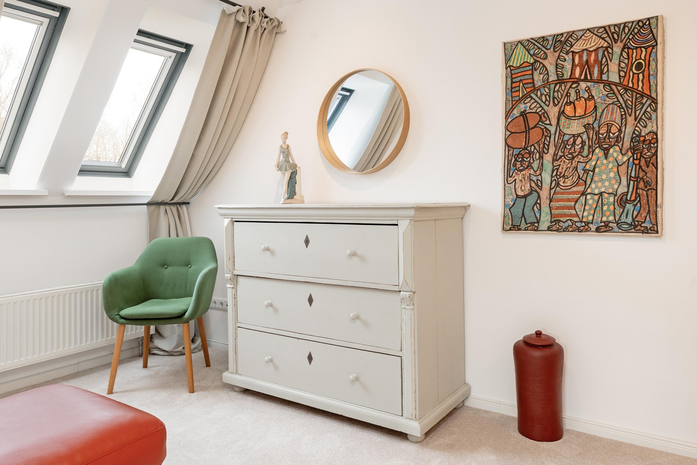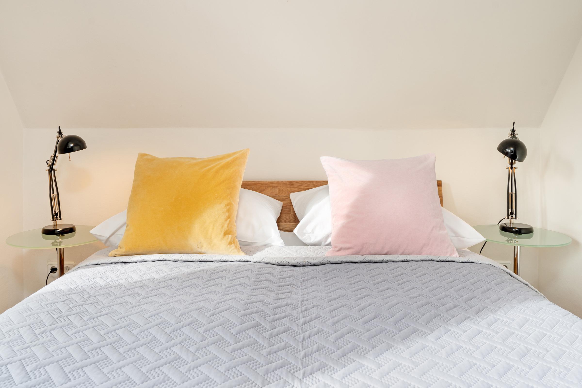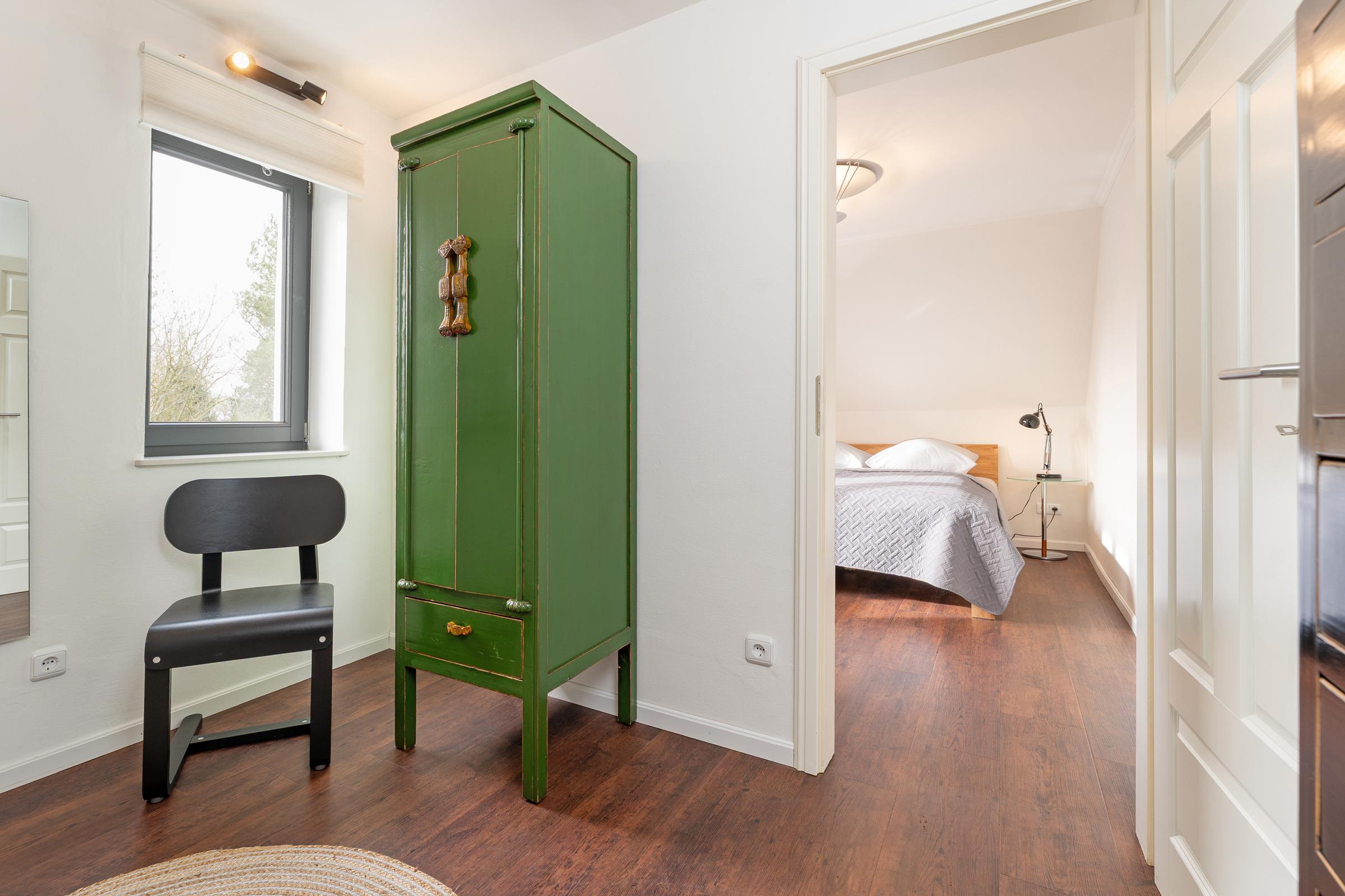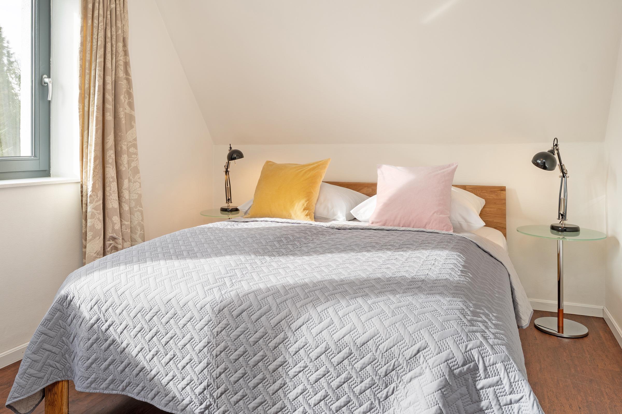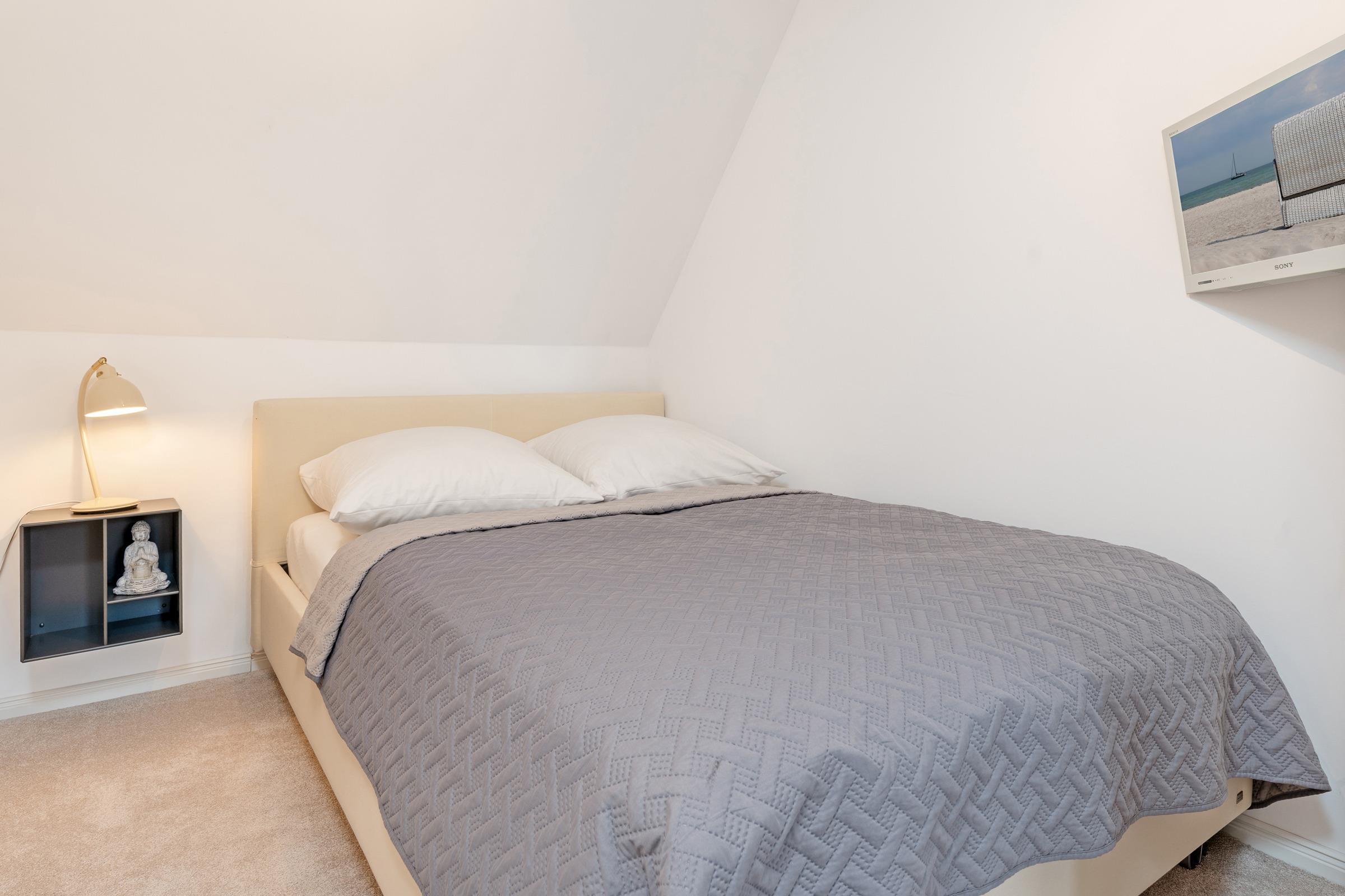 Schlafzimmer (1.OG): 1 Doppelbett (140 x 200 cm), Kleiderschrank, TV, Verdunkelung: Velux Rollo, Verdunkelungsvorhänge, Platz für ein Babybett vorhanden