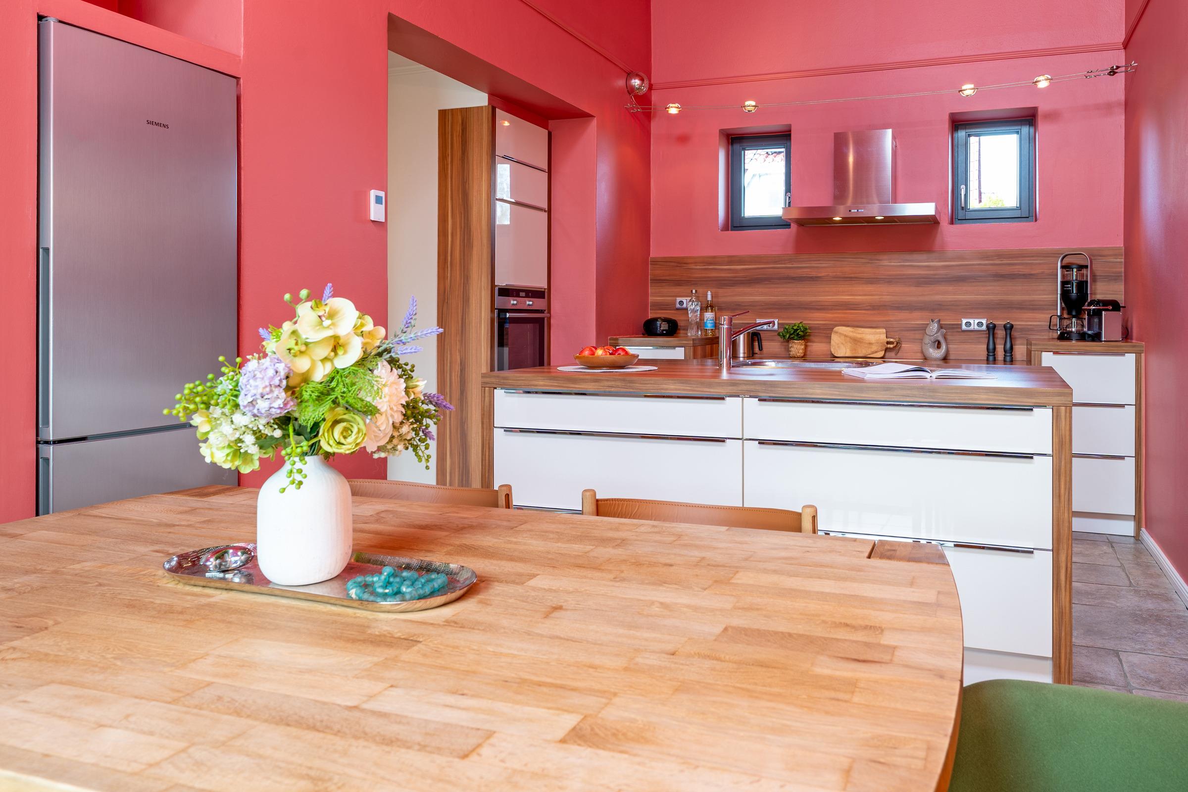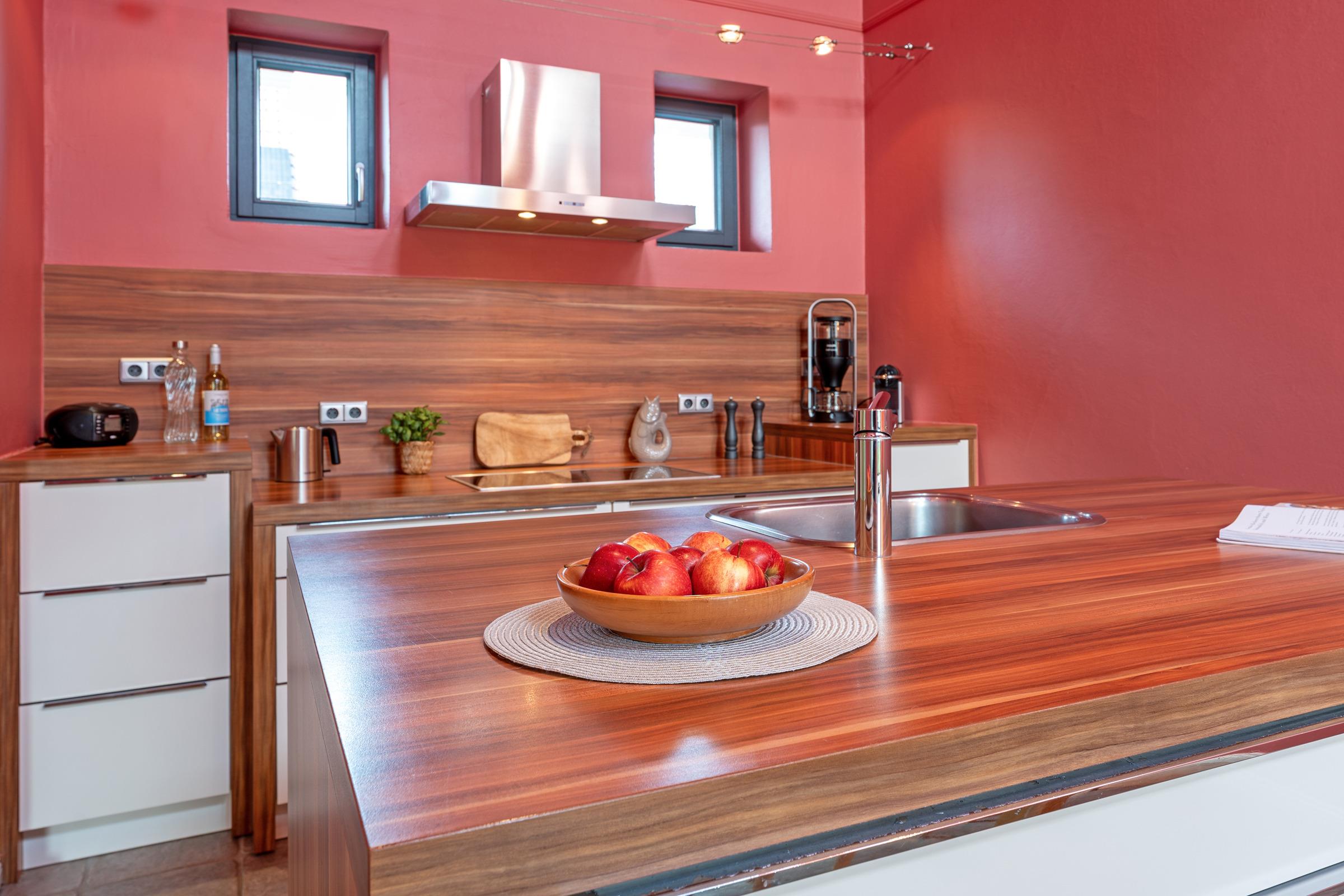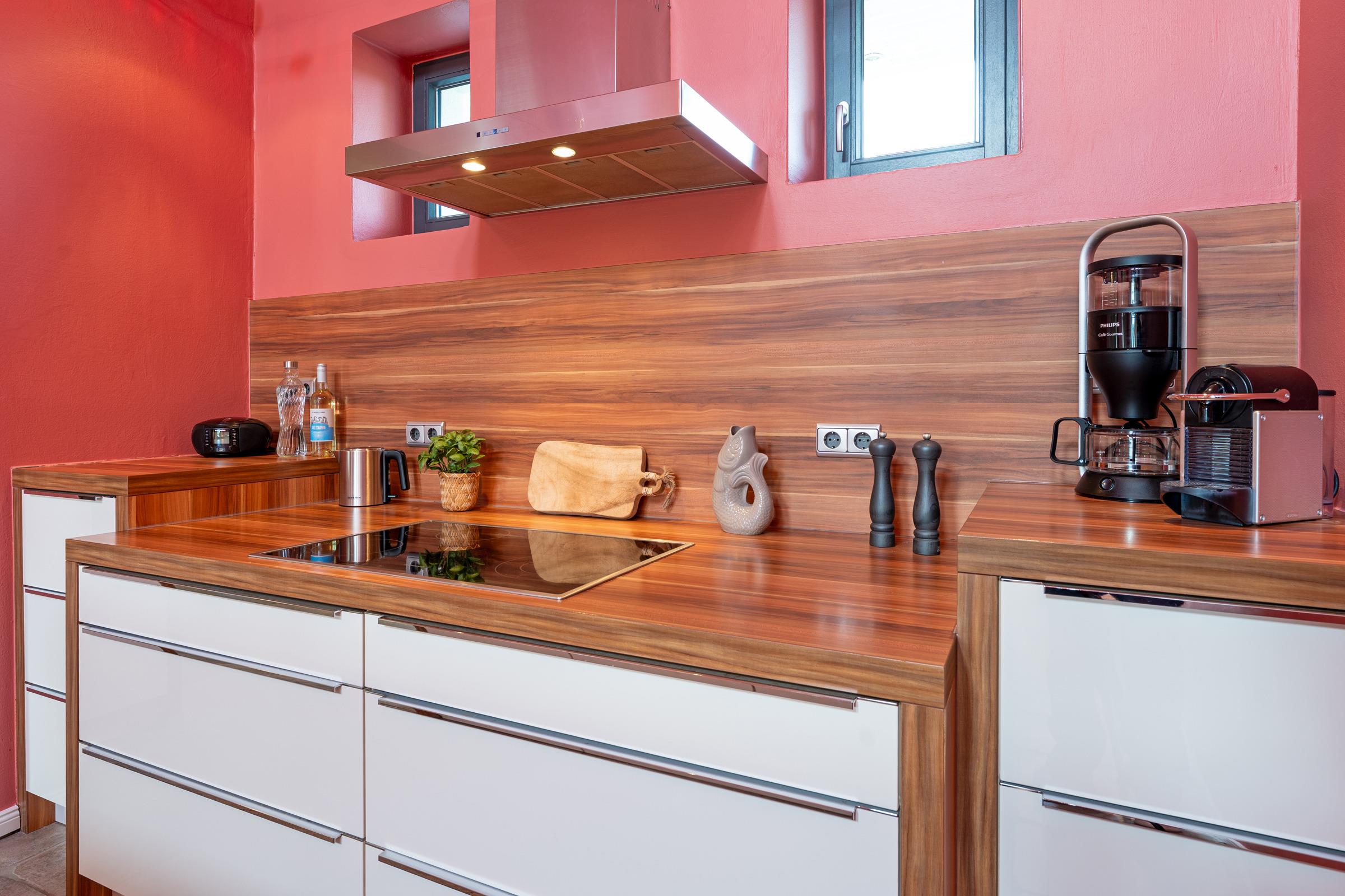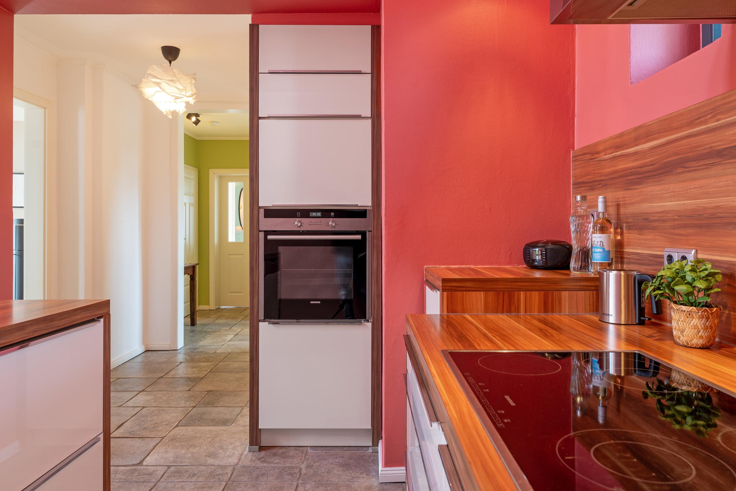 Die offene, voll ausgestattete Küche lässt keine Wünsche offen: Cerankochfeld, Backofen, Geschirrspülmaschine, Kühlschrank, Gefrierschrank, Mikrowelle, Kaffeemaschine und Kapselmaschine, Wasserkocher und Toaster stehen bereit.