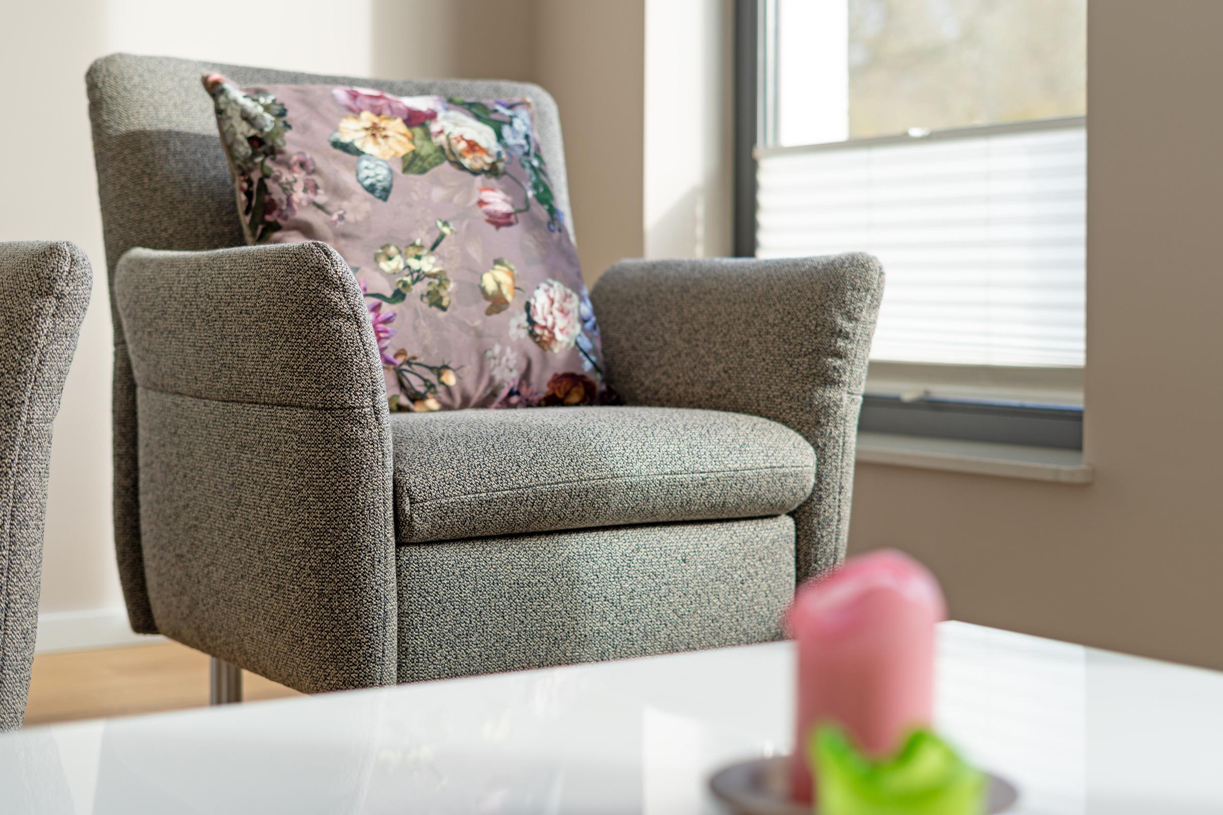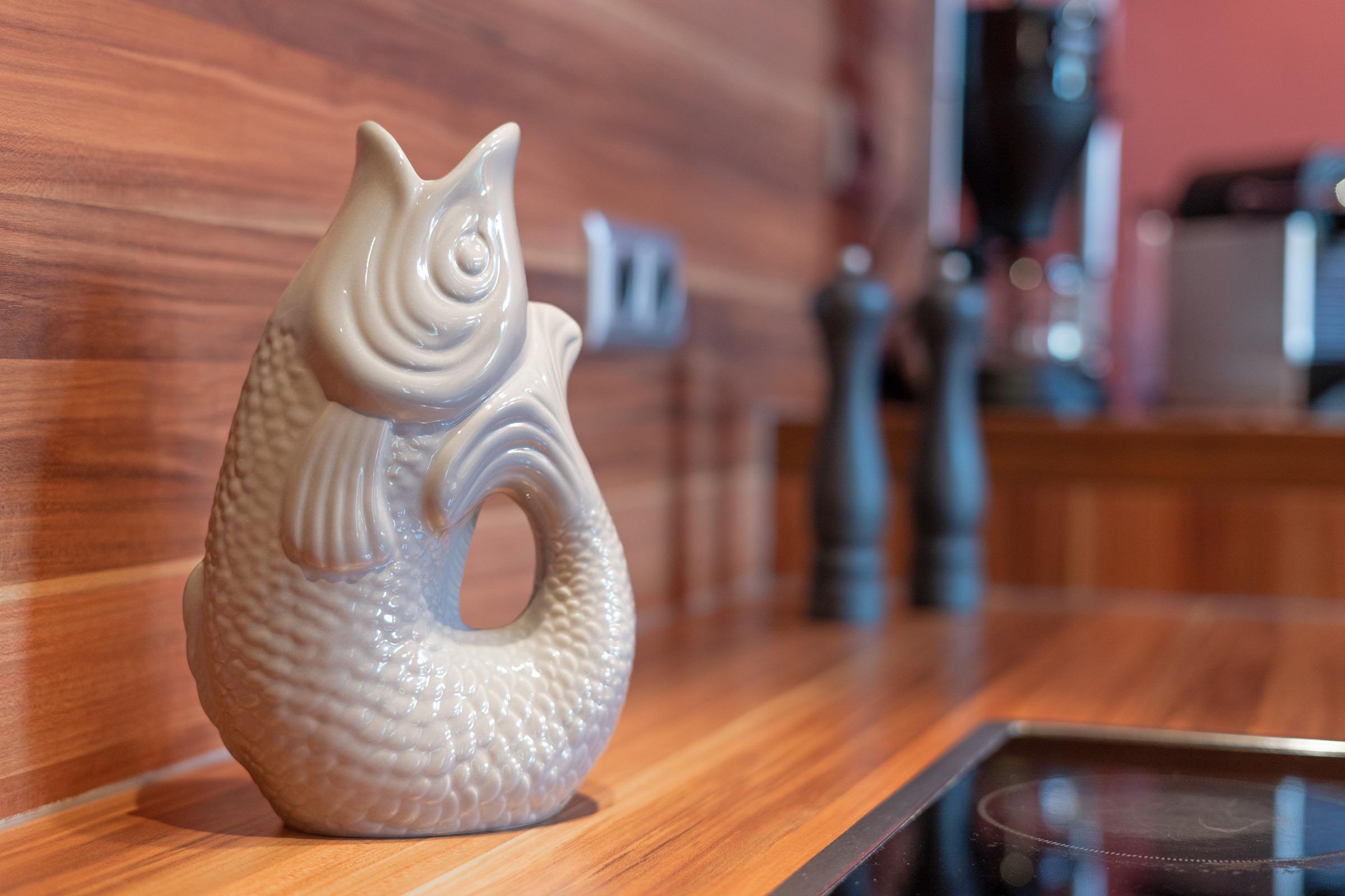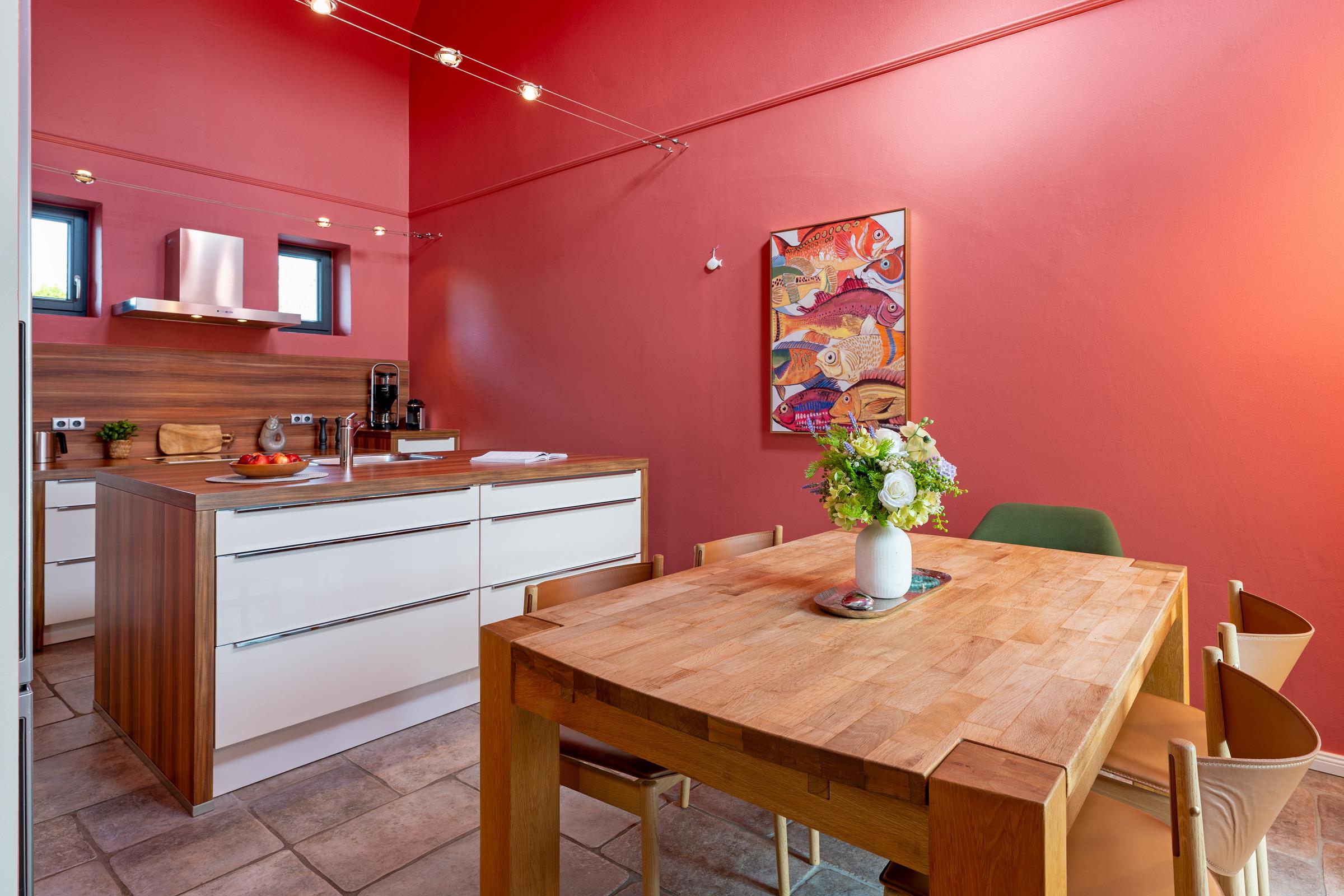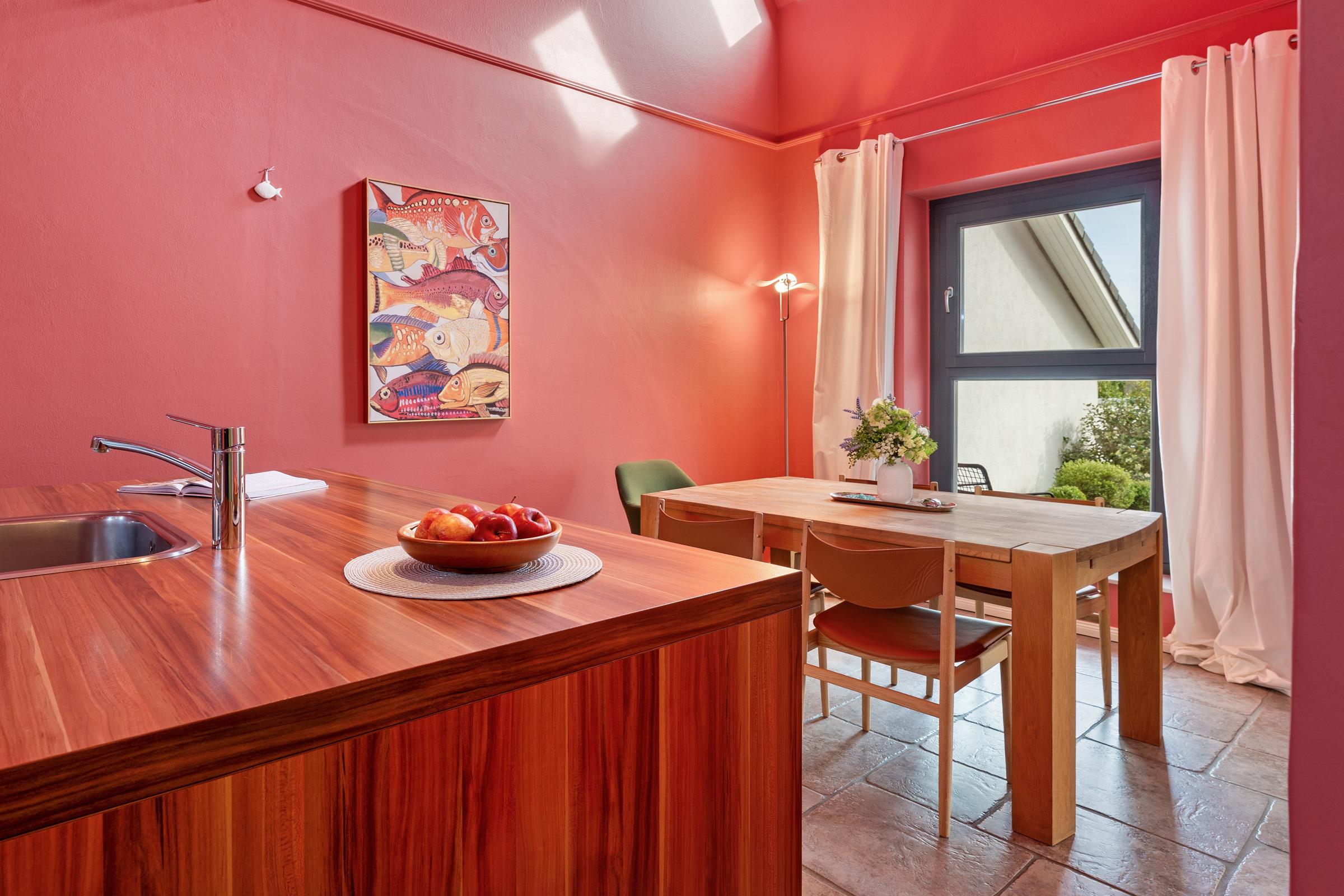 Die offene, voll ausgestattete Küche lässt keine Wünsche offen: Cerankochfeld, Backofen, Geschirrspülmaschine, Kühlschrank, Gefrierschrank, Mikrowelle, Kaffeemaschine und Kapselmaschine, Wasserkocher und Toaster stehen bereit.