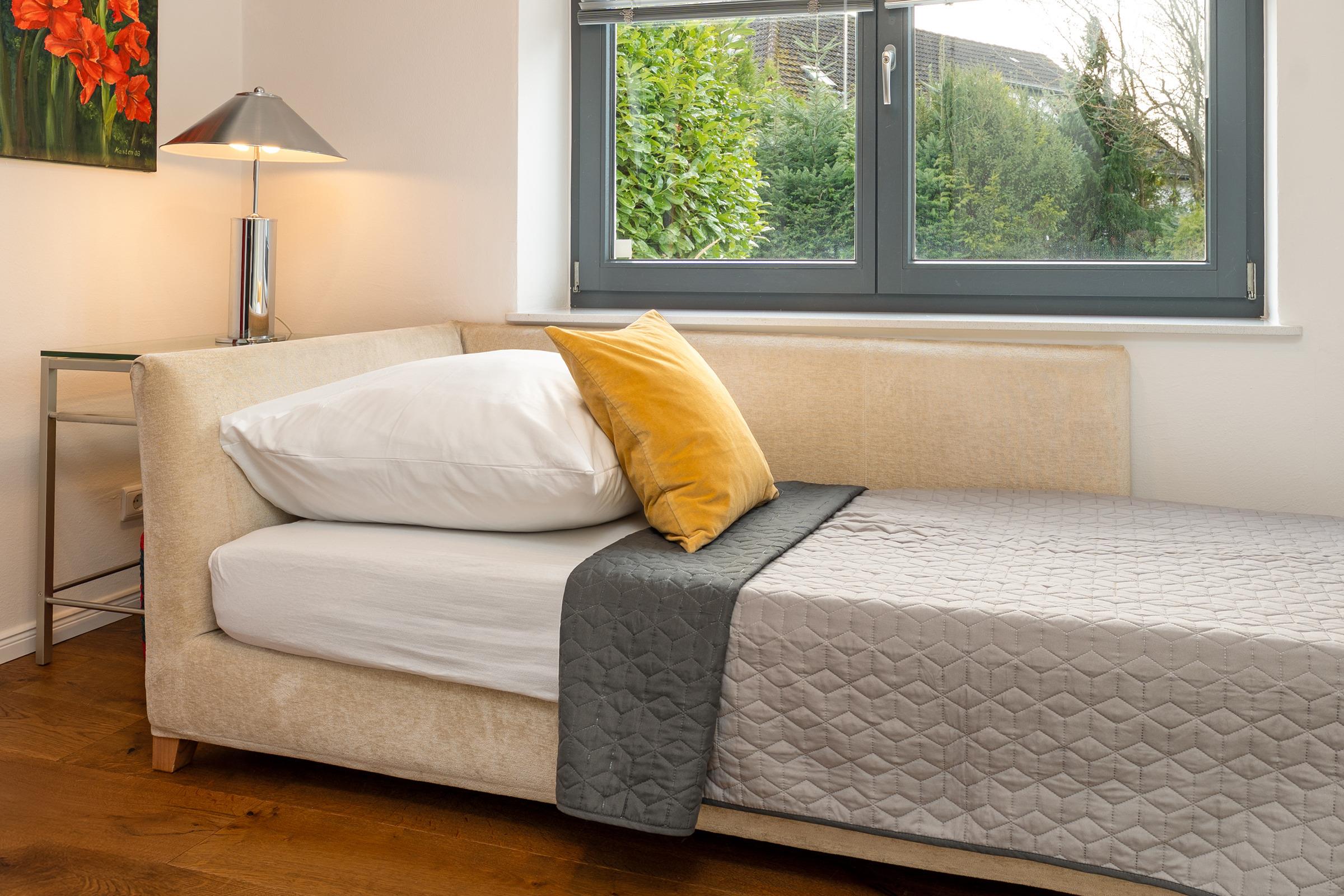 Schlafzimmer (EG): 1 Schlafsofa (80 x 190 cm), Kleiderschrank, Verdunkelung: Jalousie & Gardinen, kein Platz für ein Babybett vorhanden