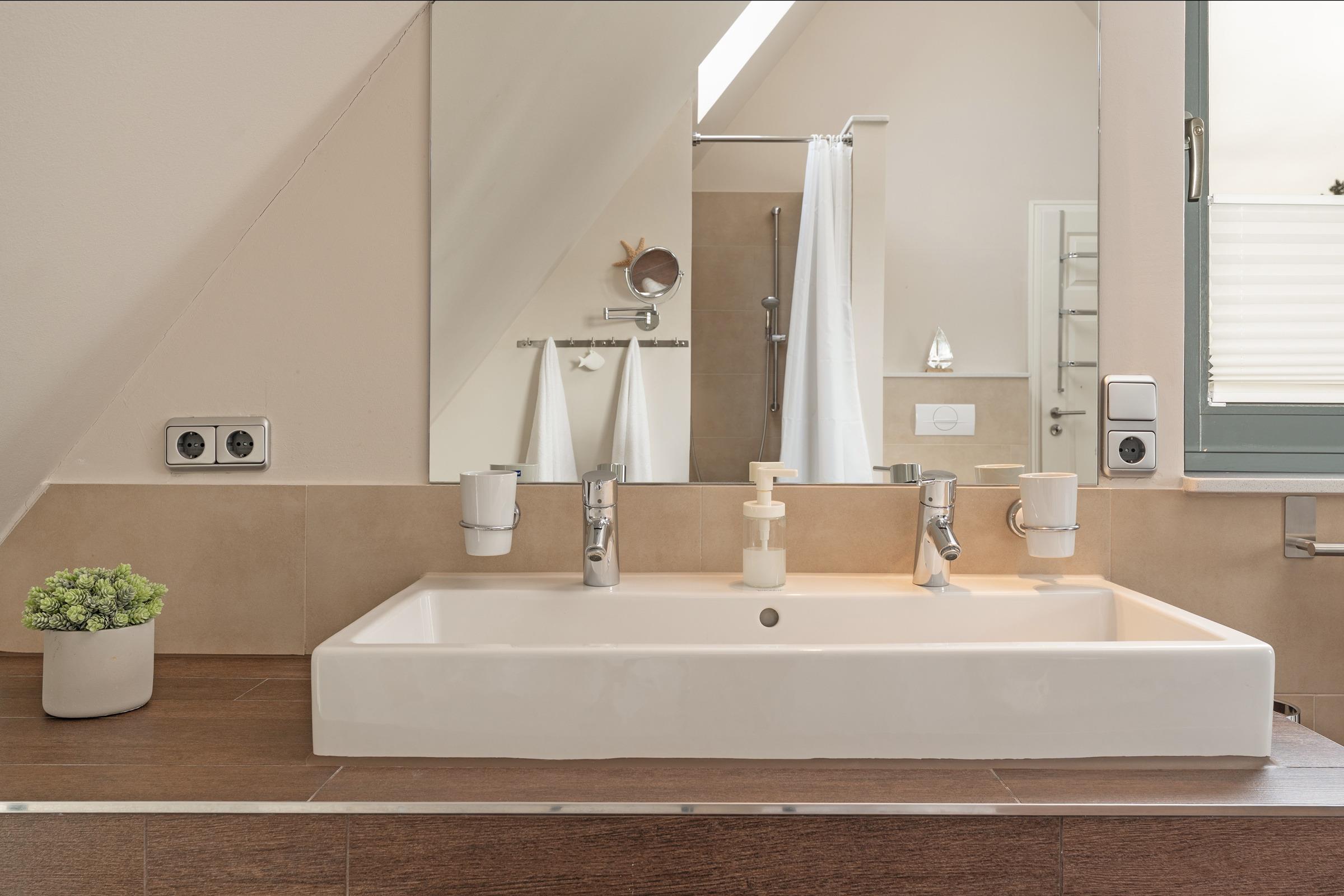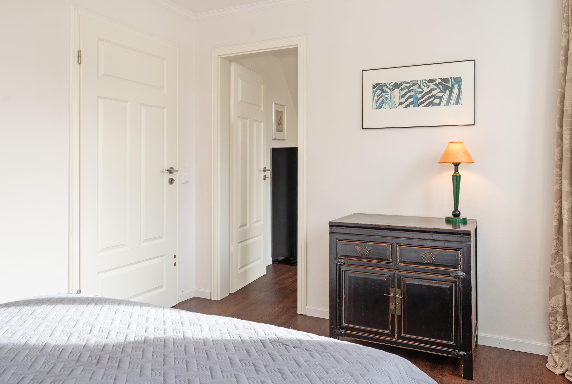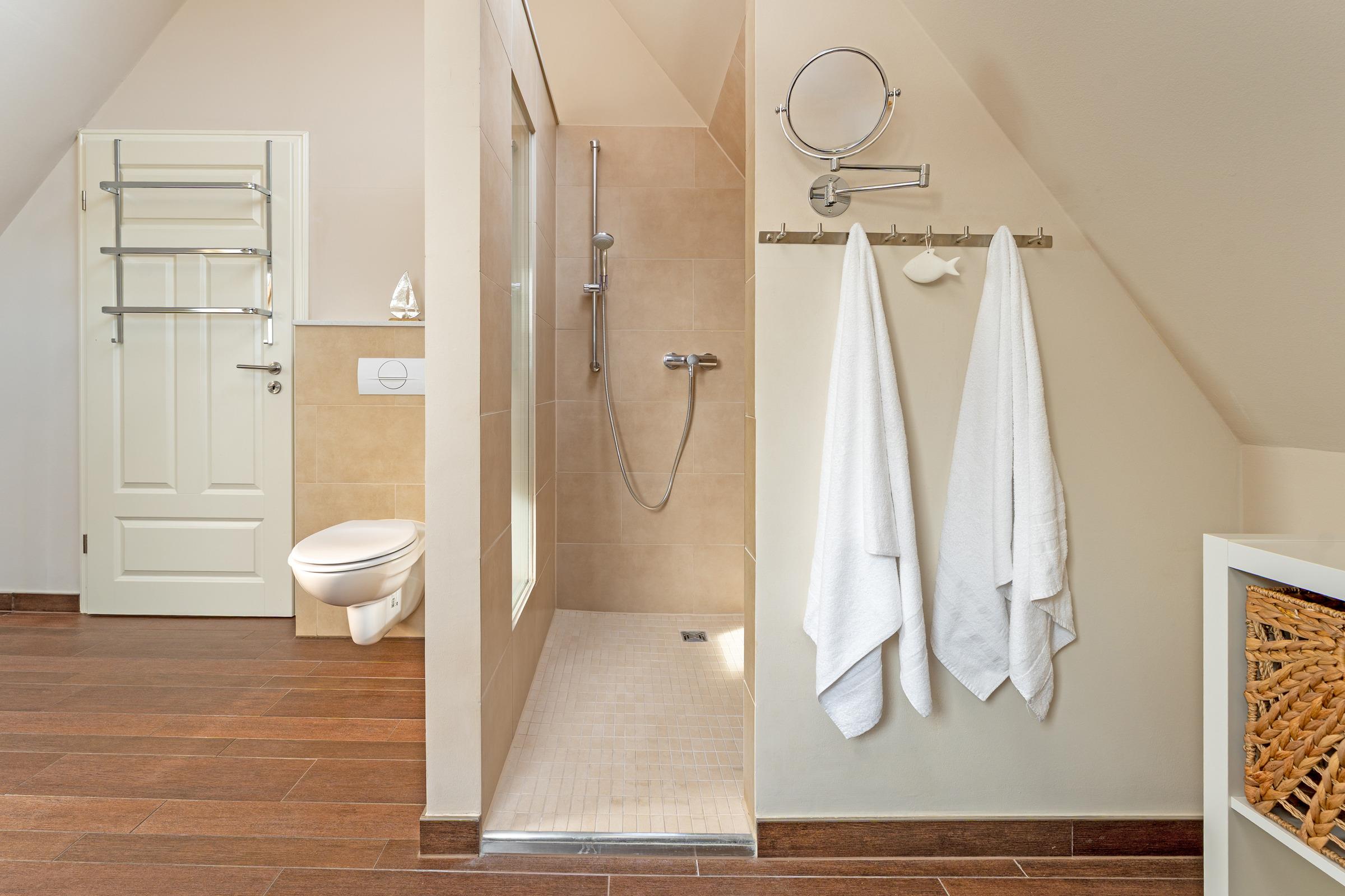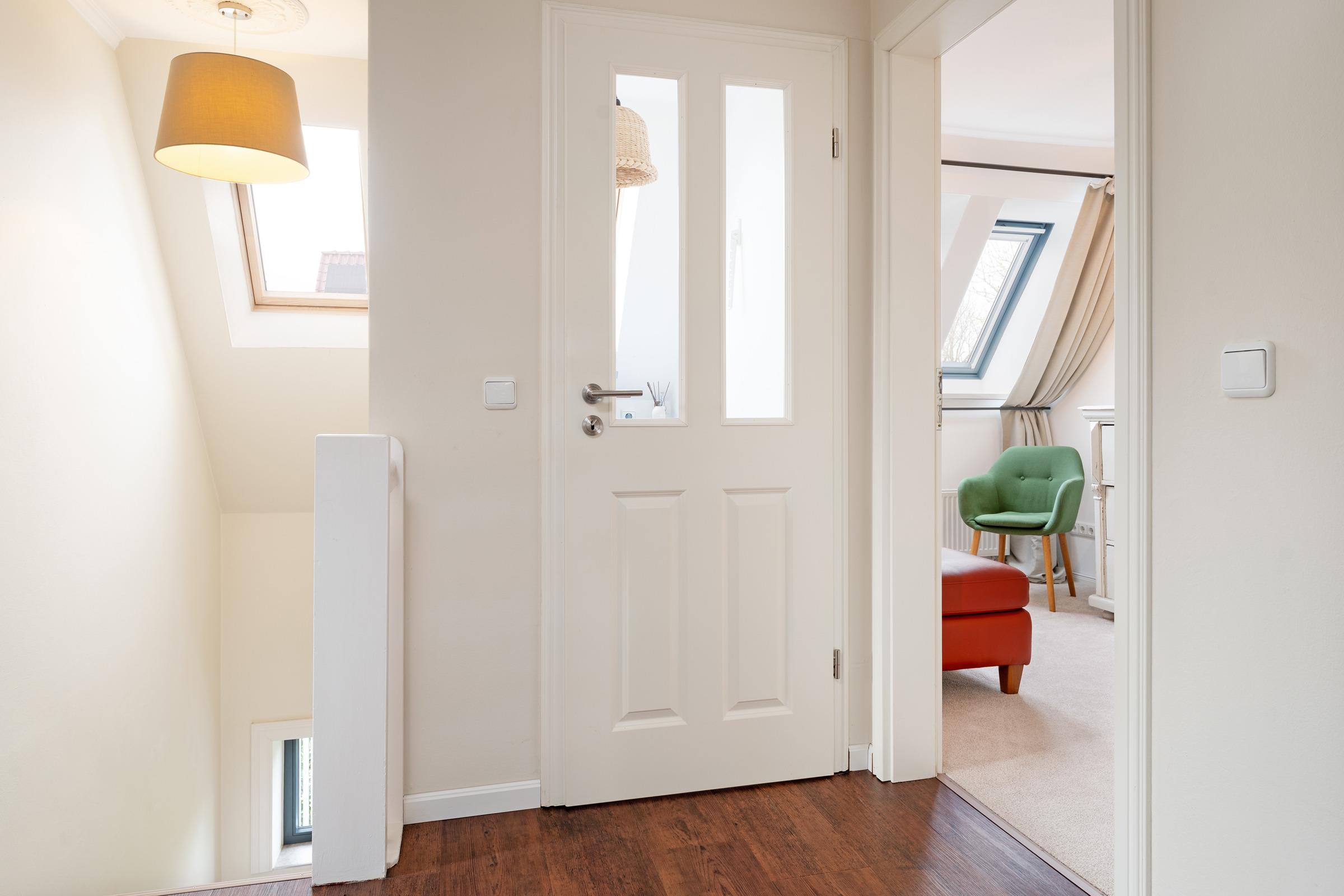Im Erdgeschoss befindet sich ein Schlafzimmer mit Schlafsofa (80 x 190 cm) sowie ein Gäste-WC. Über eine Wendeltreppe erreichen Sie das Obergeschoss mit zwei weiteren Schlafzimmern, jeweils ausgestattet mit Doppelbett. Zwei moderne Badezimmer sorgen für Komfort: ein Duschbad und ein weiteres Bad mit bodengleicher Dusche und Badewanne. Fußbodenheizung, Verdunklungsmöglichkeiten, Waschmaschine und WLAN runden die Ausstattung ab.