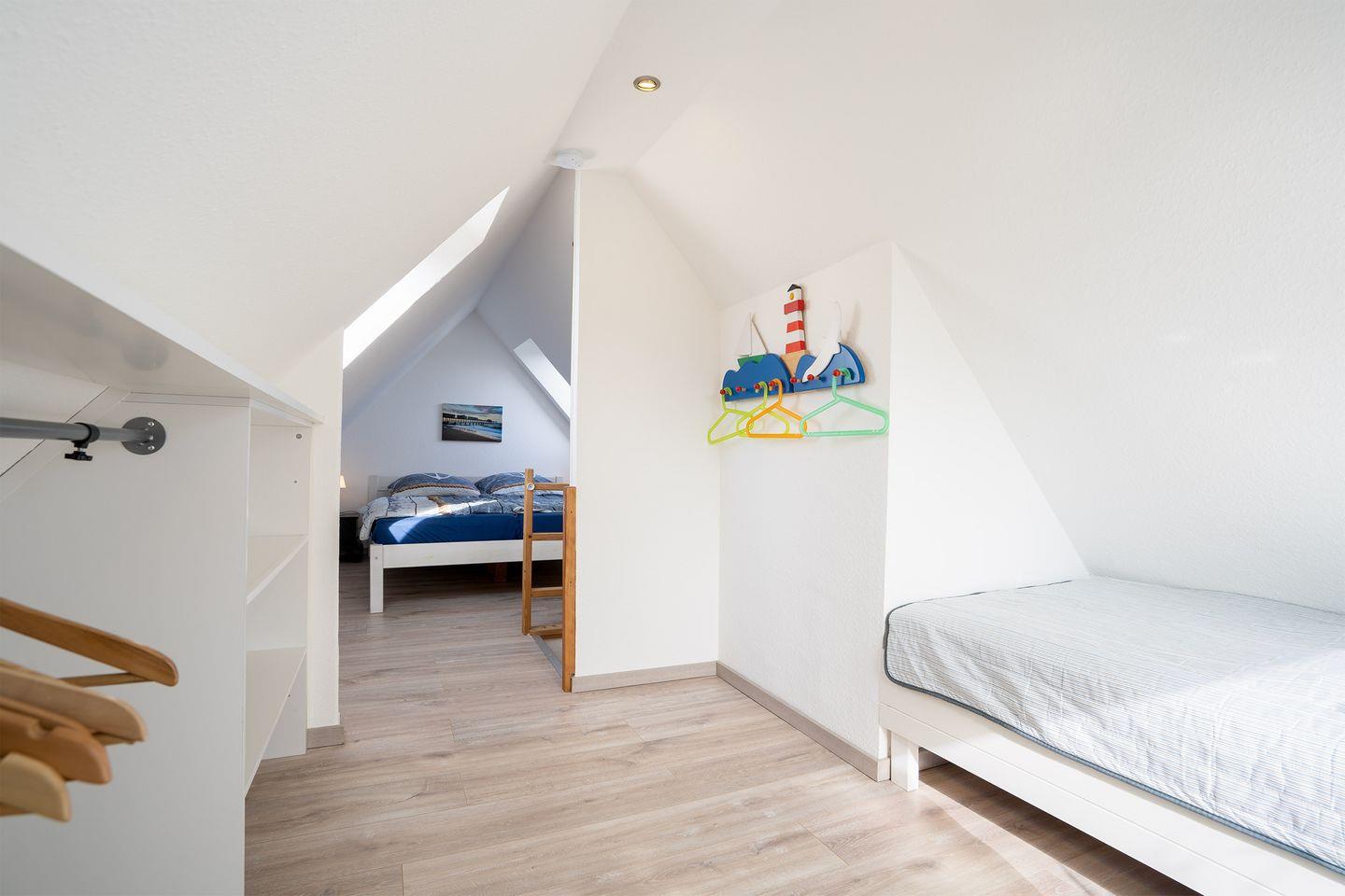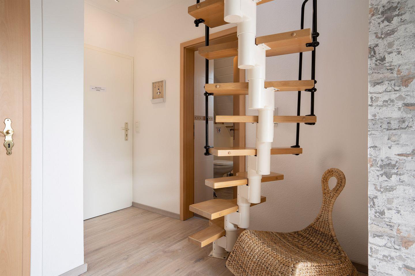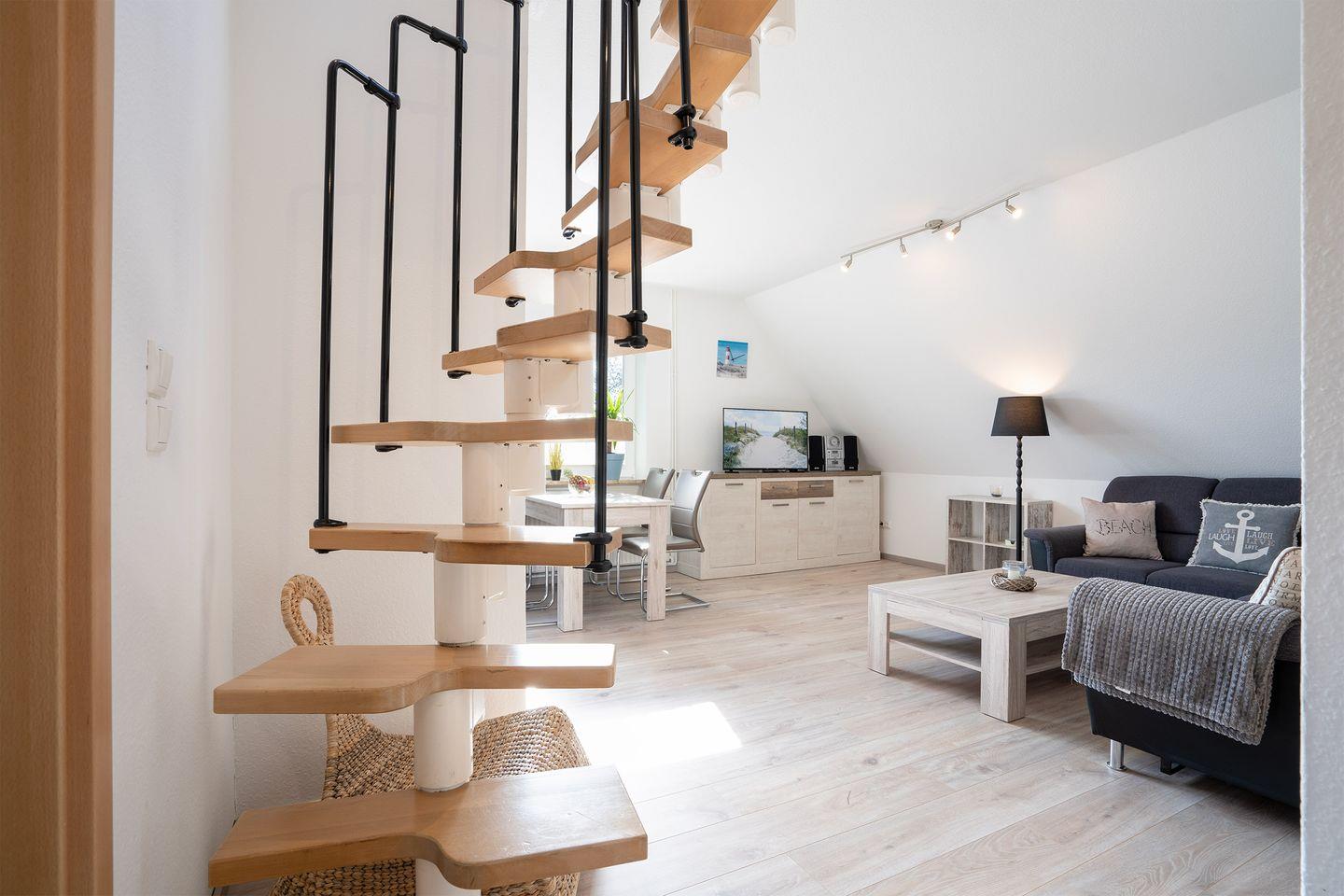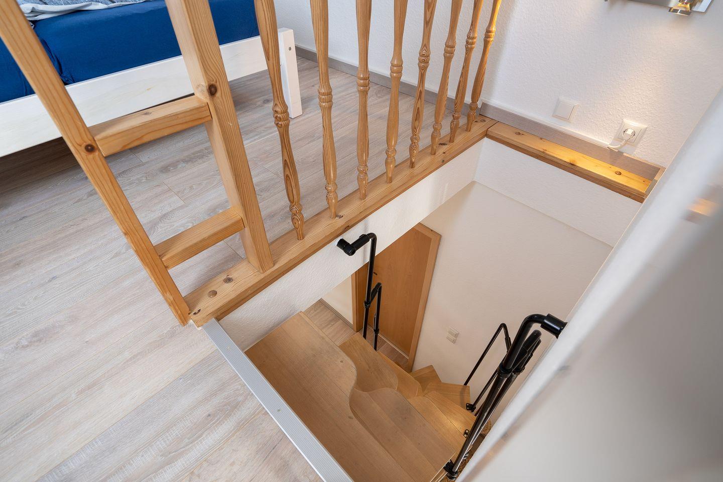 Bitte beachten Sie, die Wohnung liegt in der ersten Etage (kein Aufzug), die Treppe zur offenen zweiten Schlafebene ist steil und nicht für kleine Kinder gesichert.