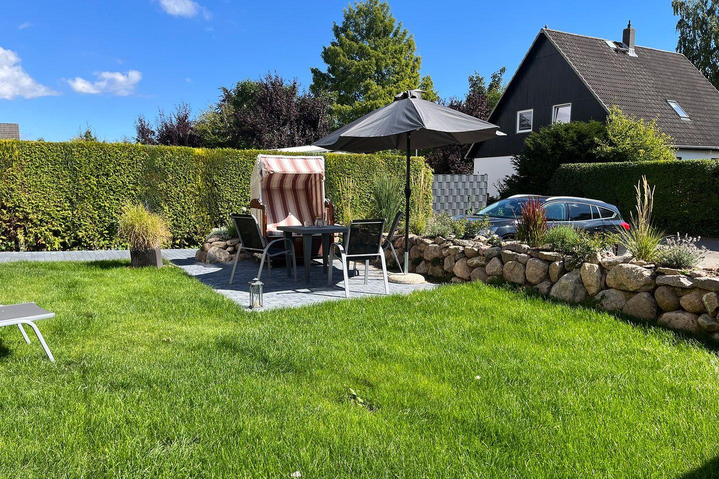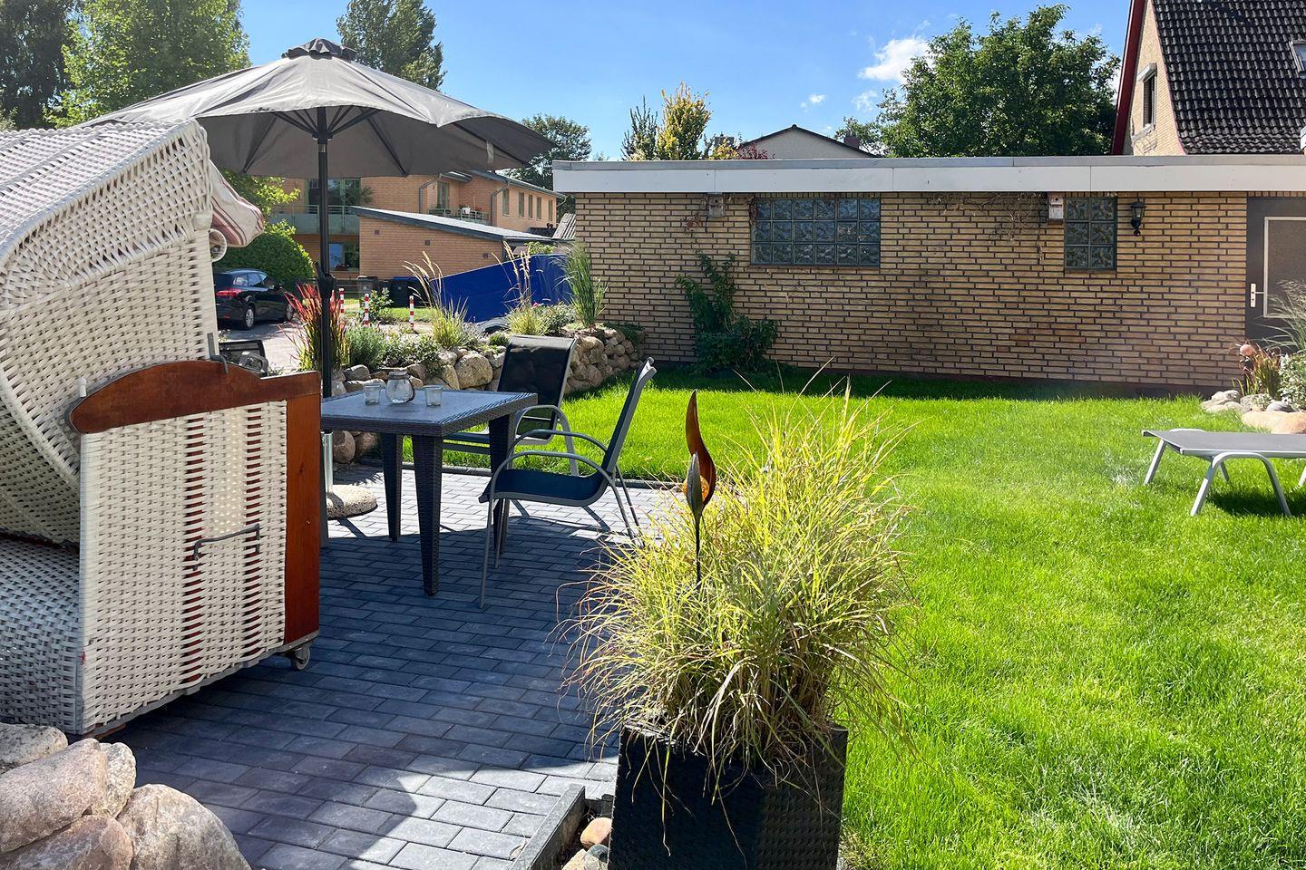 Bei schönem Wetter steht Ihnen eine Trasse mit Strandkorb und Tischen sowie Stühlen zur Verfügung.