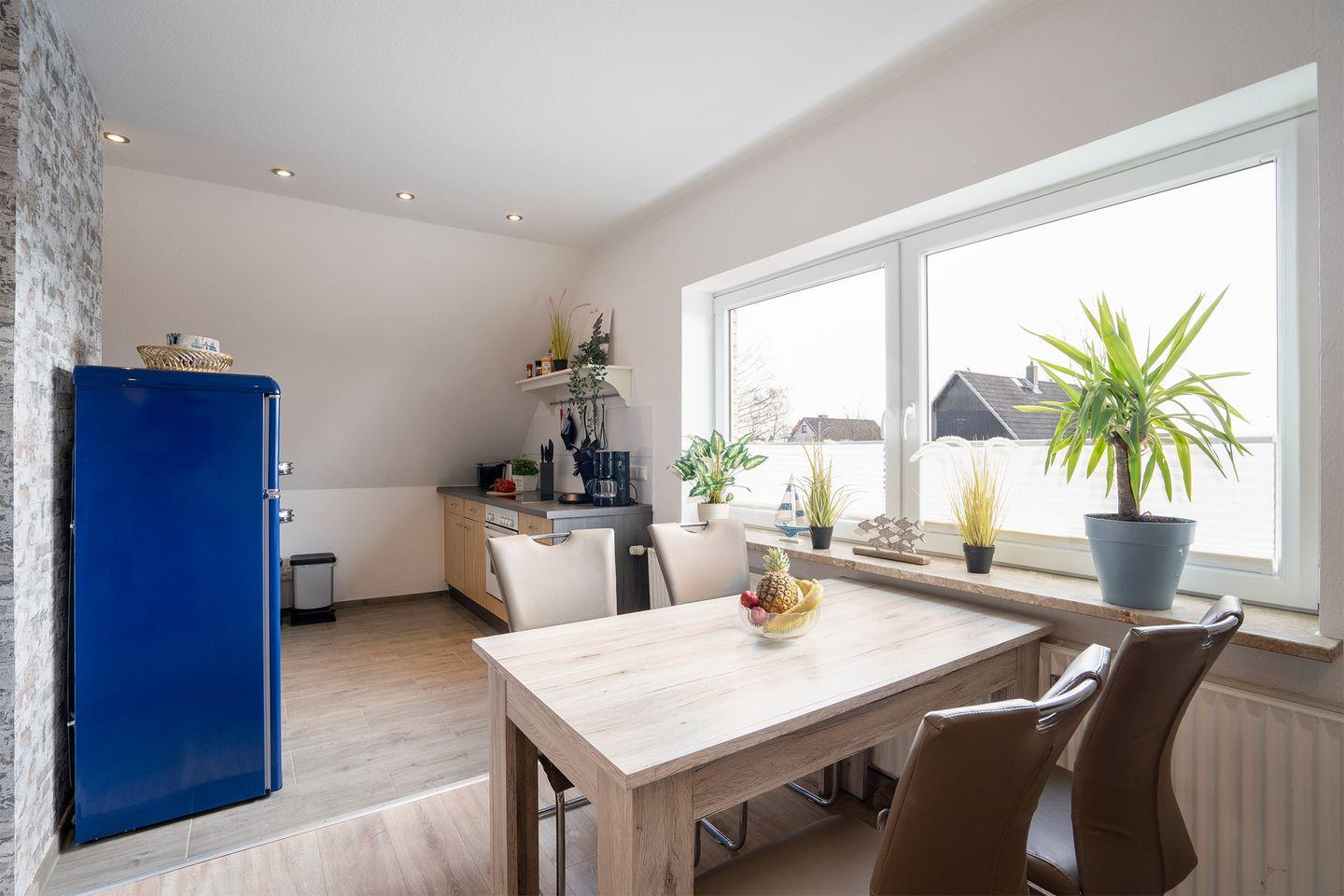 Mit viel Liebe haben wir unsere Ferienwohnungen neugestaltet. In Ferienwohnung 2 haben bis zu 4 Gäste Platz. Die Wohnung befindet sich im ersten Obergeschoss und verfügt über ein Duschbad, ein abgeschlossenes Schlafzimmer (Doppelbett 1,60x2,00m) und eine offene Wohnküche. Über eine schmale Wendeltreppe gelangt man auf die zweite Schlafebene. Hier befindet sich ein Doppelbett (1,60 x 2,00m) und ein Einzelbett und offene Kleiderschränke. Die vollausgestattete Küche mit Spülmaschine, Kaffeemaschine, Senso, Mikrowelle, Herd, Backofen, großem Kühlschrank mit Tiefkühlfach und vielem mehr, lädt zum Verweilen ein. Ein Stellplatz direkt vor dem Haus steht den Gästen kostenfrei zur Verfügung. Sollten Sie mit zwei PKW anreisen, so können Sie in Absprache einen weiteren Parkplatz direkt vor dem Haus ebenso kostenfrei nutzen. Die Wohnung ist eine Nichtraucherwohnung und Haustiere sind nicht erlaubt. Sie verfügt über ein TV Gerät, W-LAN, Einkaufsmöglichkeiten unter 100m, Bahnhof 800m.