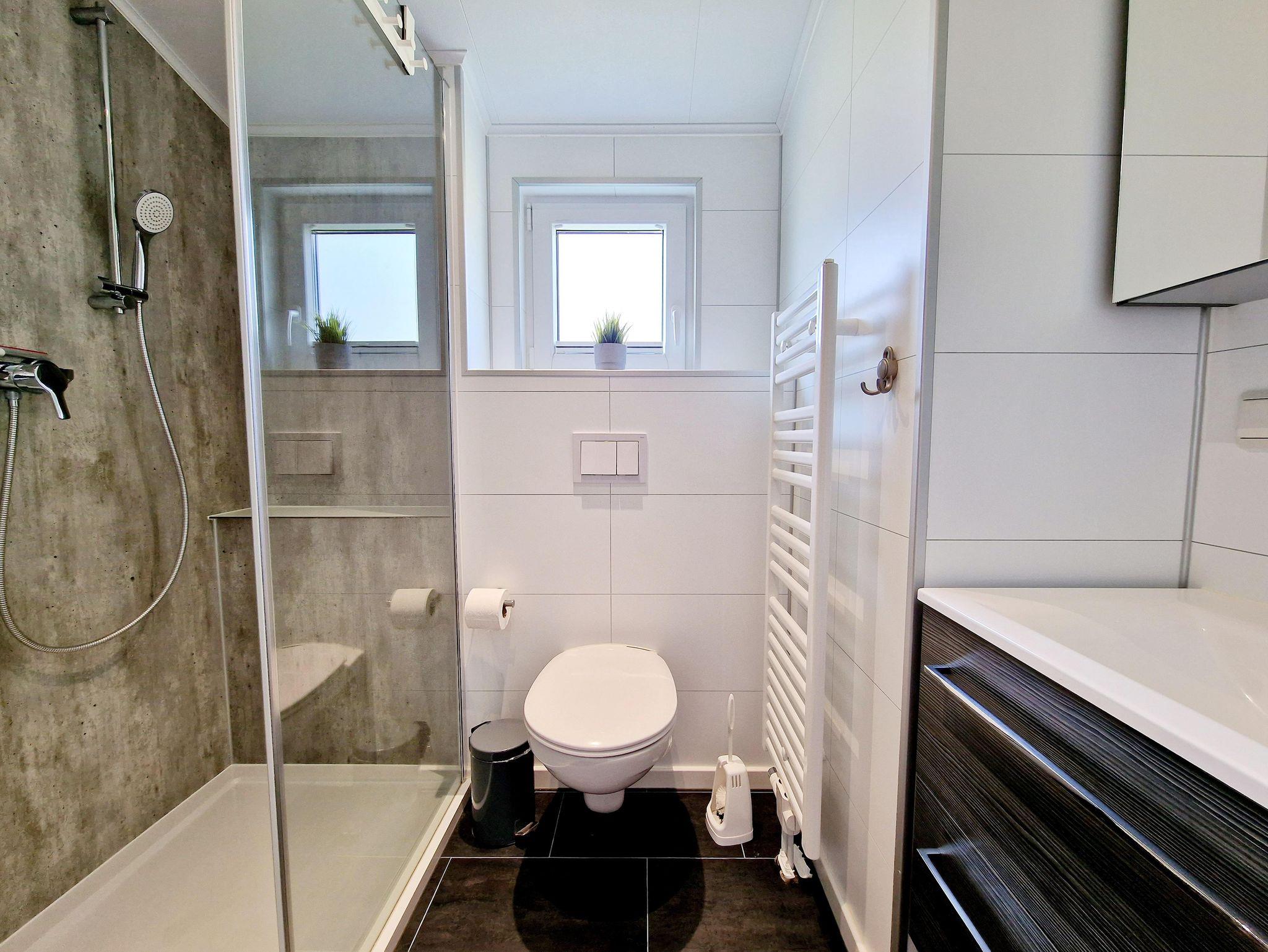 - Bad: bodenebene Dusche, Handtuchheizung, Waschtisch, Spiegelschrank, WC