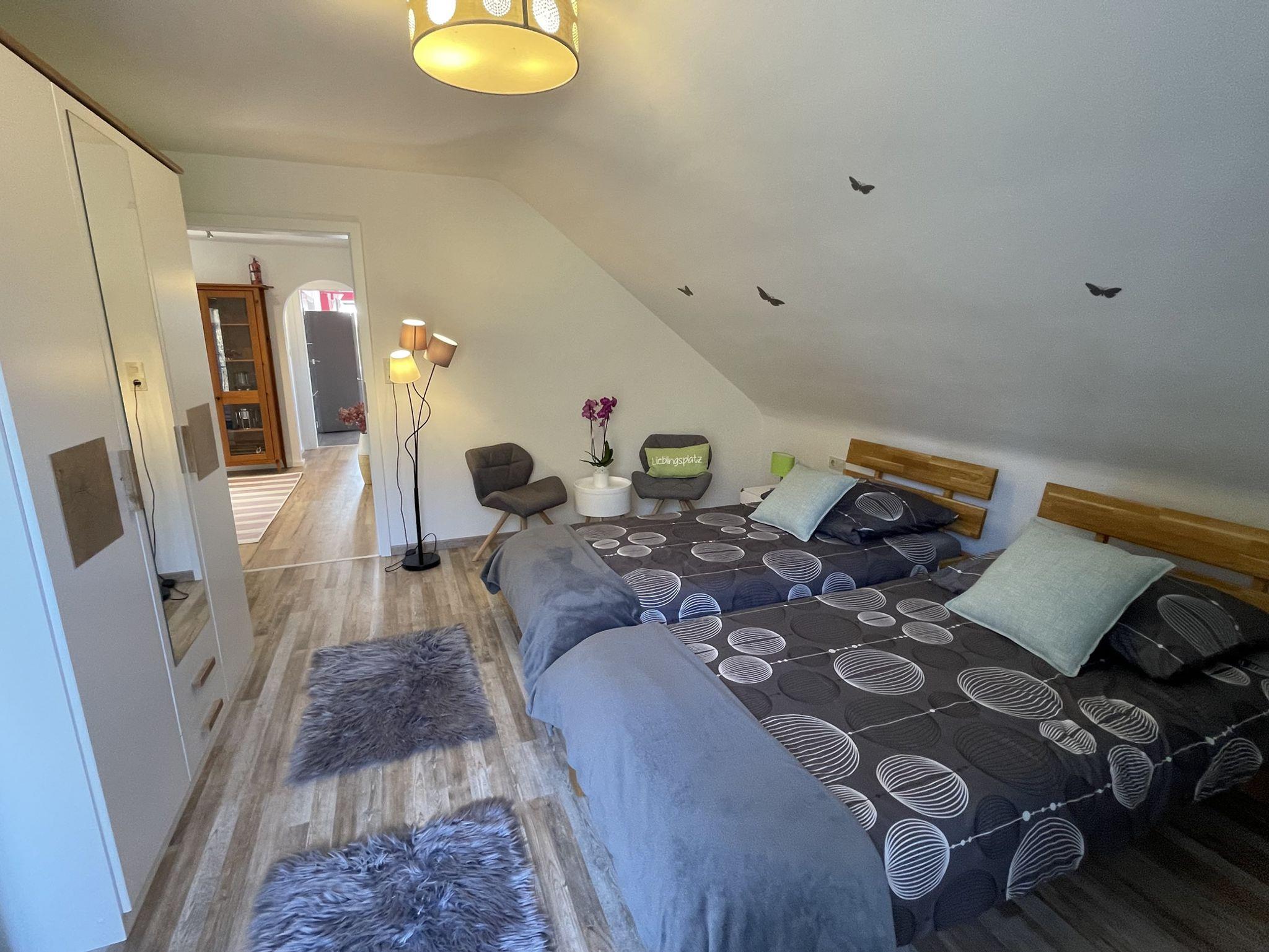 Wir bieten Ihnen eine Ferienwohnung für 2 Erwachsene im Doppelbett (180x200cm) und 1 Einzelbetten (90x200cm). Es steht weiterhin eine gemütliche Couch im Wohnzimmer zur Verfügung. Weitere Schlafmöglichkeiten vorhanden!