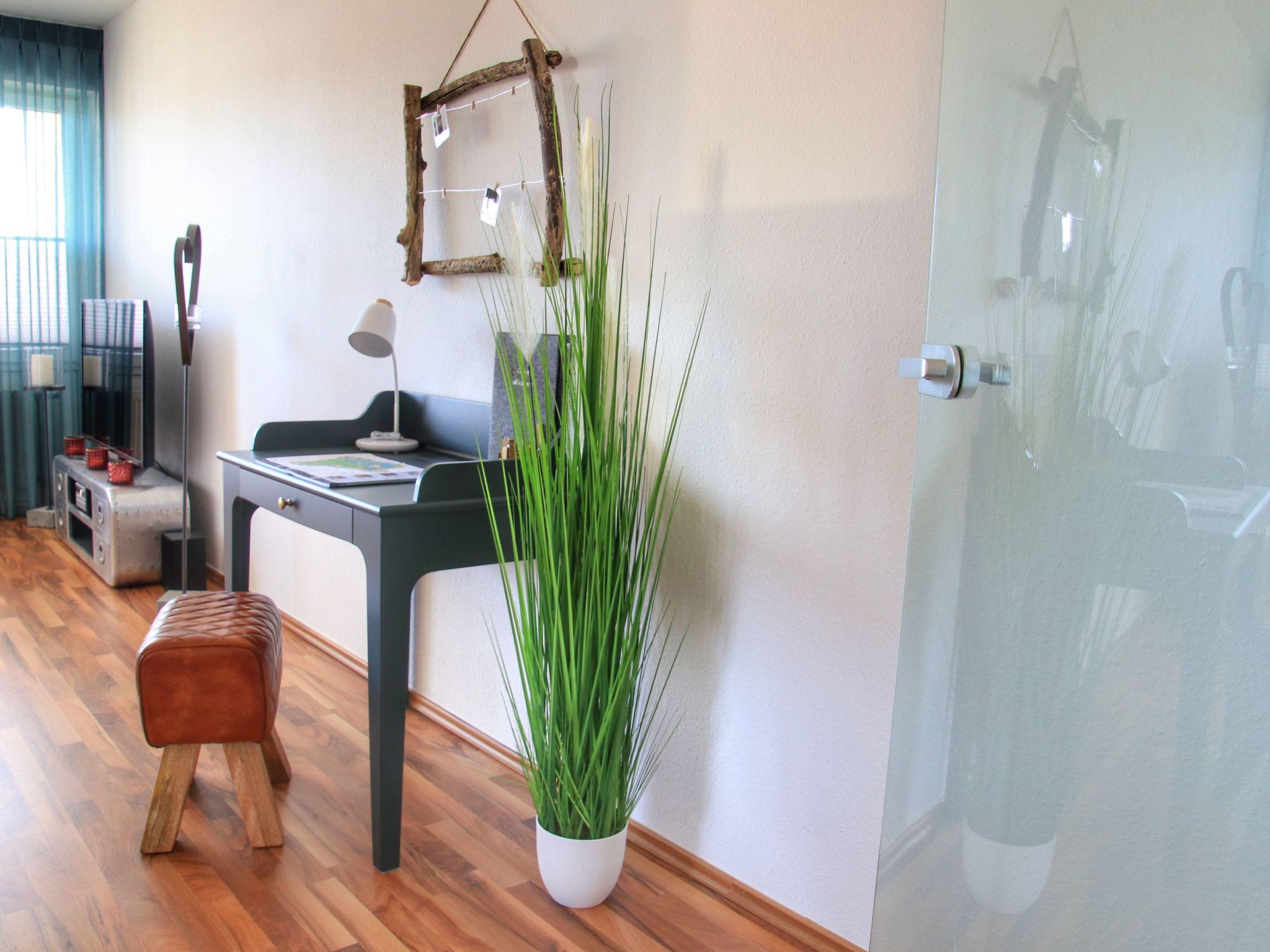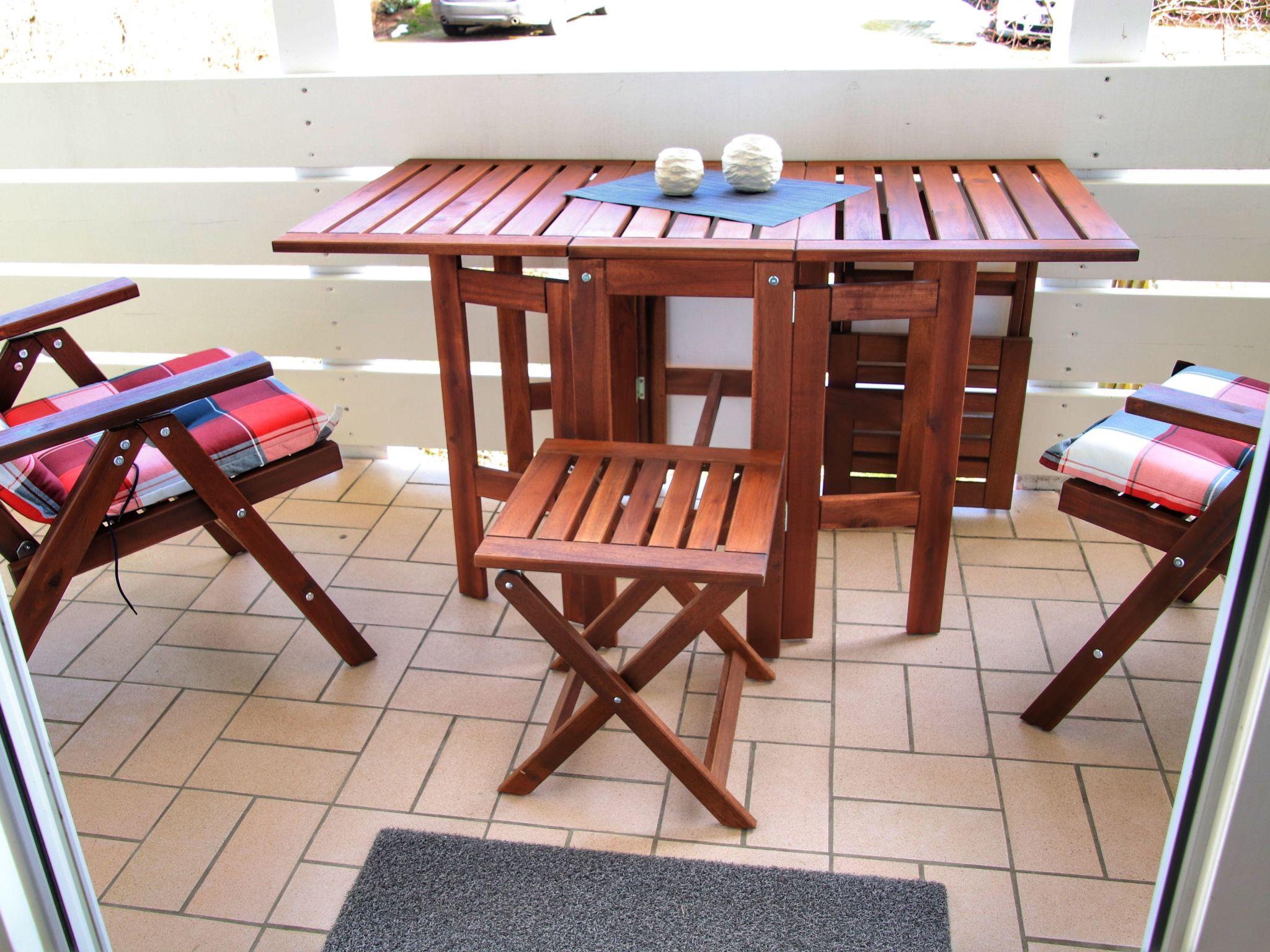 Das separate Schlafzimmer verfügt über ein Doppelbett und eine Kommode. Ein weiterer Schrank für Kleidung steht in der Wohnung bereit. Das großzügige Wohnzimmer verfügt über eine Schlafcouch, auf der max. 2 weitere Personen übernachten können. Über das Wohnzimmer gelangen Sie auf einen Balkon, welcher mit Tisch und Stühlen für max. 4 Personen ausgestattet ist.Zusätzlich verfügt die Wohnung über einen abgetrennten Essbereich mit 4 Sitzplätzen. Eine Single-Küche ist im Flurbereich integriert. Die Küche ist voll ausgestattet und verfügt über zwei Ceranfeld Kochplatten, Mikrowelle, Kühlschrank, Toaster, Wasserkocher und einen Kaffeevollautomaten.Im Badezimmer befindet sich eine Dusche und WC. Stauraum für Ihre Badutensilien bietet ein Spiegelschrank und ein weiteres Schränkchen. Schminkspiegel und Föhn runden das Angebot im Bad ab. Die Handtücher und Bettwäsche werden Ihnen entsprechend der Belegung pro Person gestellt.Weiterhin ist die Wohnung ausgestattet mit einem Wäscheständer, Bügelbrett und Bügeleisen. Sollten Sie Wäsche waschen wollen, können Sie im Gemeinschaftskeller eine Waschmaschine mit Münzeinwurf problemlos nutzen.