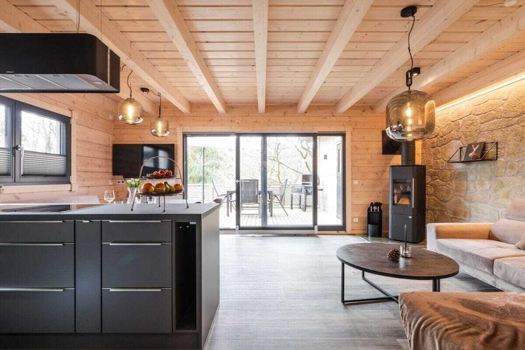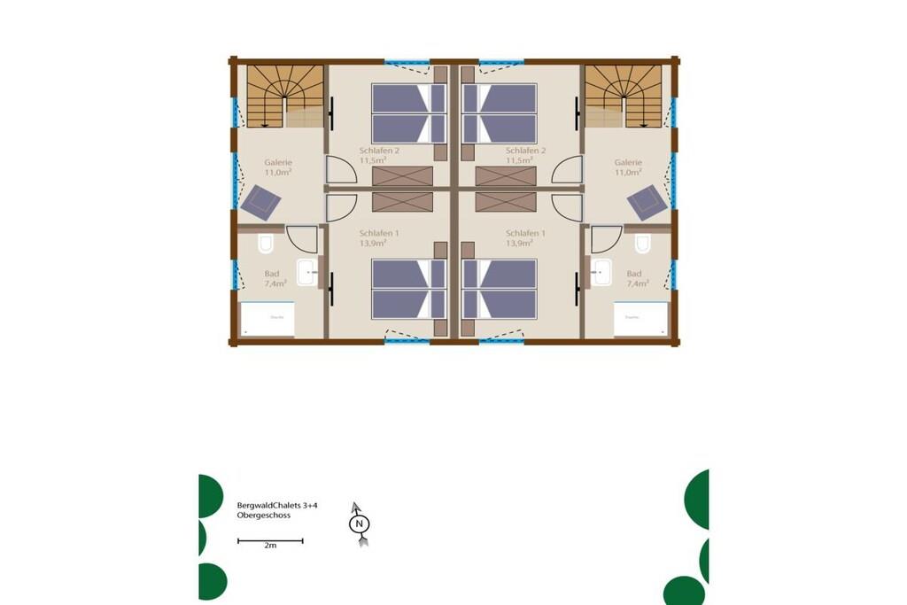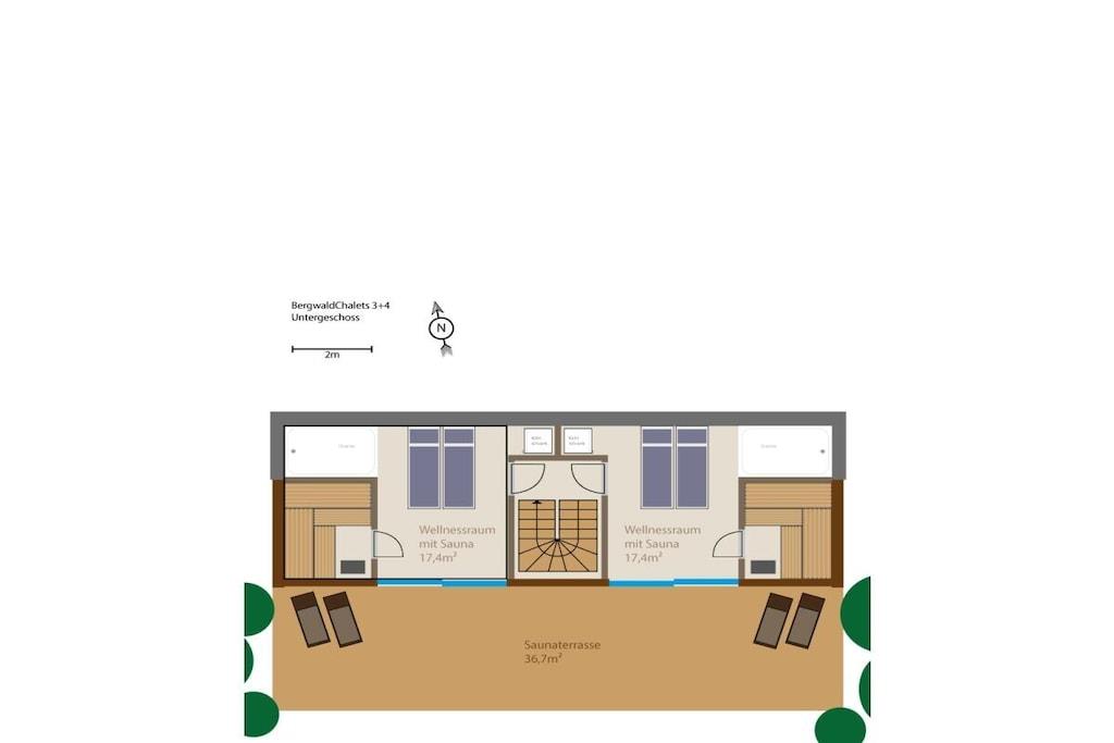 Unsere vier Bergwaldchalets Wellness bieten viel Platz für bis zu fünf Personen. Sollte die "5" zu Ihrem Wunschtermin belegt sein, finden Sie hier noch drei weitere. Vom Flur aus gelangt man über eine breite Massivholz-Treppe in das Obergeschoss. Im Erdgeschoss befinden sich der Wohn-/Essbereich mit Kaminofen, eine großzügige top ausgestattete Insel-Küche und ein Duschbad Im Obergeschoss sind zwei Schlafzimmer mit superbequemen Boxspringbetten, großen Schwebetürenschränken, ein SmartTV und Soundbar, das große Duschbad mit Walk-In-Dusche sowie eine Galerie mit einem Schlafsessel Unter den Terrassen wartet auf Sie ein Wellnessbereich mit Ruheraum, einer weiteren Dusche, Kühlschrank Bose-Soundsystem und einer weiteren möblierten Terrasse. Jedes Chalet verfügt über eine eigene Ladesäule /Walbox