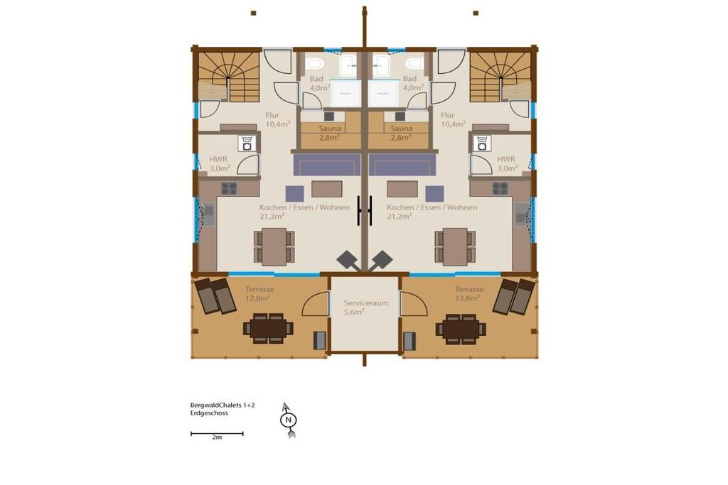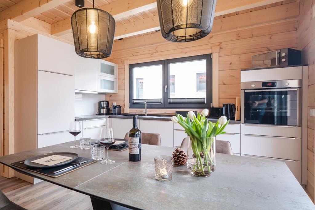 Unsere zwei Bergwaldchalets Komfort bieten viel Platz für bis zu fünf Personen. Vom Flur aus gelangt man über eine breite Massivholz-Treppe in das Obergeschoss. Im Erdgeschoss befinden sich der Wohn-/Essbereich mit Kaminofen, eine großzügige top ausgestattete L-Küche und ein Duschbad mit integrierter finnischer Blockhaussauna Im Obergeschoss sind zwei Schlafzimmer mit superbequemen Boxspringbetten, großen Schwebetürenschränken, ein SmartTV und Soundbar, das große Duschbad mit großer GladDusche sowie eine Galerie mit einem Schlafsessel Jedes Chalet hat eine eigene E- Ladesäulle/Walbox