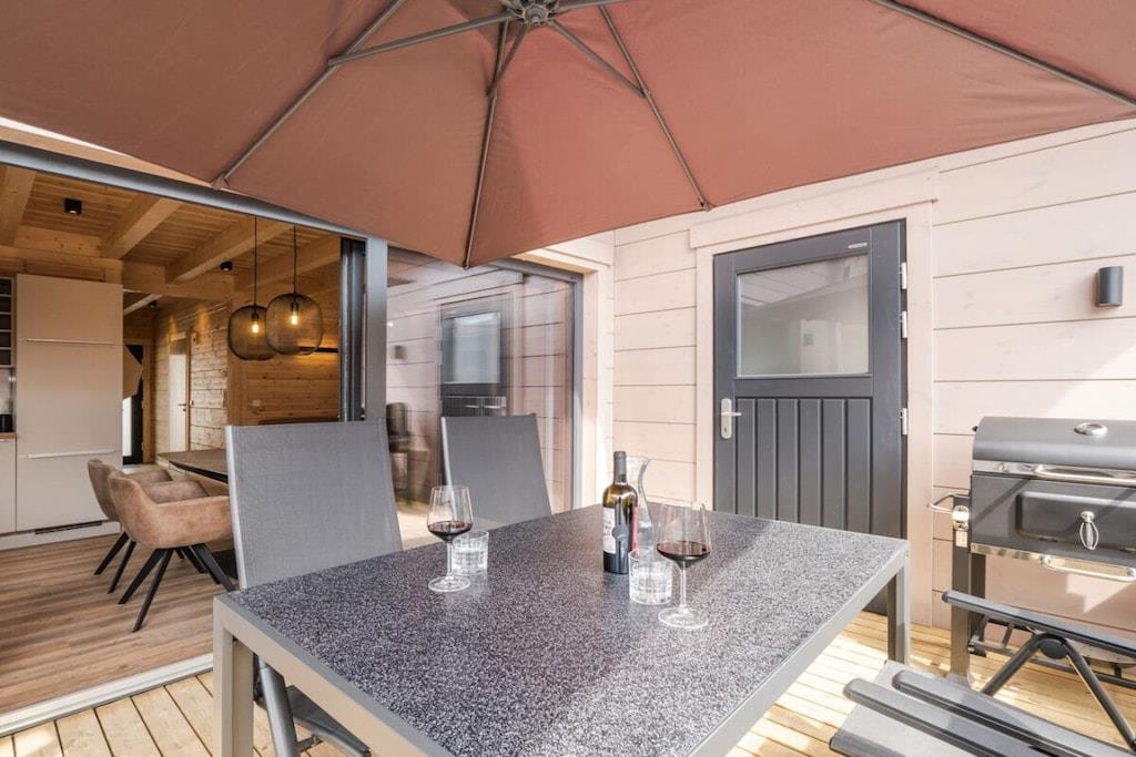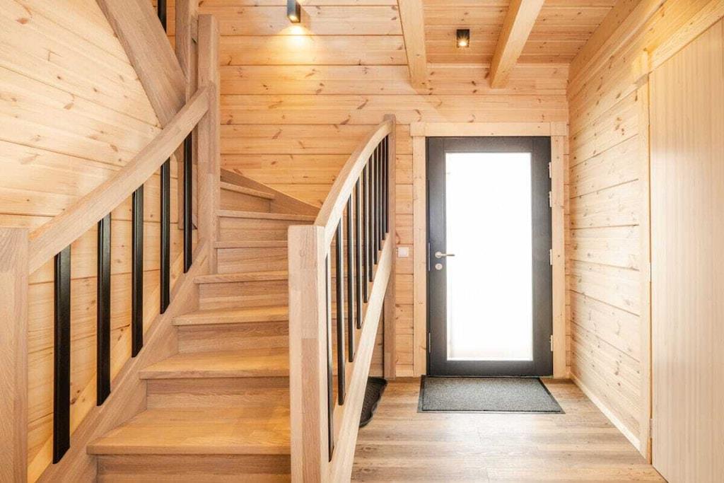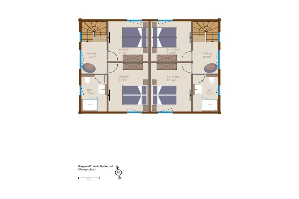 Vom Flur aus gelangt man über eine breite Massivholz-Treppe in das Obergeschoss. Im Erdgeschoss befinden sich der Wohn-/Essbereich mit Kaminofen, eine großzügige top ausgestattete L-Küche und ein Duschbad mit integrierter finnischer Blockhaussauna Im Obergeschoss sind zwei Schlafzimmer mit superbequemen Boxspringbetten, großen Schwebetürenschränken, ein SmartTV und Soundbar, das große Duschbad mit großer GladDusche sowie eine Galerie mit ausreichend Platz z.B. auch für den "besten Freund Jedes Chalet hat eine eigene E- Ladesäulle/Walbox