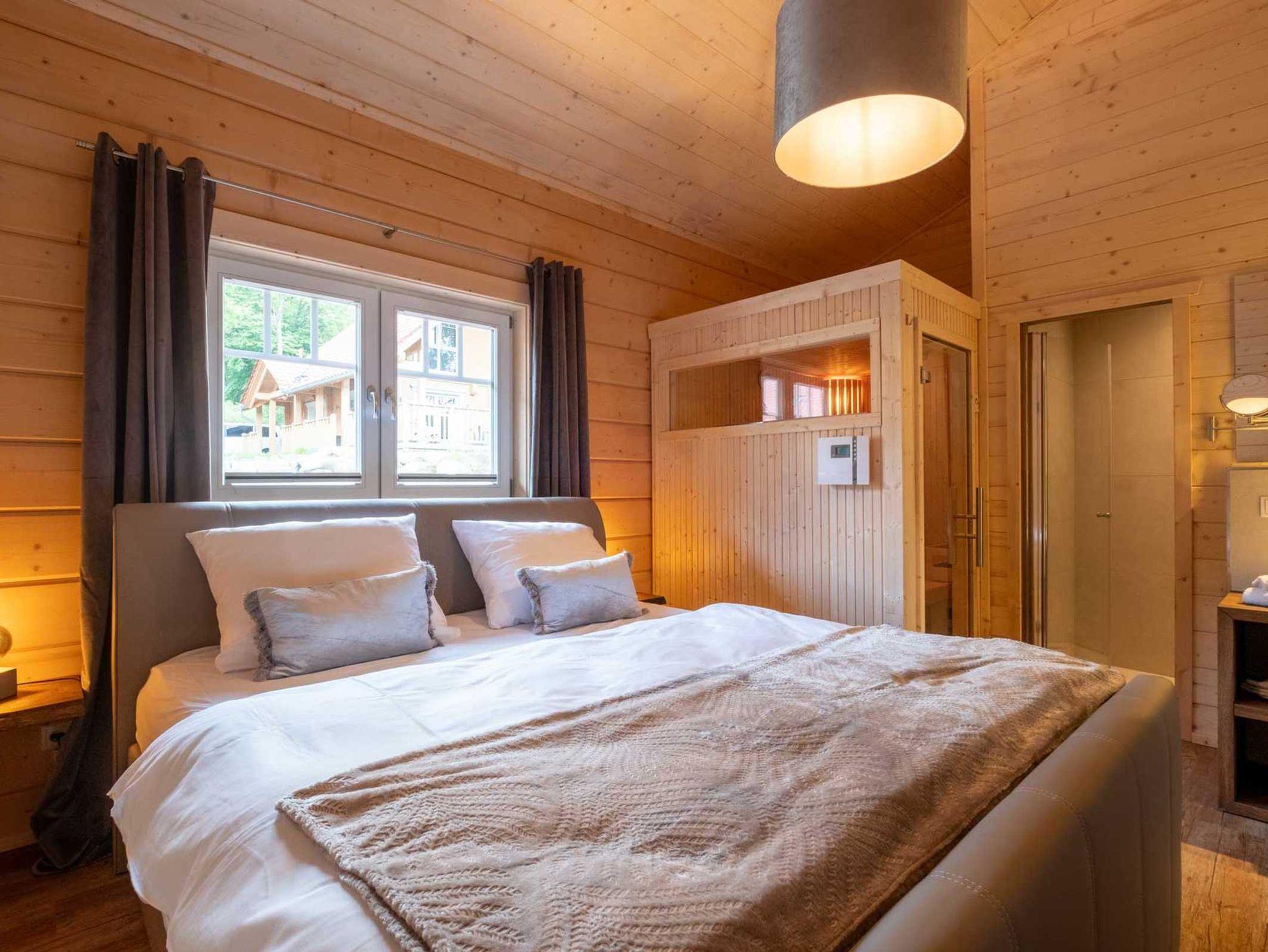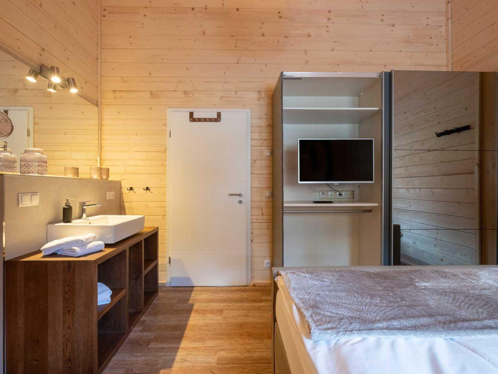 Das WC ist ein vom Bad separierter Raum und das aus gutem Grund, denn es gibt einen kombinierten Schlaf-/ Bad-/ und Duschraum. Zudem befindet sich dort eine Blockhaussauna. Die heiße Luft gelangt jedoch nicht ins Innere sondern wird über ein Ventil nach Außen transportiert, so dass trotz Sauna einem angenehm temperierten Raumklima nichts im Wege steht.