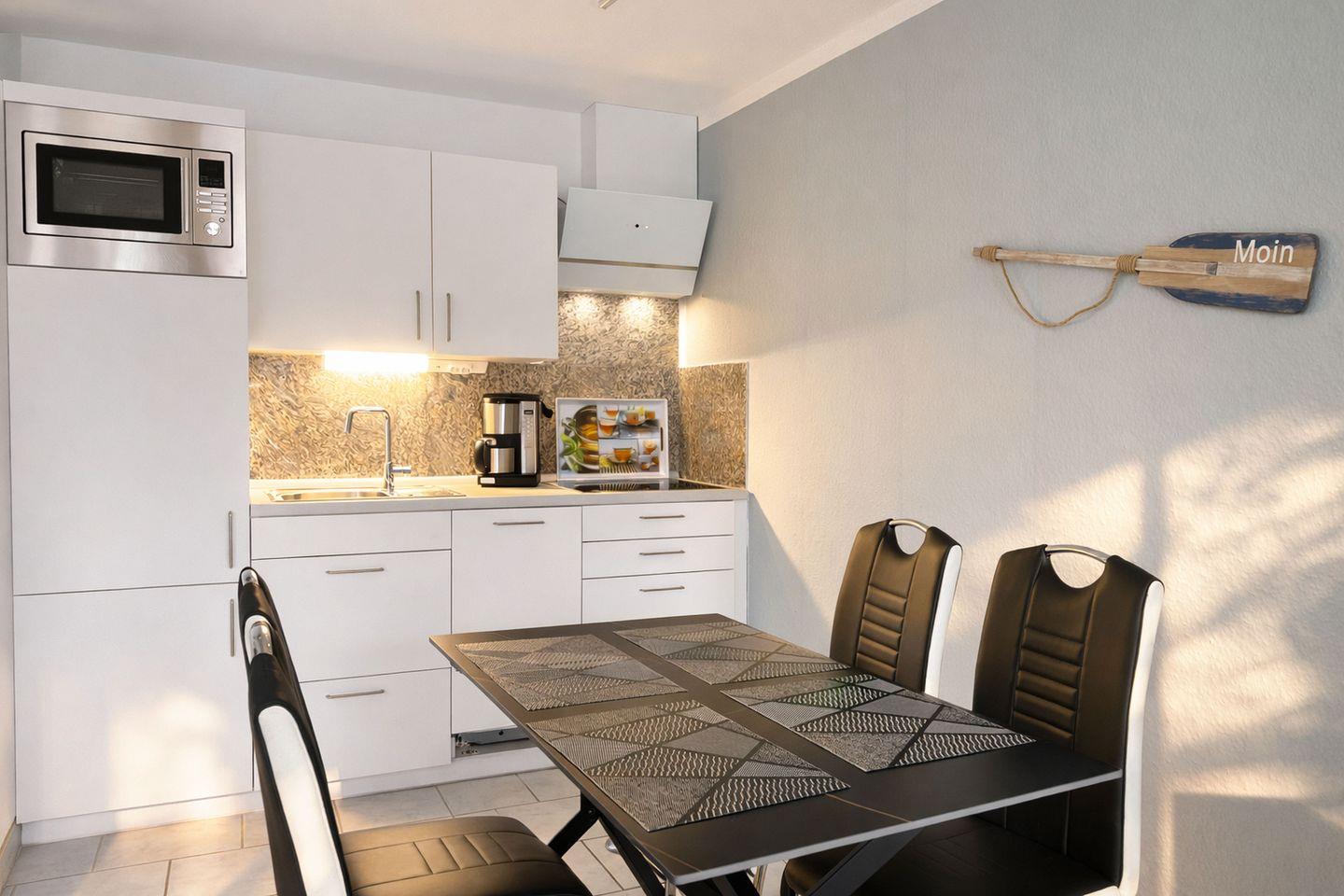Die ebenerdige Ferienwohnung Strandmuschel präsentiert sich hell, modern und freundlich eingerichtet und bietet zwei Personen einen komfortablen und entspannten Rahmen für einen erholsamen Urlaub an der Nordsee. Die Wohnung ist praktisch barrierefrei gestaltet und lediglich durch jeweils eine kleine Stufe an der Haus- und Terrassentür unterbrochen, sodass sie auch für Gäste mit eingeschränkter Mobilität gut geeignet ist. Der offen gestaltete Wohnbereich verbindet Wohnkomfort mit Funktionalität und lädt zum Verweilen ein. Die integrierte Küchenzeile ist vollständig ausgestattet und verfügt über eine Kaffeemaschine, einen Toaster, einen Wasserkocher, einen Geschirrspüler, eine Mikrowelle mit Grillfunktion sowie ein Kochfeld, sodass einer unkomplizierten Selbstversorgung nichts im Wege steht.