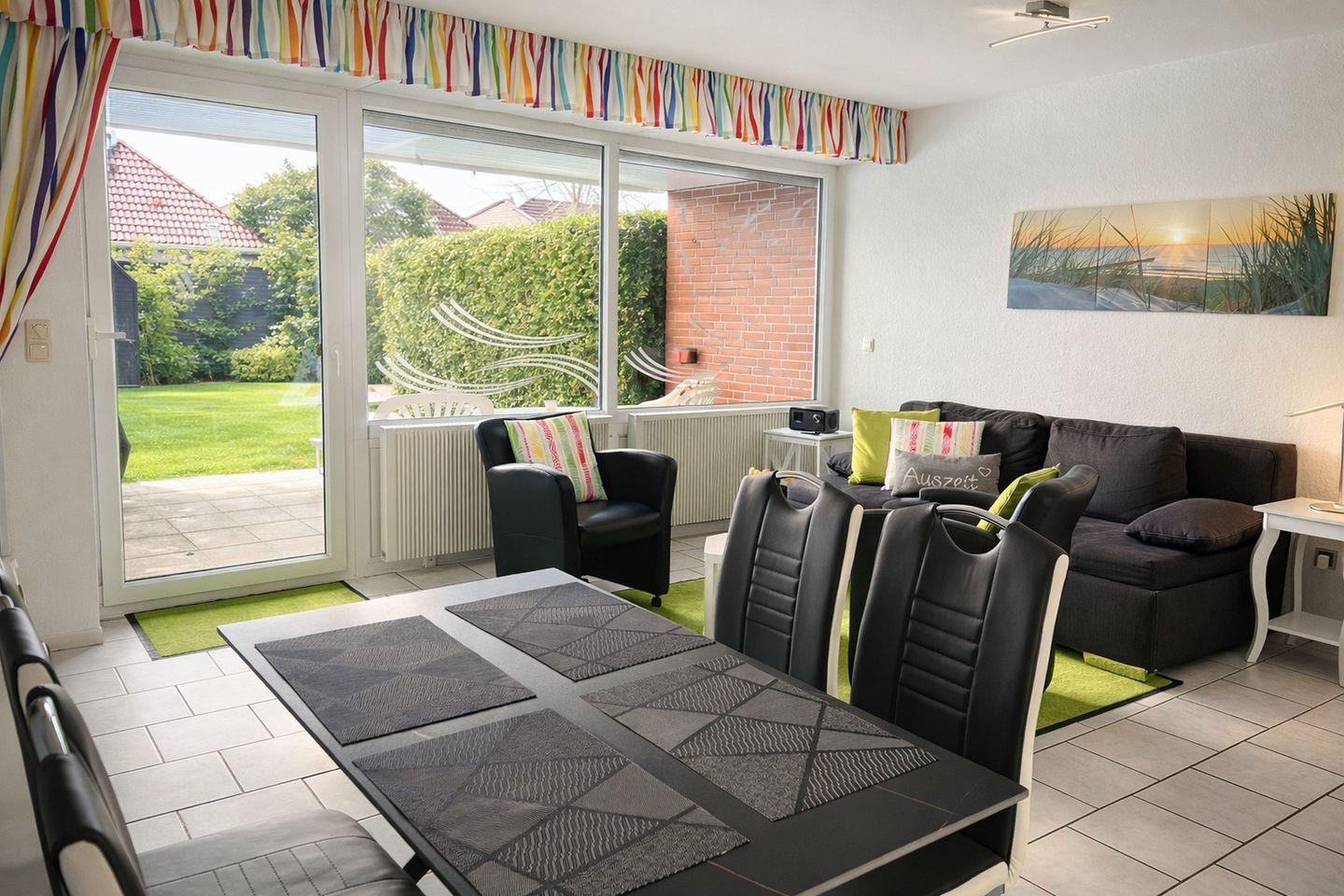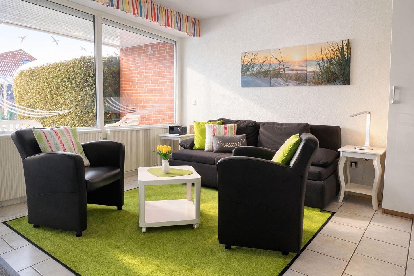 Direkt an den Wohnbereich schließt sich die sonnige Südterrasse mit kleinem, gepflegtem Garten an, der zusätzlich über einen eigenen Fahrradschuppen verfügt. Auf der Terrasse lädt ein Strandkorb dazu ein, die frische Nordseeluft zu genießen, zu entspannen oder den Tag gemütlich ausklingen zu lassen. Für moderne Unterhaltung und Kommunikation stehen Ihnen kostenfreies WLAN, ein Telefon im deutschen Festnetz, ein Flachbildfernseher mit Internetzugang sowie ein Internetradio zur Verfügung. Das Schlafzimmer ist mit zwei Einzelbetten in komfortabler Höhe ausgestattet und bietet erholsame Rückzugsmöglichkeiten. Die barrierefreie Dusche sorgt für zusätzlichen Komfort, während die durchgehend gefliesten Fußböden der gesamten Wohnung ein gepflegtes, modernes Ambiente verleihen.