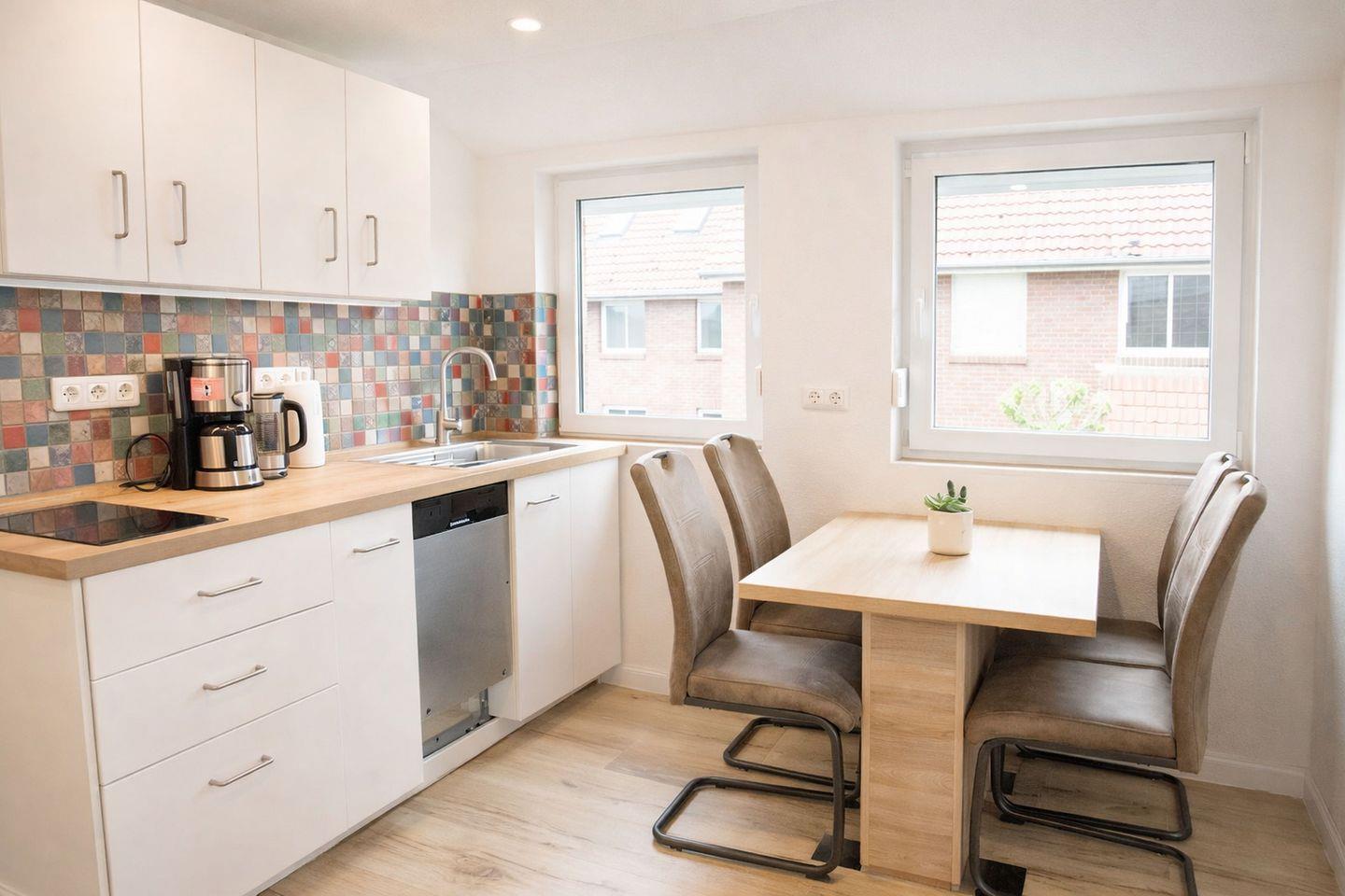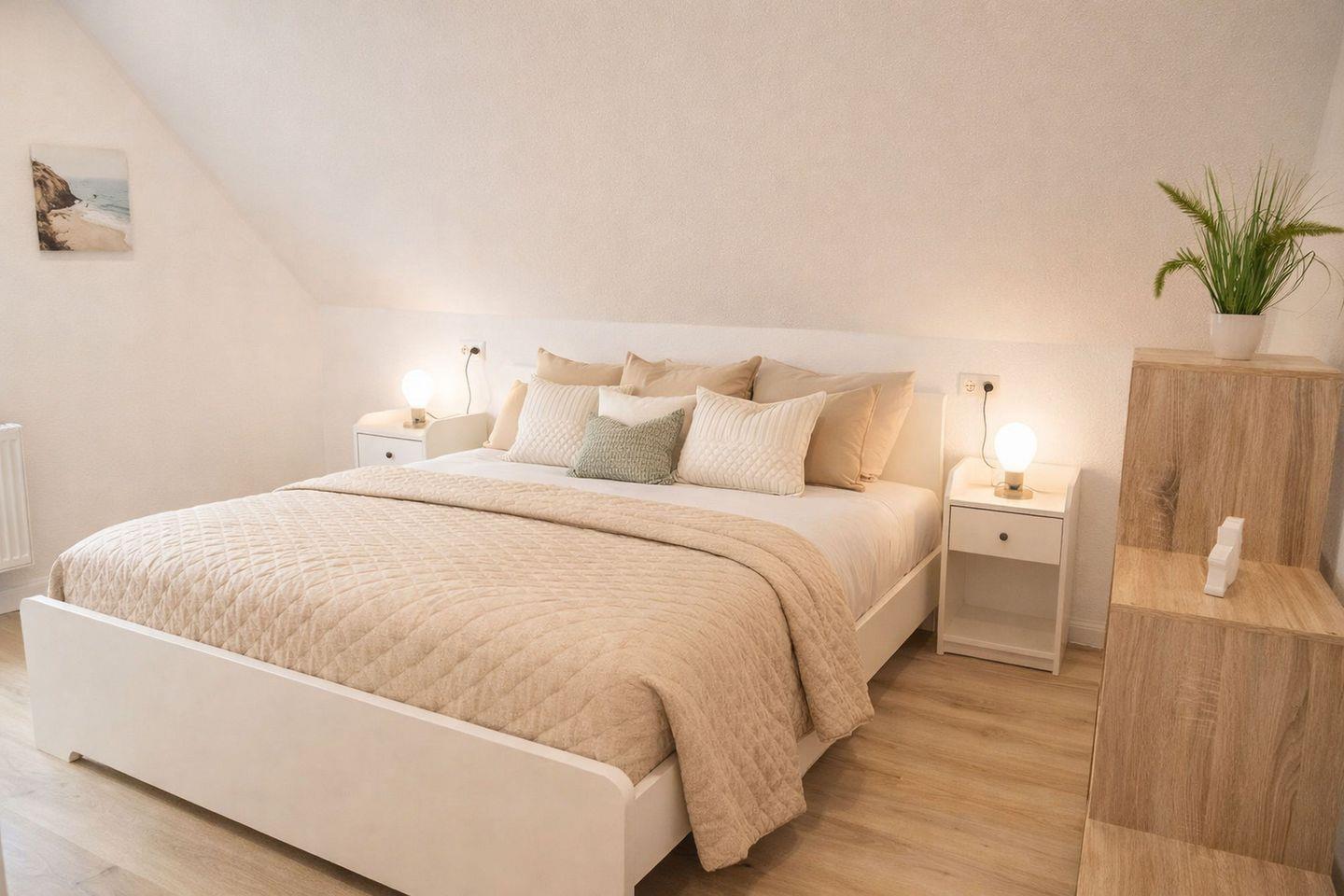 Das Tageslichtbad ist modern gestaltet und mit Dusche, Waschbecken und WC ausgestattet. Alle Fenster lassen sich mittels Rollläden verdunkeln, was für zusätzlichen Komfort und Privatsphäre sorgt. Die gesamte Wohnung wird über eine Zentralheizung beheizt und ist somit zu jeder Jahreszeit ein angenehmer Rückzugsort. Der Garten vor dem Haus bietet einen Strandkorb sowie mehrere Sitzgruppen, die von den Gästen gern genutzt werden. Hier können Sie die Sonne genießen, den Tag entspannt ausklingen lassen oder einfach nur dem Wind lauschen, der vom Meer herüberweht. Diese Ferienwohnung ist der ideale Ort für alle, die die besondere Nähe zur Küste, eine ruhige Lage und ein liebevoll gestaltetes Zuhause auf Zeit suchen.