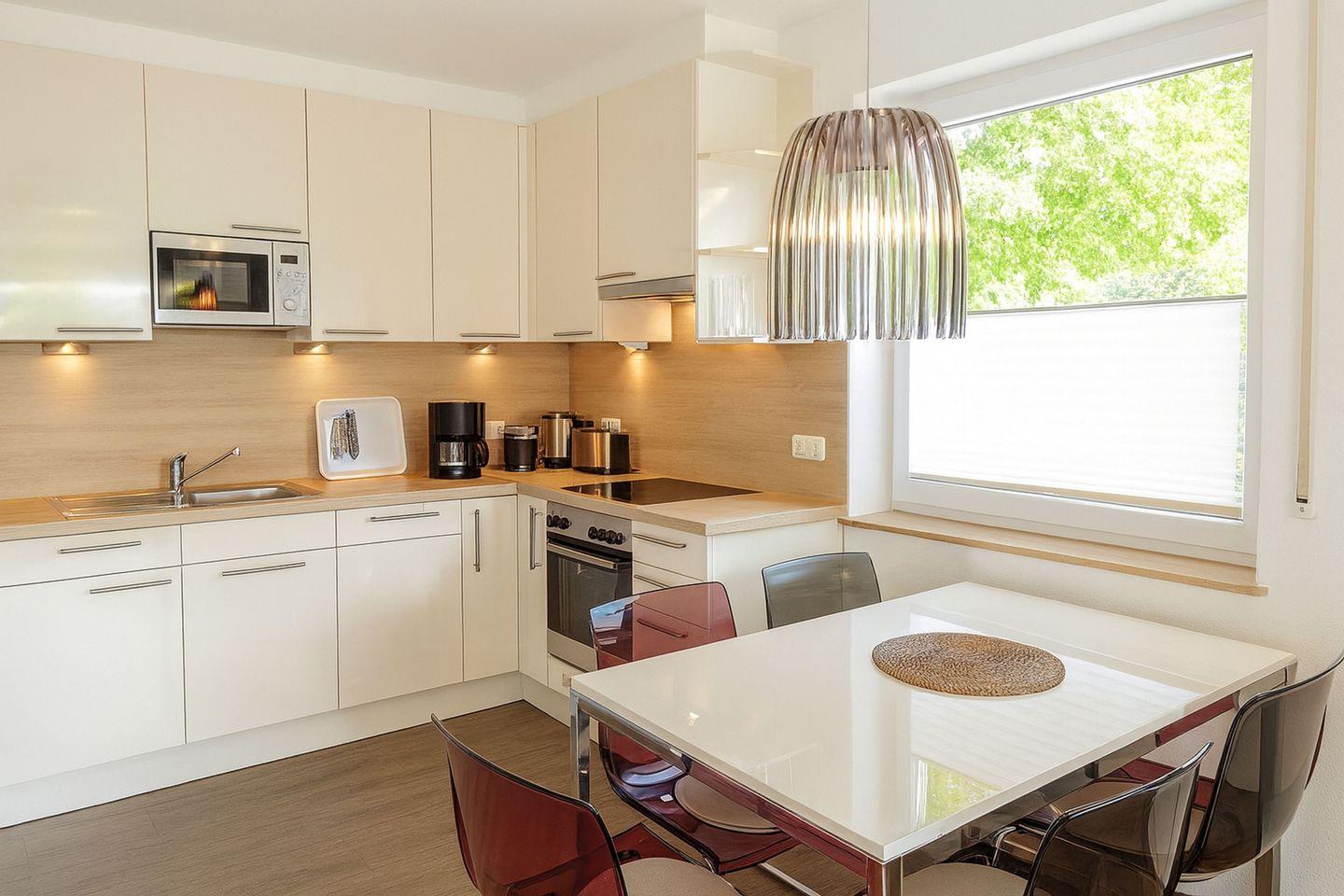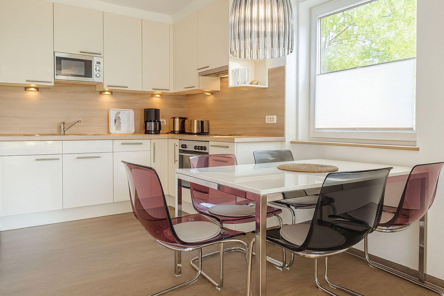 Im Inneren empfängt Sie eine offene, hochwertig ausgestattete Küche mit gemütlichem Essbereich, die zum gemeinsamen Kochen und Verweilen einlädt. Backofen, Cerankochfeld, Kühlschrank mit Gefrierfach, Geschirrspüler, Mikrowelle und Wasserkocher stehen Ihnen zur Verfügung und machen die Selbstversorgung im Urlaub besonders angenehm. Das zur Küche offene Wohnzimmer bildet den Mittelpunkt des Hauses und lädt mit einer komfortablen Couch, einem großen Fernseher mit Satellitenempfang, einem DVD-Player und einem Radio zu entspannten Stunden ein, ganz gleich ob nach einem erlebnisreichen Strandtag oder an einem ruhigen Abend im Haus.