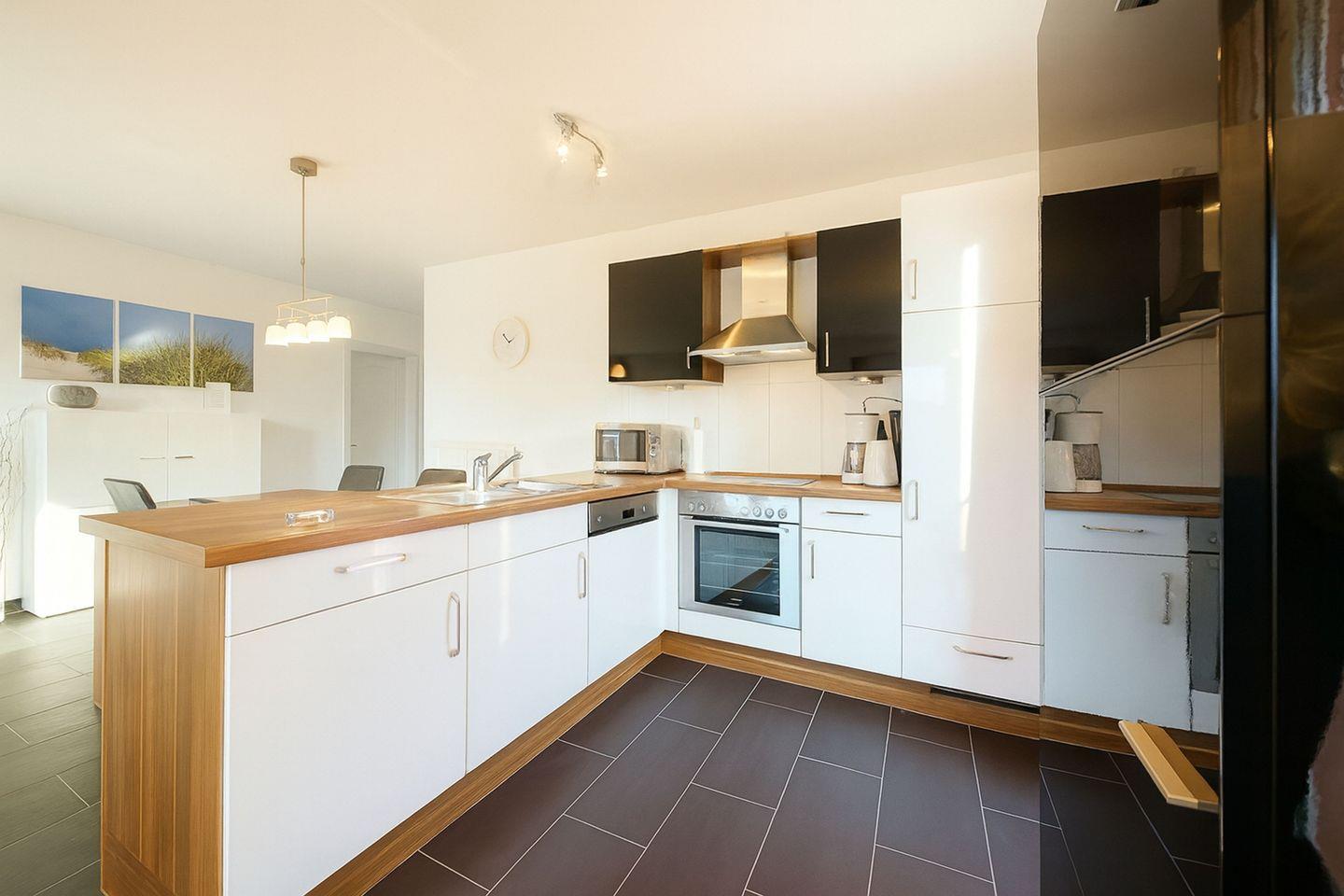Ein besonderes Highlight ist der eigene Wellnessbereich mit Sauna und Whirlbadewanne, der zu wohltuender Erholung nach einem Tag am Meer einlädt. Die voll ausgestattete Einbauküche verfügt über eine Spülmaschine, einen Backofen, eine Mikrowelle, einen Kühlschrank mit Gefrierfach sowie über eine klassische Kaffeemaschine und eine Tchibo-Cafissimo-Kapselmaschine. Toaster und Wasserkocher runden die umfangreiche Ausstattung ab und bieten Ihnen alles, was Sie für einen angenehmen Aufenthalt benötigen.