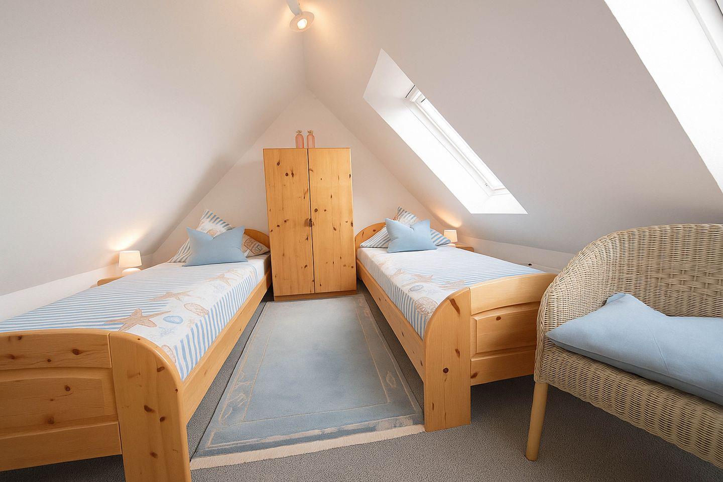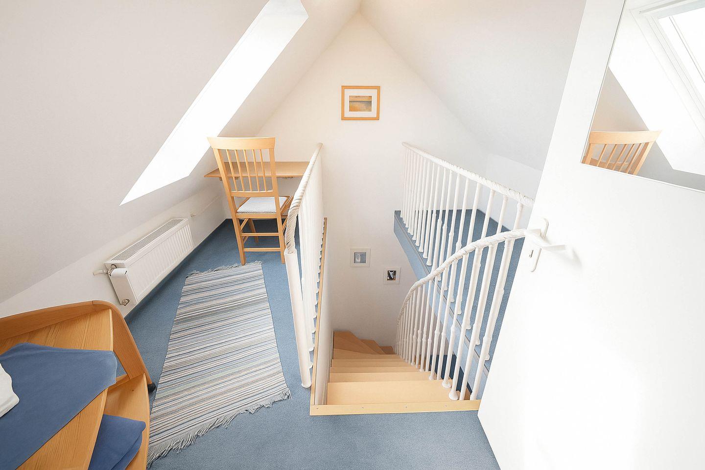 Ein helles Tageslichtbad mit Dusche und WC rundet das Raumangebot auf dieser Ebene ab und sorgt für zusätzlichen Komfort. Über eine Treppe erreichen Sie den separaten Schlafbereich im oberen Geschoss, wo zwei Einzelbetten für erholsame Nächte sorgen und einen ruhigen Rückzugsort bieten. Ein eigener PKW-Stellplatz direkt am Haus ermöglicht eine bequeme An- und Abreise. Diese Maisonettewohnung überzeugt durch ihre gelungene Kombination aus Strandnähe, funktionaler Ausstattung und gemütlichem Ambiente – ideal für Paare, Freunde oder kleine Familien, die ihren Urlaub entspannt und komfortabel genießen möchten.