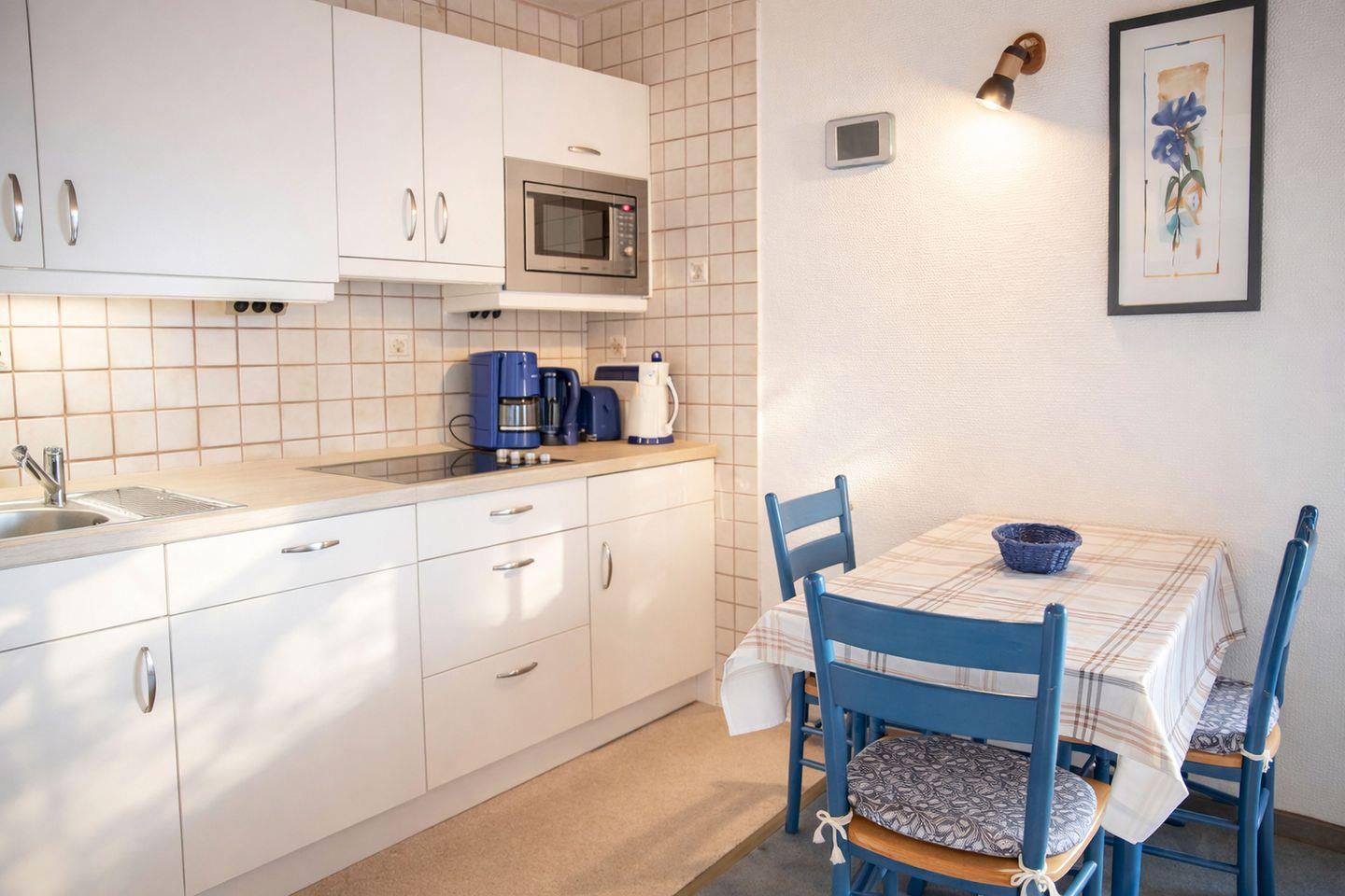 Das separate Schlafzimmer ist mit einem komfortablen Doppelbett ausgestattet und bietet Ihnen beste Voraussetzungen für erholsame Nächte. Dank eines Rollos lässt sich der Raum angenehm abdunkeln, sodass Sie auch nach langen Strandtagen wunderbar entspannen und ausschlafen können. Der helle Wohn- und Essbereich bildet das Herzstück der Wohnung und überzeugt mit einer funktionalen, gut ausgestatteten Küchenzeile. Hier stehen Ihnen ein Cerankochfeld, eine Geschirrspülmaschine, ein Kühlschrank mit Gefriermöglichkeit, eine Mikrowelle sowie Kaffeemaschine, Wasserkocher und Toaster zur Verfügung, damit Sie sich ganz flexibel selbst versorgen und Ihre Mahlzeiten in gemütlicher Atmosphäre genießen können. Ein Schrankbett steht hier für ein Kind zur Verfügung und bietet somit einen weiteren Schlafplatz. Auch hier lässt sich der Raum durch Außenrollos abdunkeln für geruhsame Nächte.