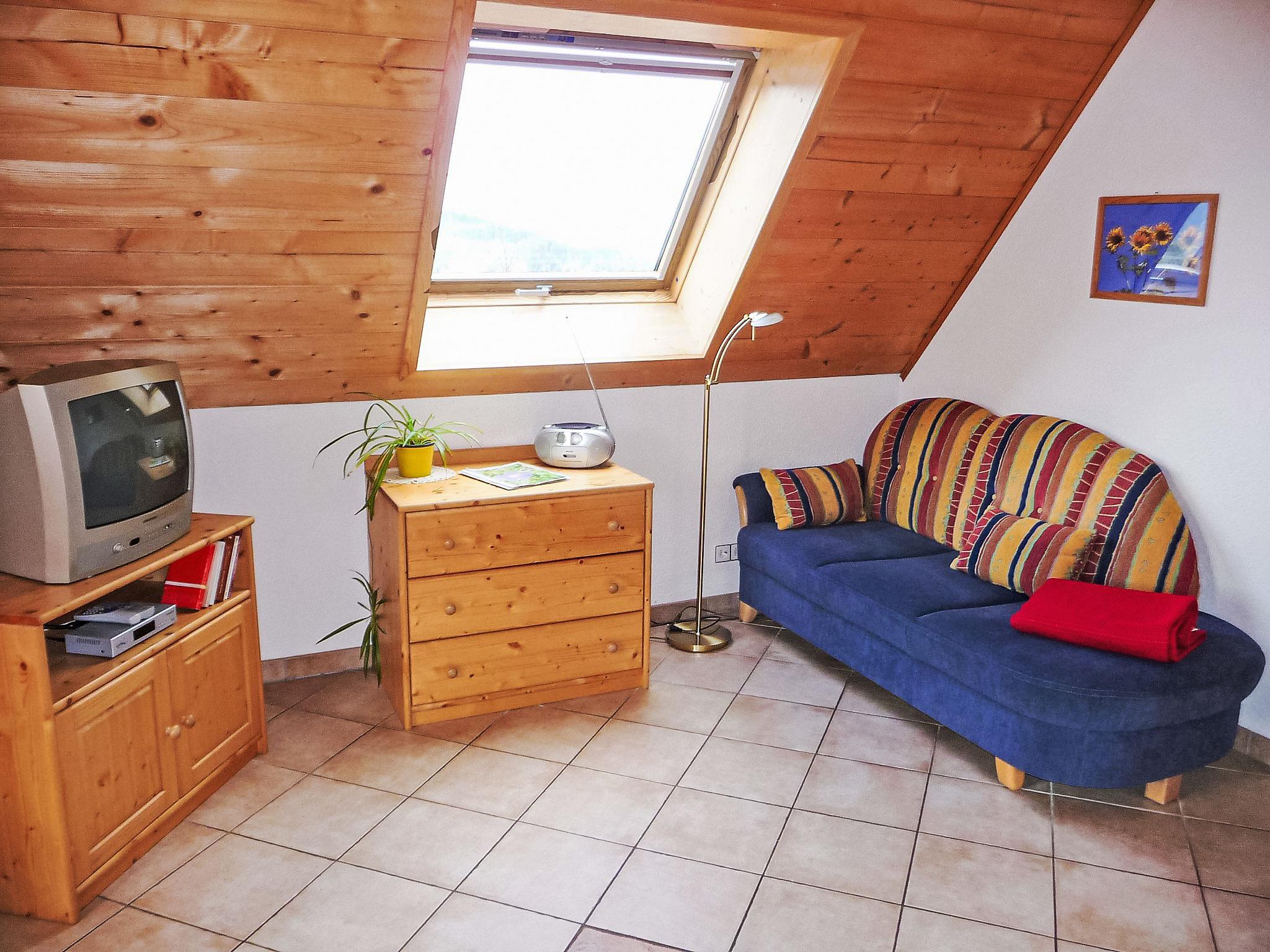 2-Zimmer-Wohnung 80 m2, im Dachgeschoss. Geschmackvoll und gemütlich eingerichtet: abgeschrägtes Wohn-/Esszimmer mit Sat-TV. Ausgang zum Balkon, Richtung Süden. Abgeschrägter grosser Eingang mit 2 Diwanbetten. 1 abgeschrägtes Doppelzimmer. Kochnische (Backofen, Geschirrspüler, 4 Glaskeramikplatten, elektrische Kaffeemaschine). Dusche/WC. Balkonmöbel. Sehr schöne Fernsicht auf das Tal, die Landschaft und den Wald. Zur Verfügung: Kinderhochstuhl, Haartrockner. Internet (WLAN, gratis). Bitte beachten: Nichtraucher-Unterkunft. Maximal 1 Haustier/Hund erlaubt. Hinweis: keine Firmenbuchungen erlaubt. Buchung nur zu touristischen Zwecken.