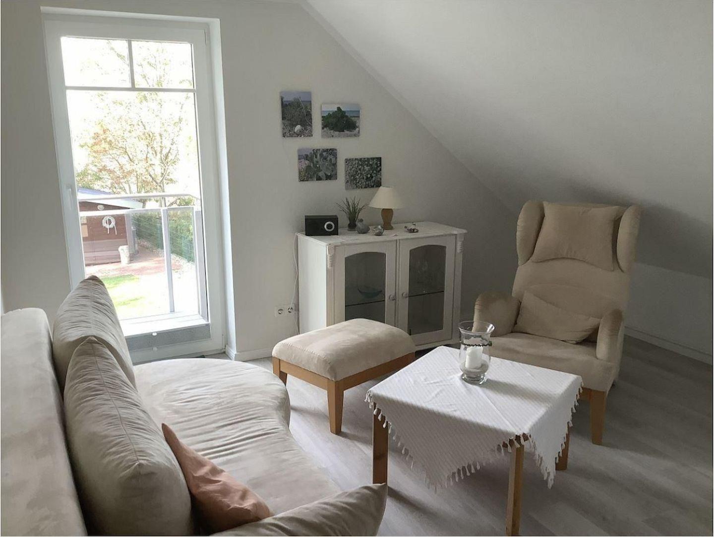 Der Wohnküche ist mit einer Couchgarnitur, einem Sessel und einem Hocker eingerichtet. Hier können Sie gemütliche Stunden verbringen und den weiten Ausblick über die angrenzenden Felder genießen. Verpassen Sie nicht den spektakulären Sonnenuntergang.