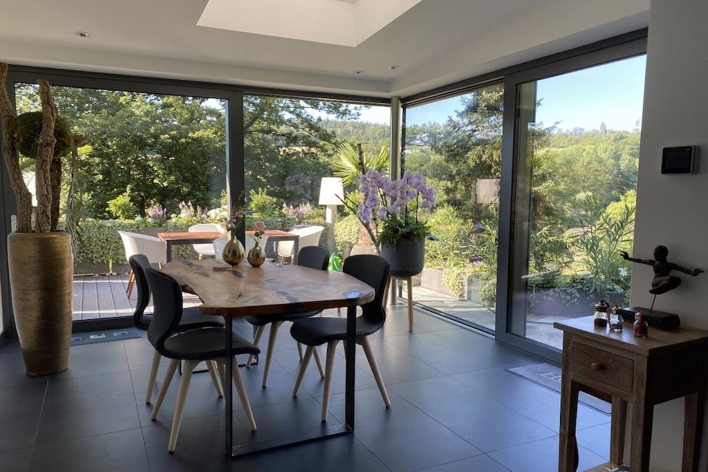 Meine Gäste erwartet ein kleines Haus mit großem Garten direkt am Waldrand von Schlangenbad Wambach. Hier gibt es viele herrliche Möglichkeiten sich mit seinem Vierbeiner auszutoben, spazieren zu gehen, Fahrrad fahren, einen entspannten Abend vorm Kamin zu verbringen oder mal nach Rüdesheim, Mainz, Wiesbaden oder Frankfurt zu fahren. Alles ist mit dem Auto oder öffentlichen Verkehrsmitteln gut zu erreichen. Gleichermaßen ist das Haus geeignet für Geschäftsleute, Messeaussteller oder- besucher. Der Wohnraum des freistehenden Hauses ist modern und gemütlich konzipiert. Die Böden sind pflegeleicht gefliest oder mit Echtholzdielen versehen. Es gibt nur eine Wohnebene, im Haus selbst gibt es keine Treppen. Das Haus verfügt über 2 seperate Schlafzimmer mit 140 und 180 cm breiten Betten. Das Sofa im gemütlichen Wohnzimmer bietet eine weitere Schlafmöglichkeit, Fernseher (Smart TV) BOSE Wave SoundTouch und einen Kamin. Für das erste Anheizen des Kamins ist für Holz gesorgt. Für weiteres heizen mit dem Kamin bitte gut getrocknetes Holz z. B. im Baumarkt besorgen. Die Küche ist gut ausgestattet mit Kaffeemaschine, Backofen, Herd etc. Selbstverständlich ist WLAN überall verfügbar. Das Badezimmer verfügt über eine ebenerdige Dusche und über eine Badewanne.