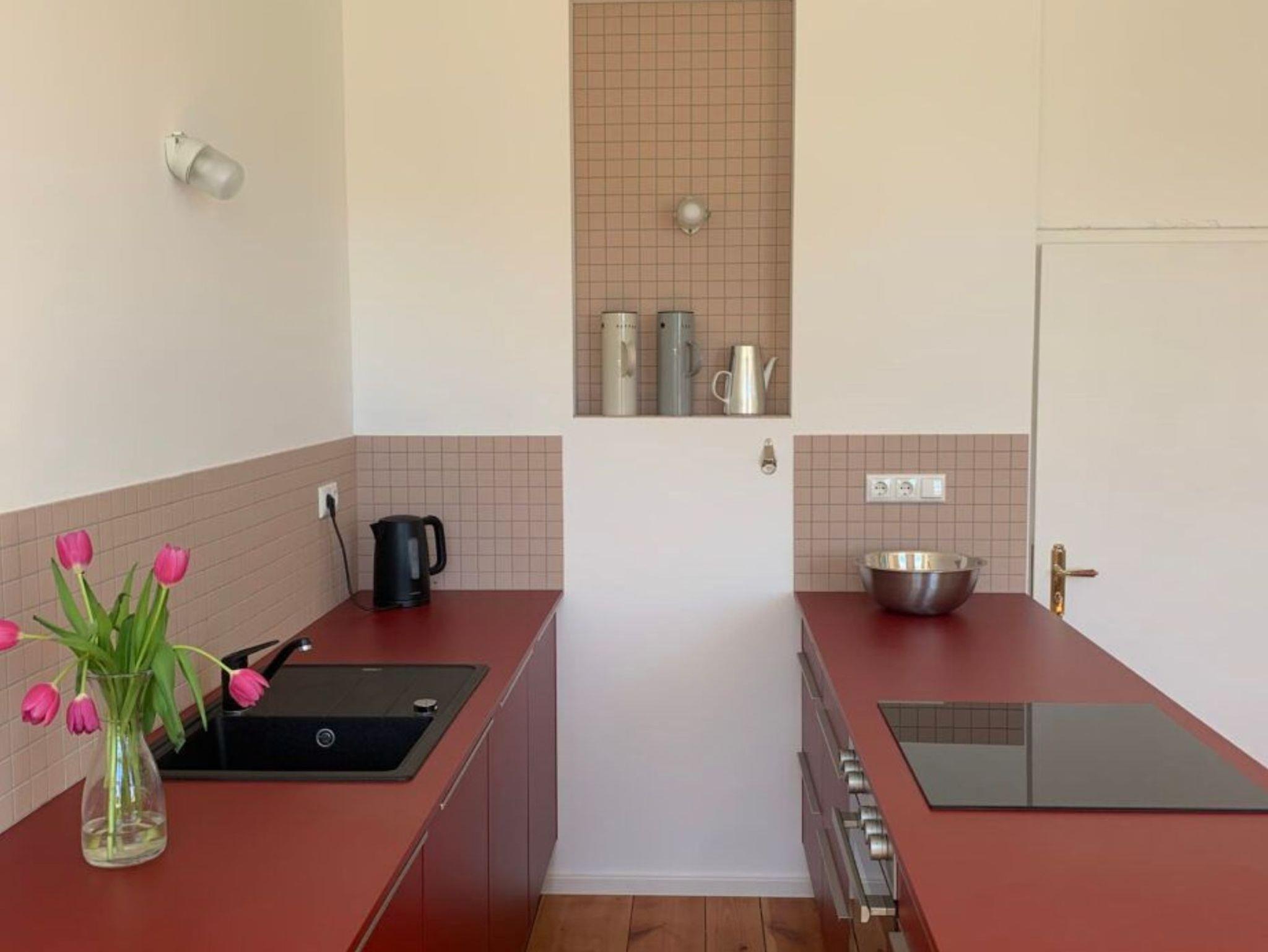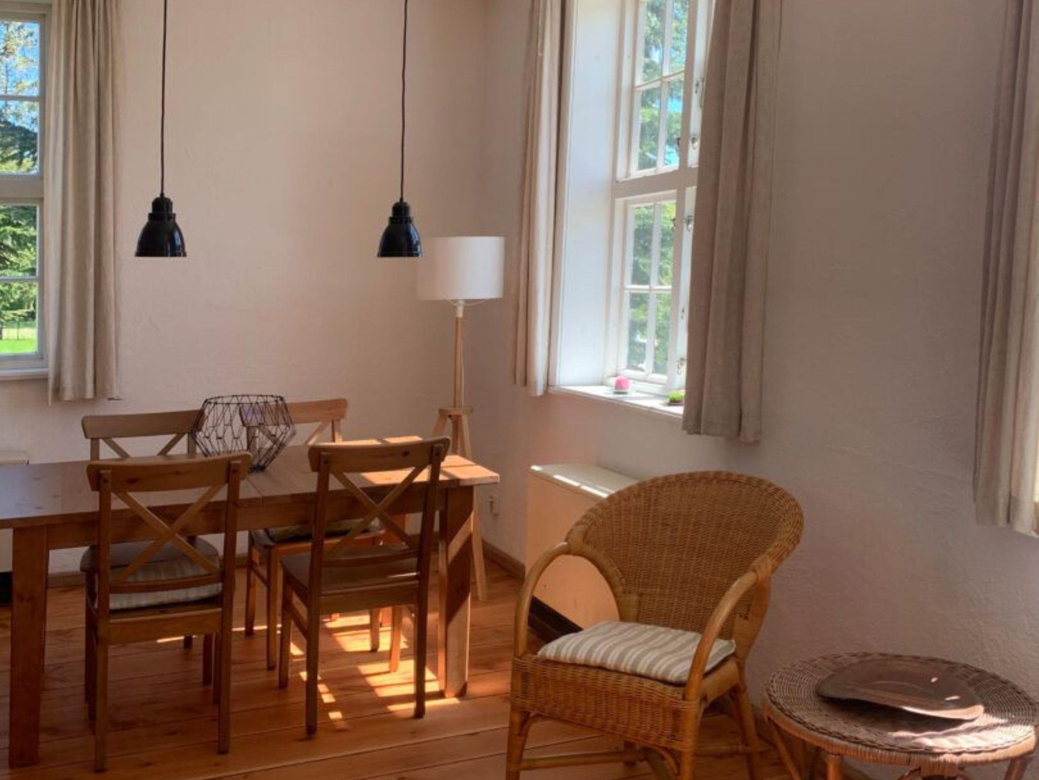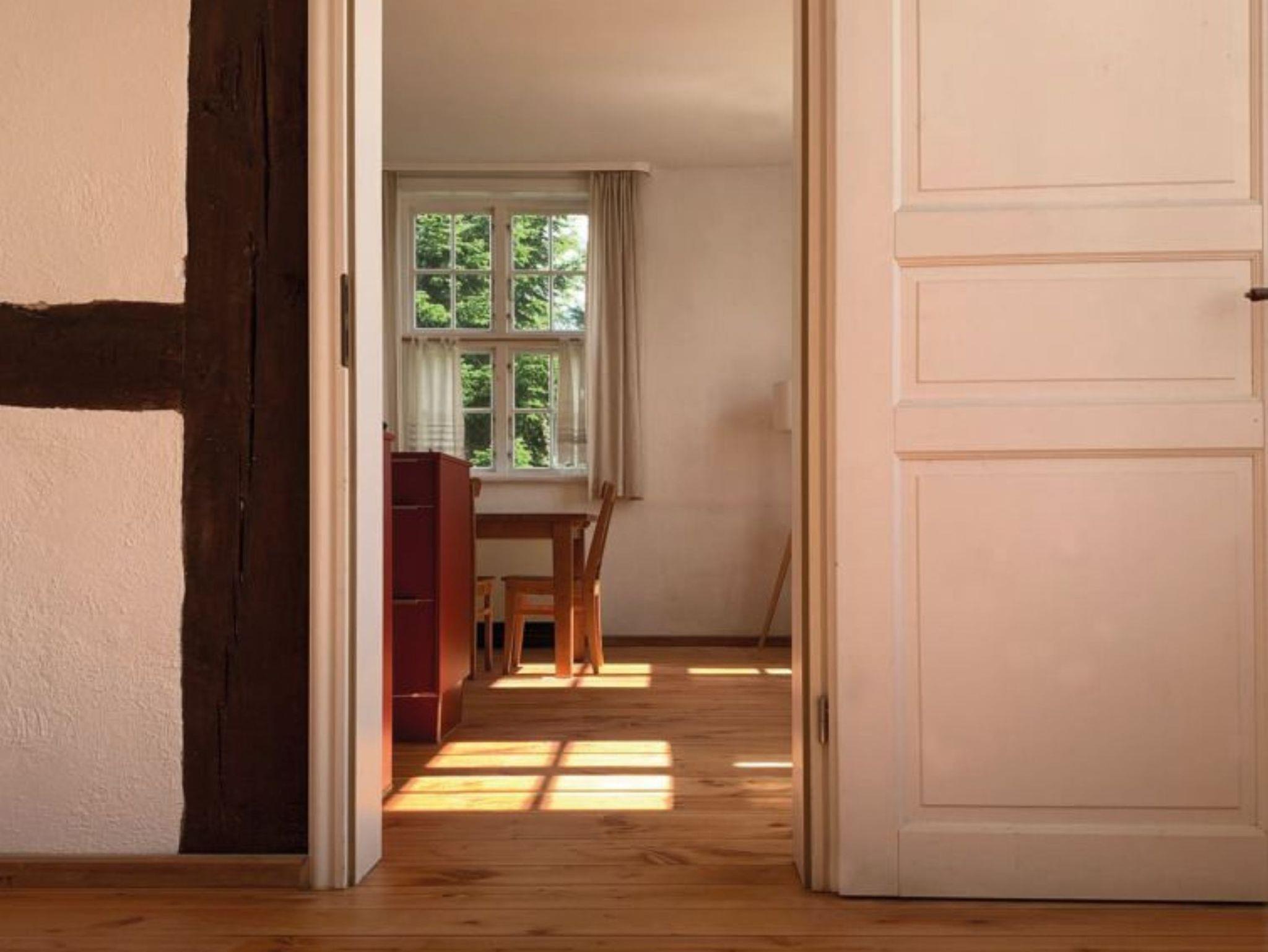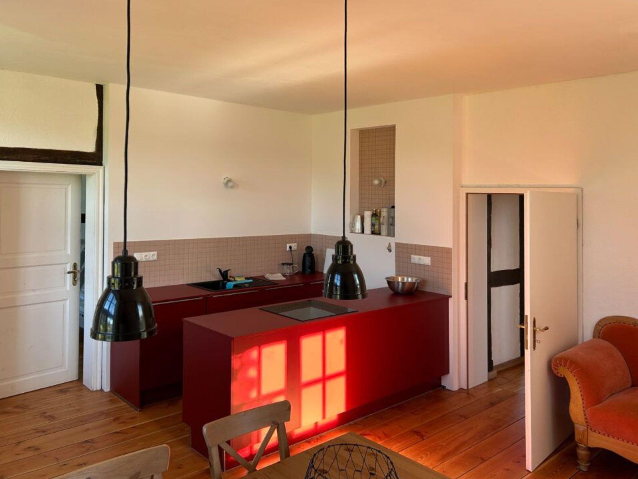 Die Fewo 3 verbindet großzügiges Wohnen mit besonderem Altbau-Flair: Ein geräumiges Wohnzimmer mit offener Küche, hohen Decken, großen Fenstern und alten Holzdielen sorgt für viel Licht und eine angenehme Atmosphäre. Die voll ausgestattete Küche bietet reichlich Platz, wenn Sie gern gemeinsam kochen und den Tag in entspannter Runde ausklingen lassen.