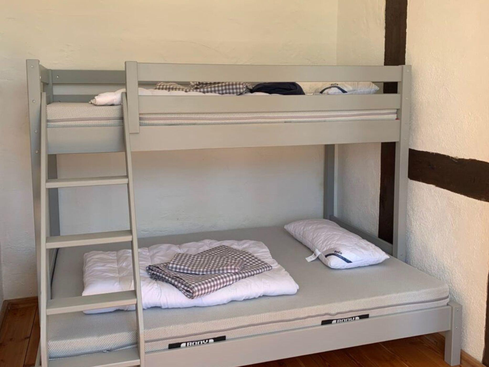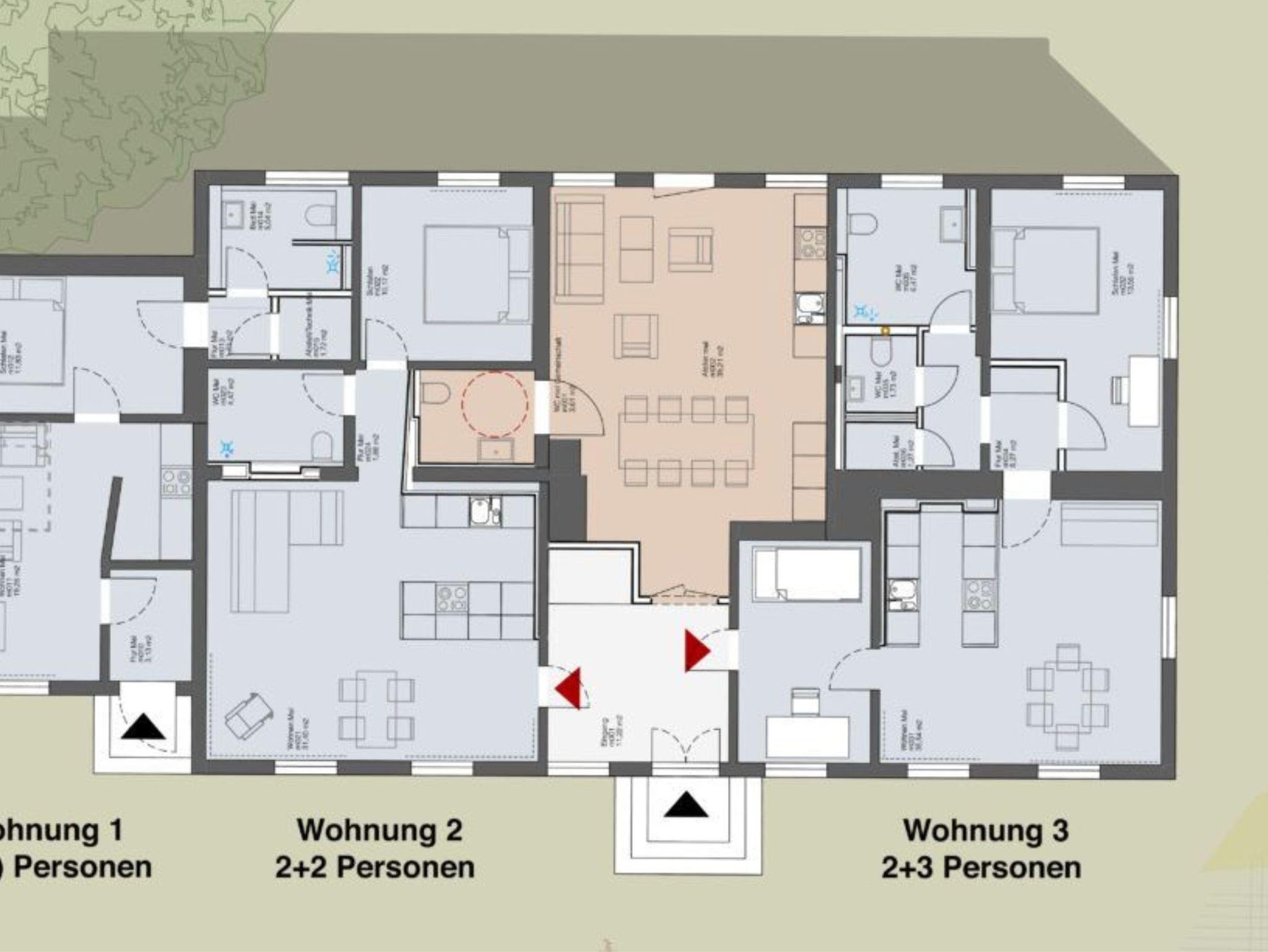 Für Gruppen besonders hilfreich: Zwischen den beiden großen Wohnungen (Fewo 2 und Fewo 3) befindet sich ein ca. 40 m² großer Gemeinschaftsraum mit Küche und WC, der zum gemeinsamen Essen, Arbeiten, Spielen oder für Gruppenaktivitäten genutzt werden kann. Ein Schlafsofa bietet dort zusätzlich zwei Schlafgelegenheiten.