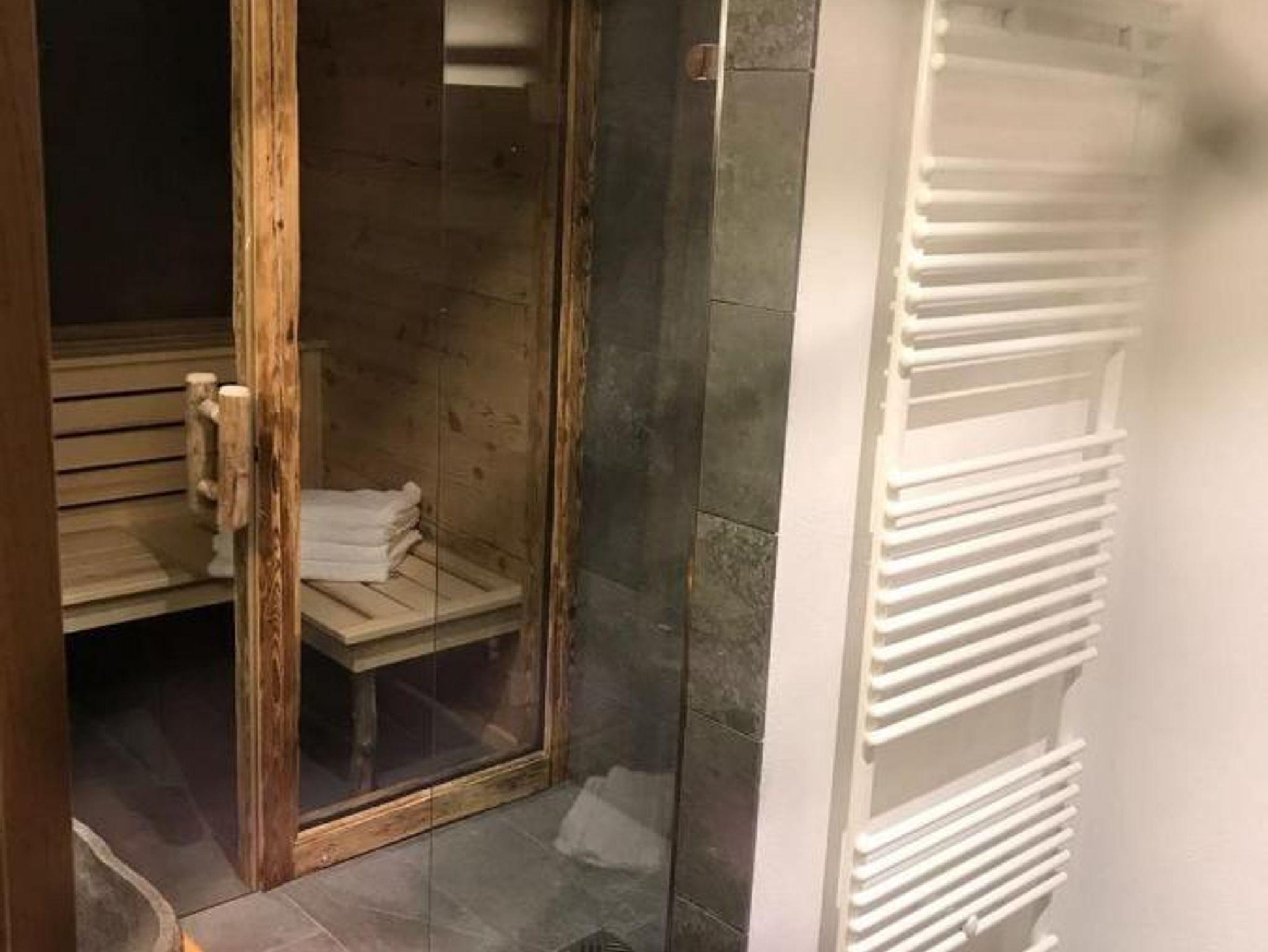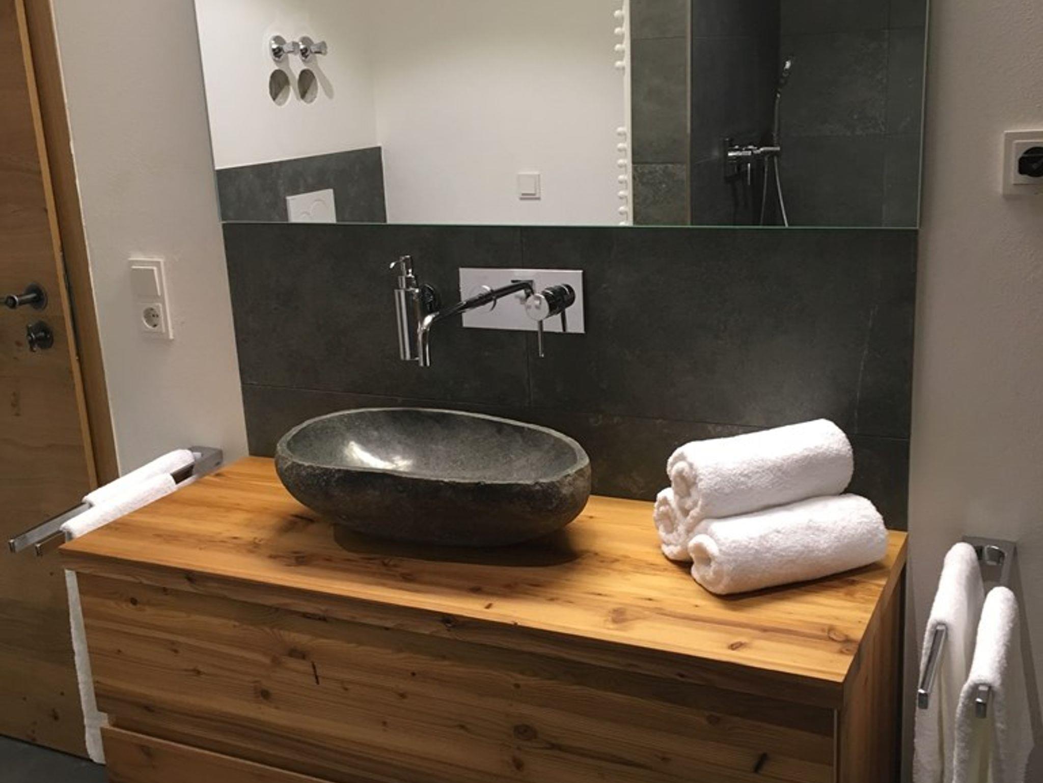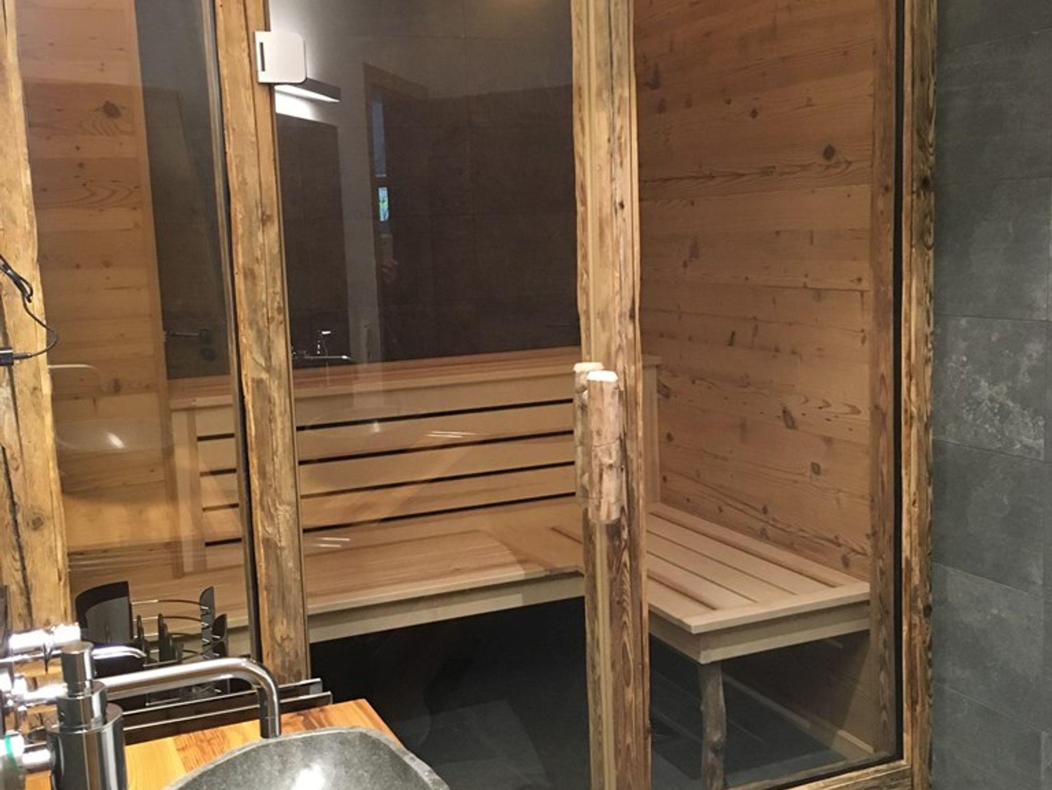 Das komfortable Badezimmer, mit einer ebenerdigen Wellnessdusche und der alpenländischen Design-Sauna, lädt zum Verweilen ein.
