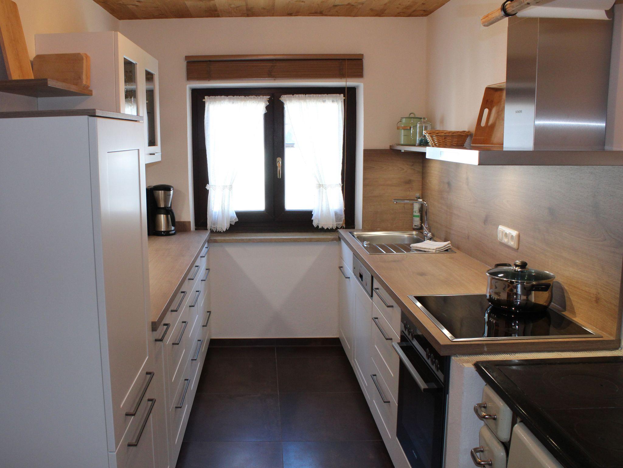 • Separate, voll ausgestattete Küche mit Kühlschrank und Gefrierfach, Spülmaschine, E-Herd und Holzofenherd