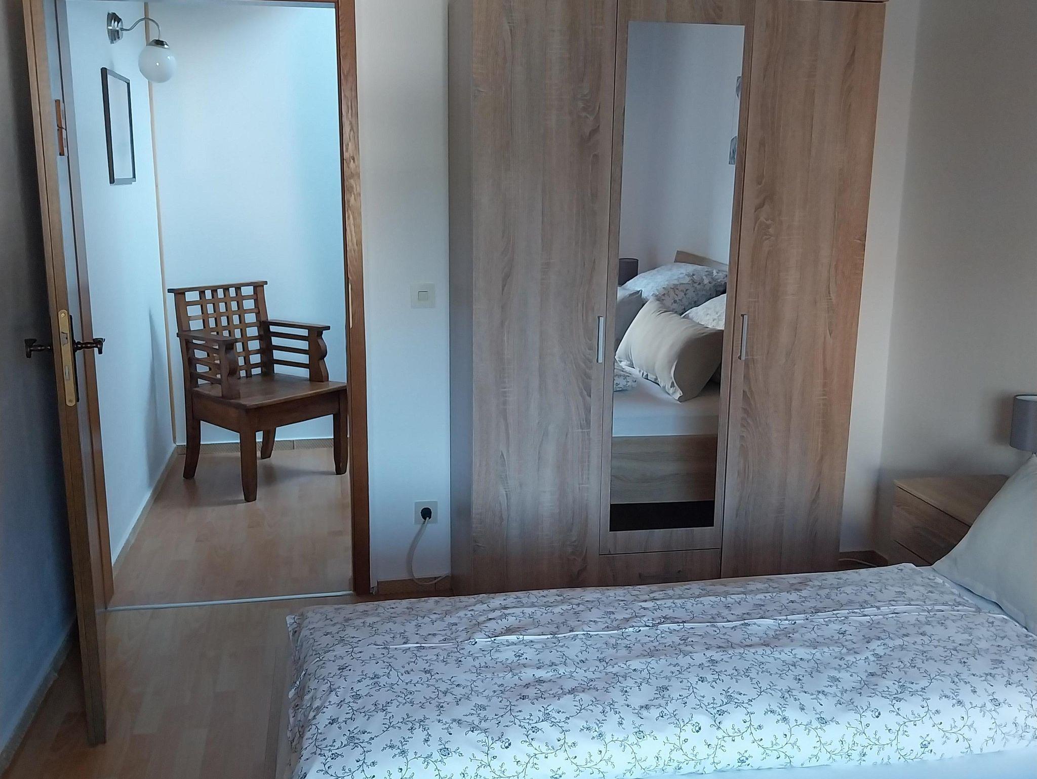 Schlafzimmer mit Doppelbett (180x200cm), Bettwäsche und Kleiderschrank. Dieses befindet sich auf der 1. Etage.