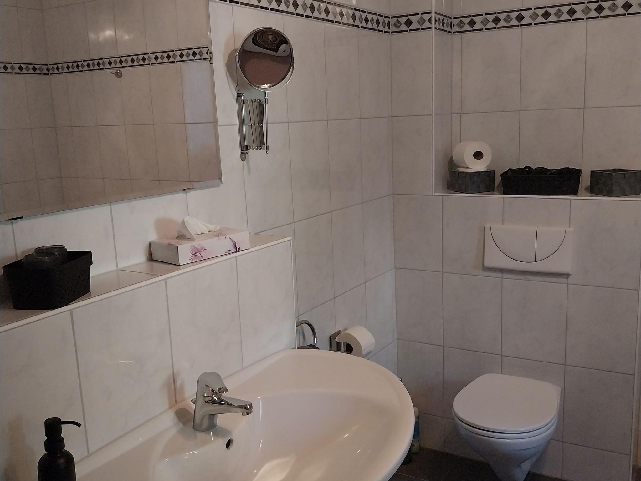 Bad mit Dusche, Hand- und Badetüchern, Fön und diversen Toilettenartikeln.