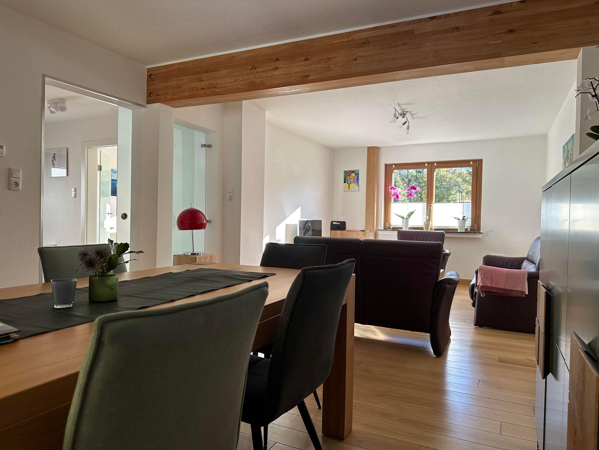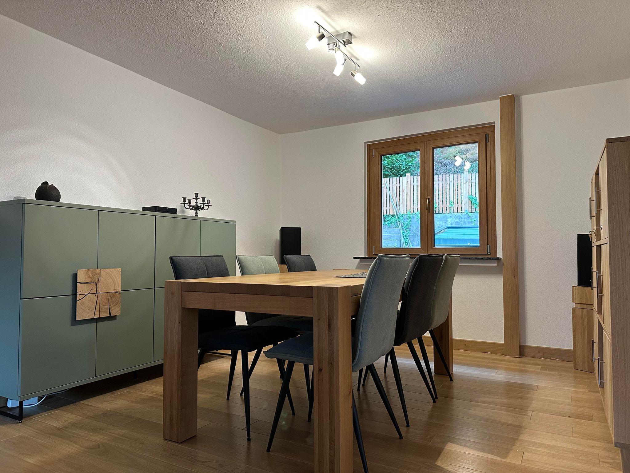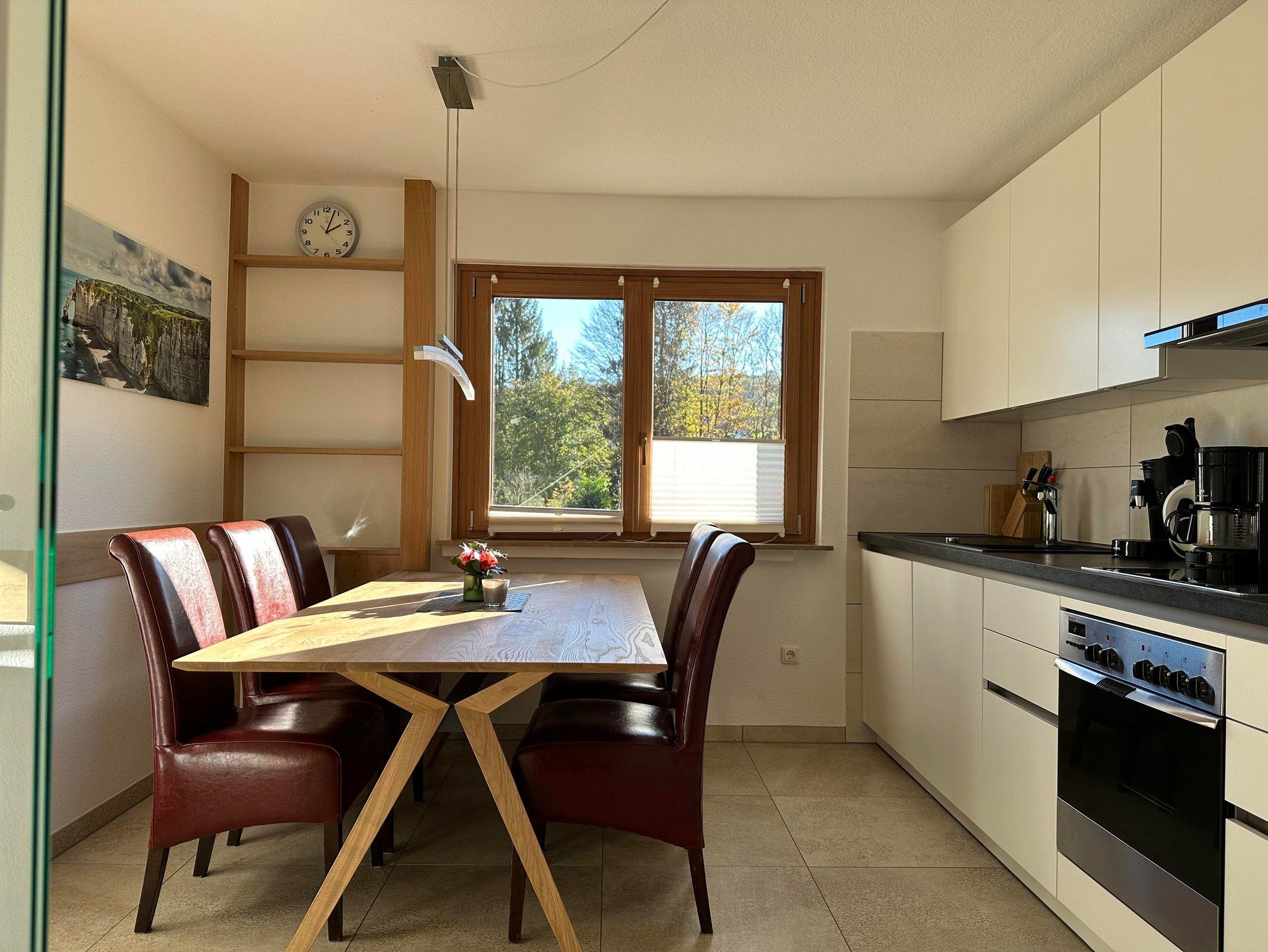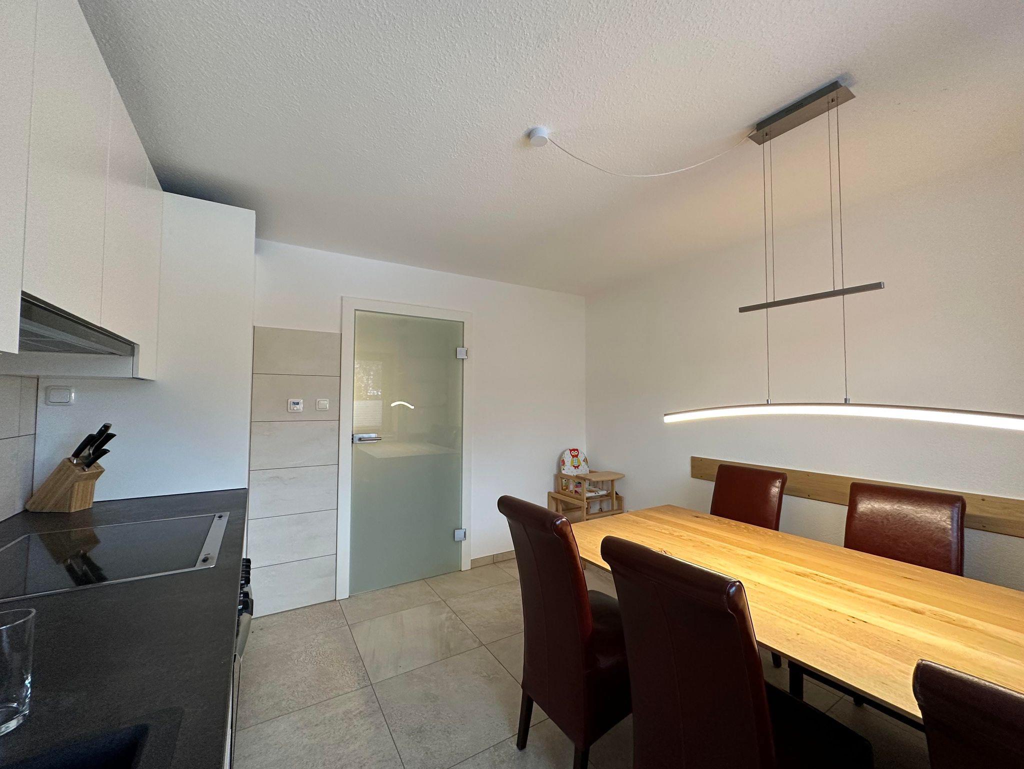 1 große Küche, komplett eingerichtet mit Geschirrspülmaschine, Ceran-Kochfeld, Backofen, Mikrowelle, Kühlgefrierschrank, Esstisch und Sitzbank für bis zu 6 Personen,