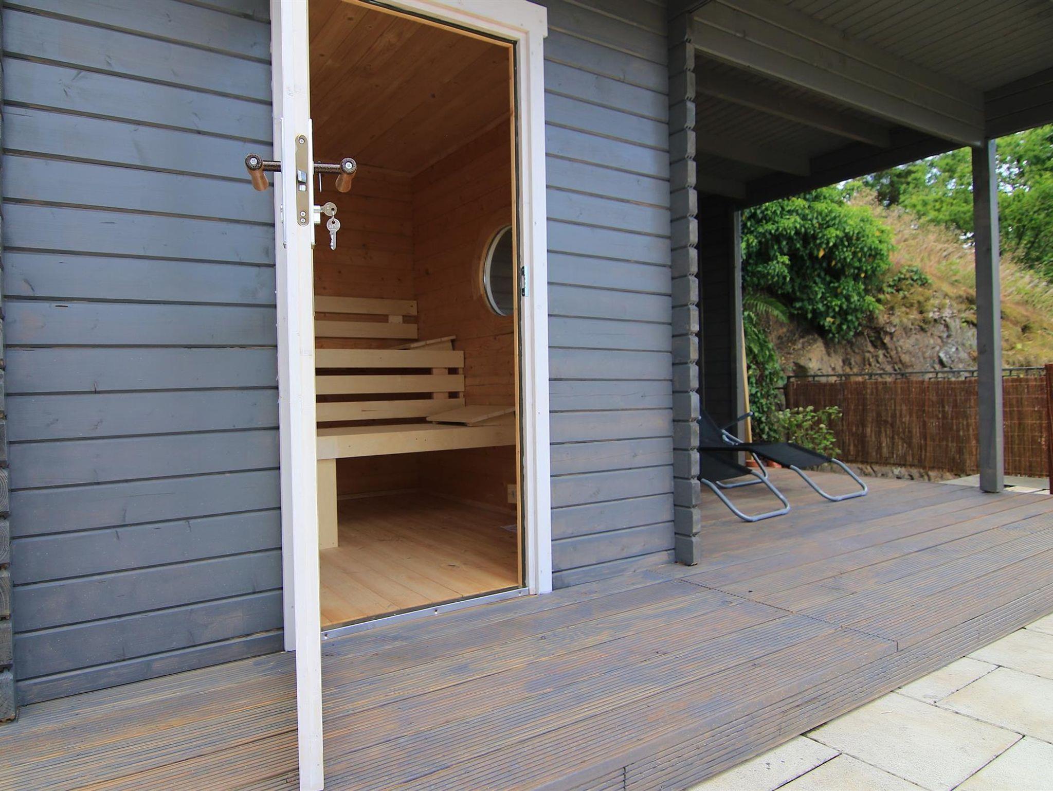 Ebenfalls zur Wohnung gehört eine große außen Sauna mit Blick auf das Schleidener Schloss.
