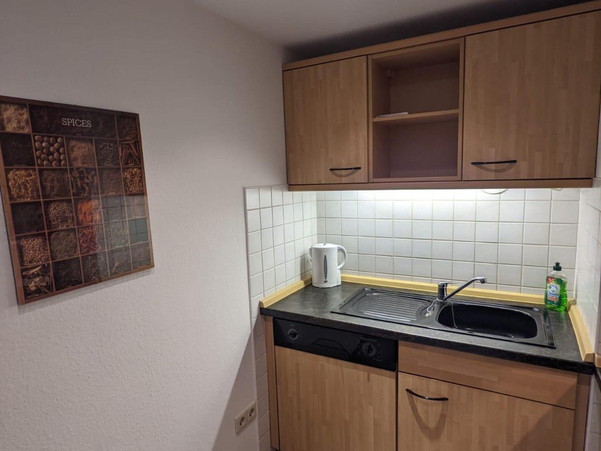 Wohn- & Küchenbereich: Kaffeemaschine, Wasserkocher, Ceranfeld, Mikrowelle, Spülmaschine, Kühlschrank mit Gefrierfach, TV, WLAN
