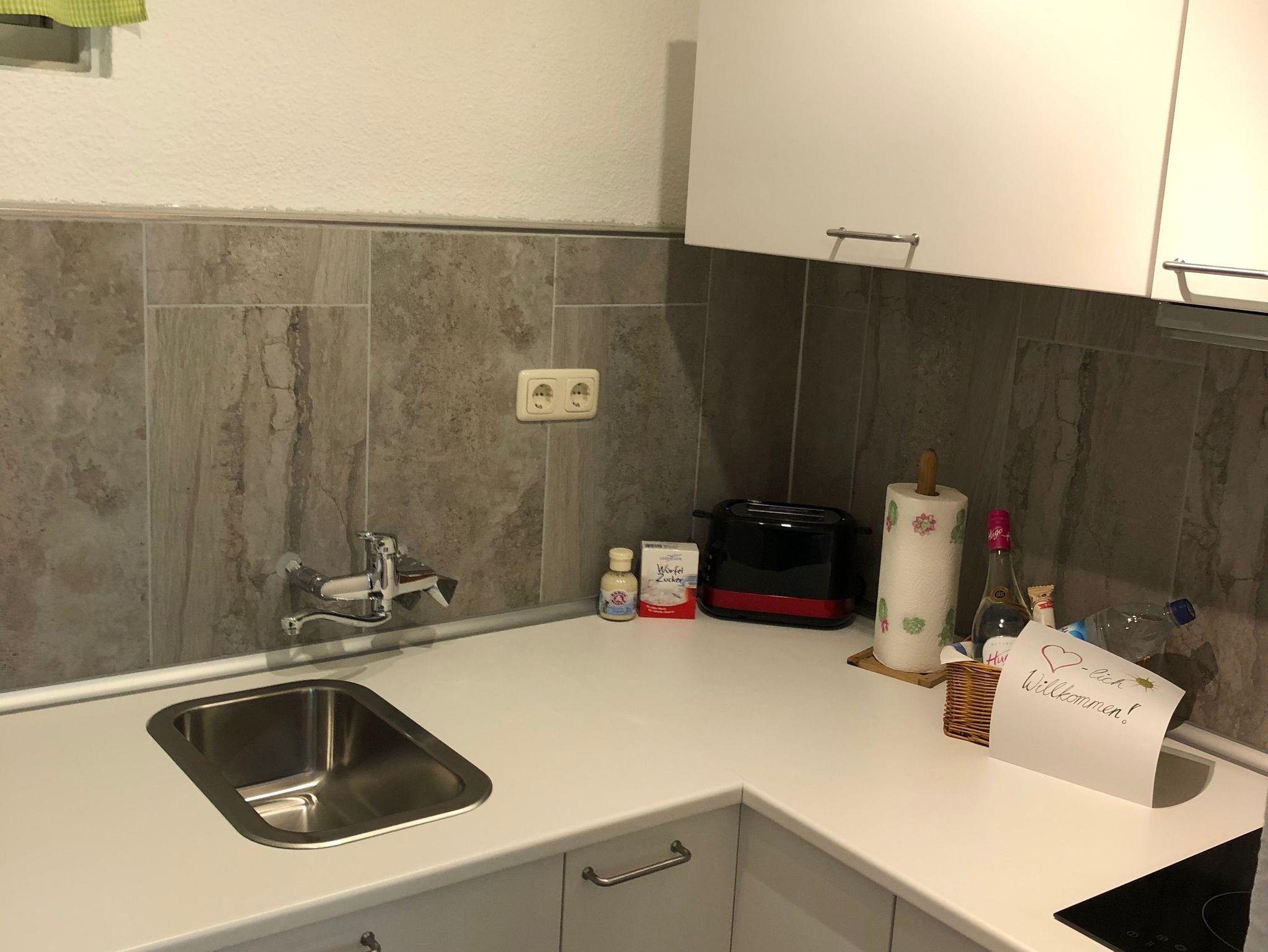 Die Wohnung besteht aus einem Wohnraum mit Essecke, einer separaten kleinen Küche, einem Elternschlafzimmer und einem kleinerem Kinderschlafzimmer. In beiden Schlafzimmern sind Doppelbetten aufgebaut.