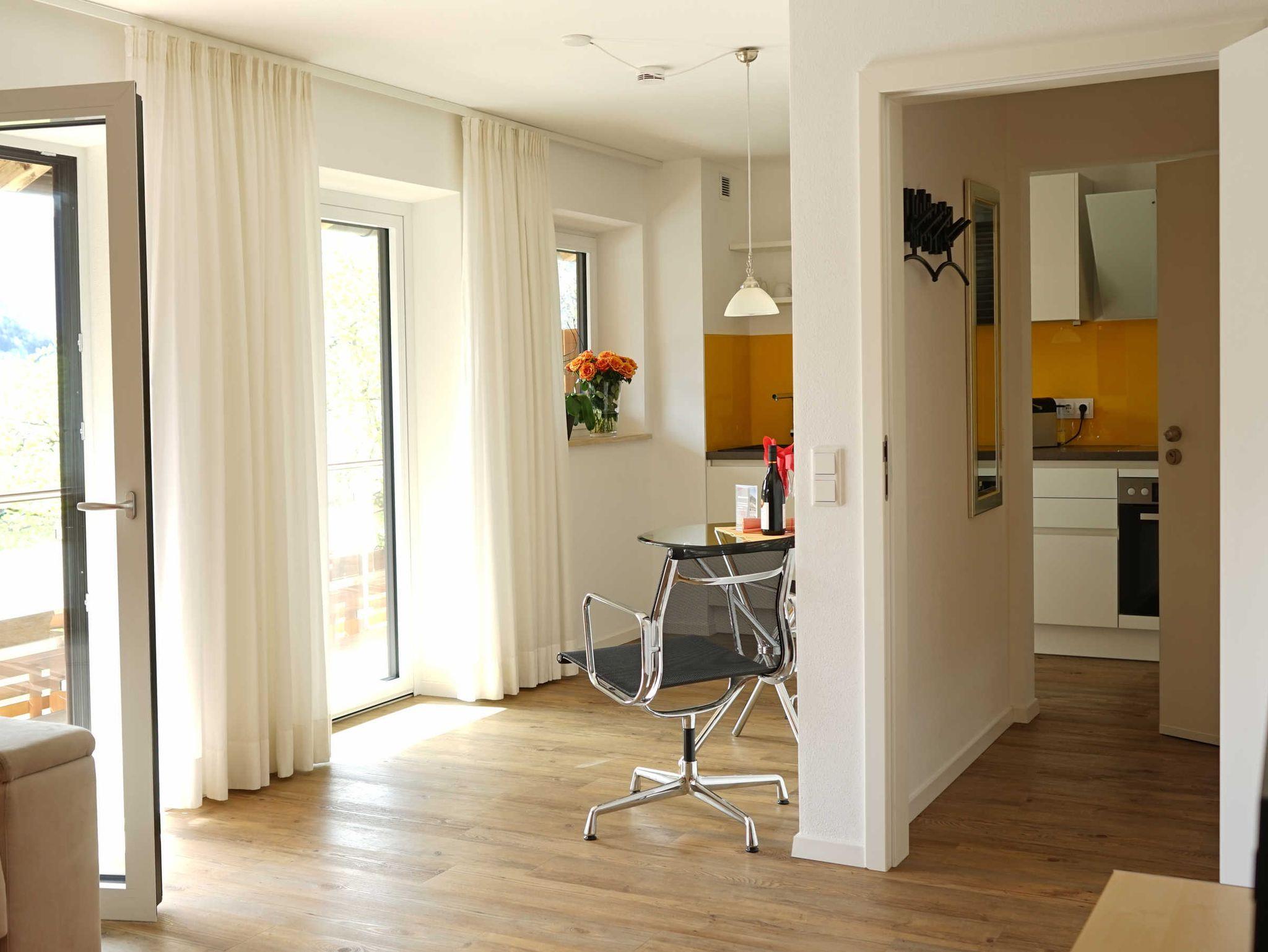 Wohnzimmer mit Essecke, Ostbalkon, Küche sowie Schlafzimmer mit Badezimmer