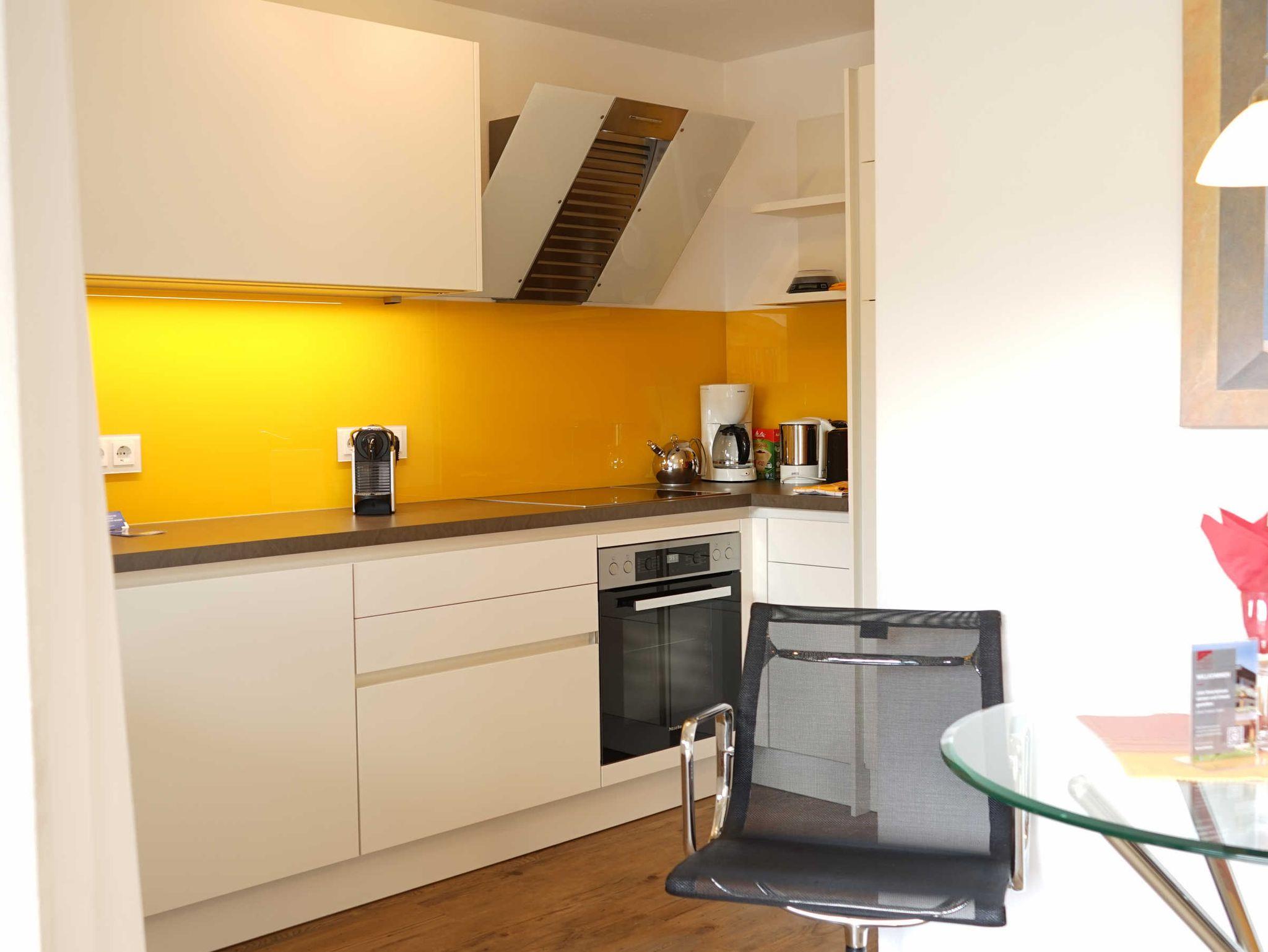 Das Badezimmer hat eine begehbare Dusche und eine Toilette. Auch eine voll ausgestattete Miele Küche wartet auf unsere Gäste.
