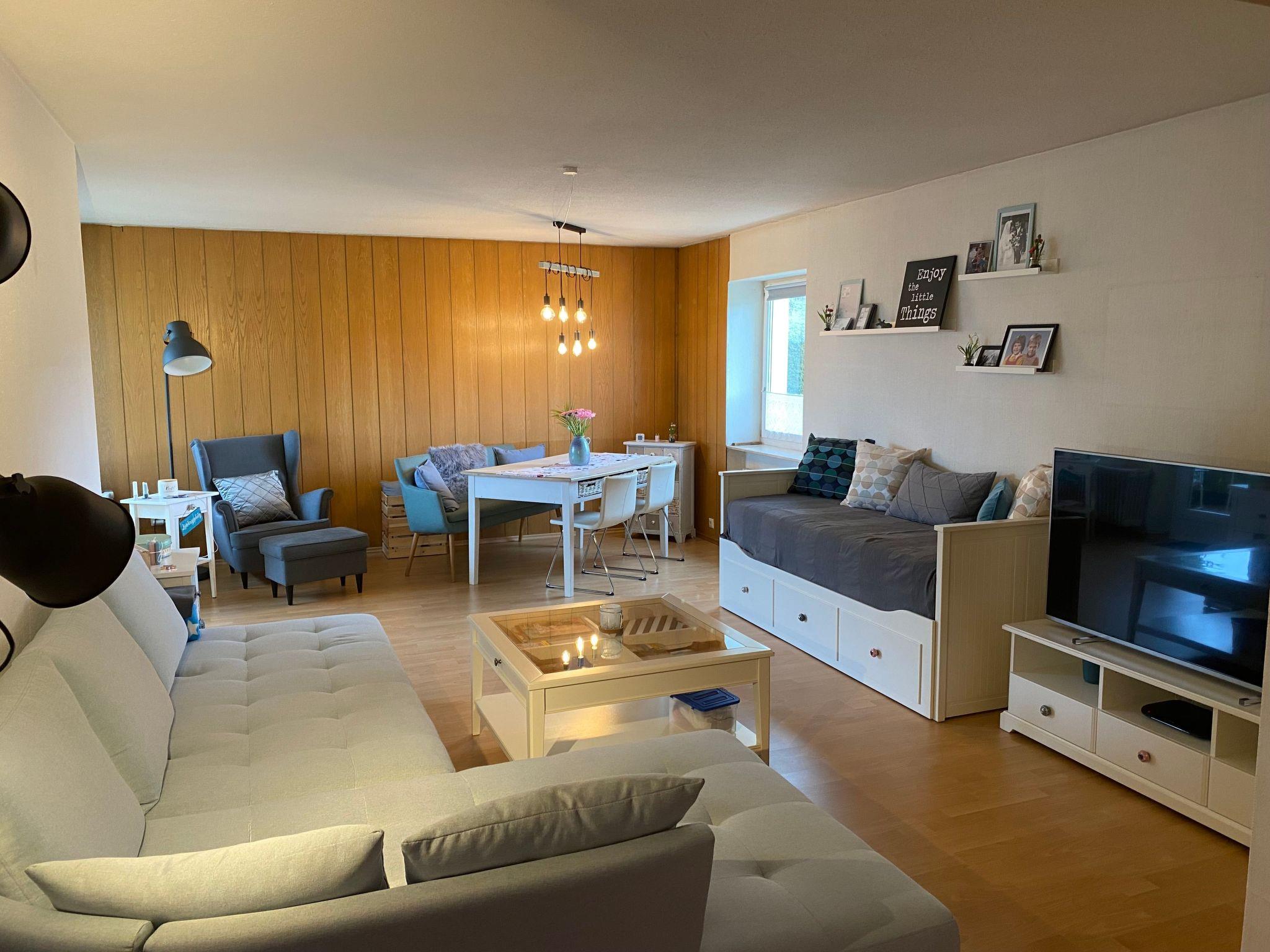 Innen werden Sie von einer ca. 80 m2 großen 2-Zimmer-Wohnung empfangen, die kürzlich renoviert wurde und durch ihre gemütliche Einrichtung besticht. Das großzügige Schlafzimmer ist mit einem Doppelbett, einem Etagenbett und einem geräumigen Schrank ausgestattet. Ein kleiner Balkon lässt Sie die Morgensonne genießen. Im Wohn-/Esszimmer finden Sie ein bequemes Sofa neben einem modernen Flachbildfernseher, ein ausziehbares Tagesbett, das als zusätzliche Schlafmöglichkeit dient, einen Esstisch sowie eine kuschelige Leseecke. Die neue Küche verfügt über einen Glaskeramikherd, Kühlschrank, Wasserkocher, Backofen und eine Abwaschmaschine. Ein neu renoviertes Badezimmer mit Regendusche und ein separates Gäste-WC runden das Angebot ab. Zum Komfort der Gäste gehört auch ein Einstellhallenplatz.