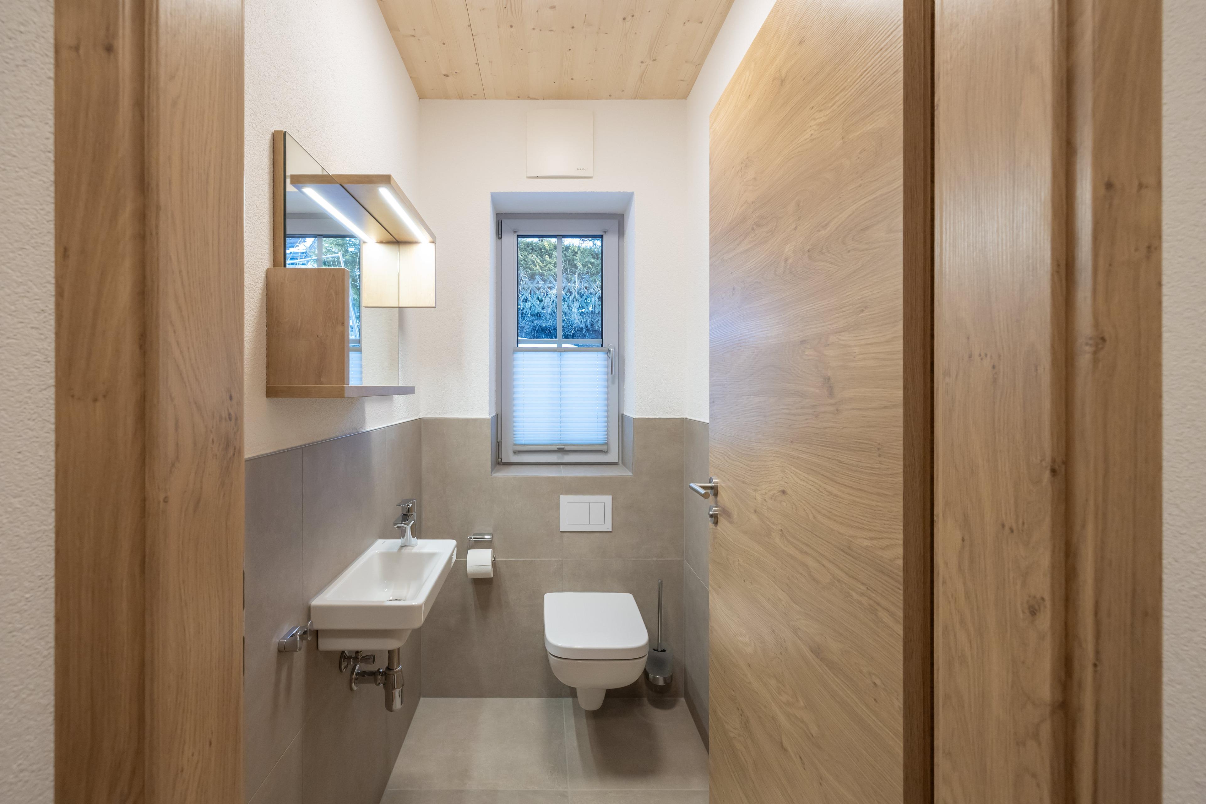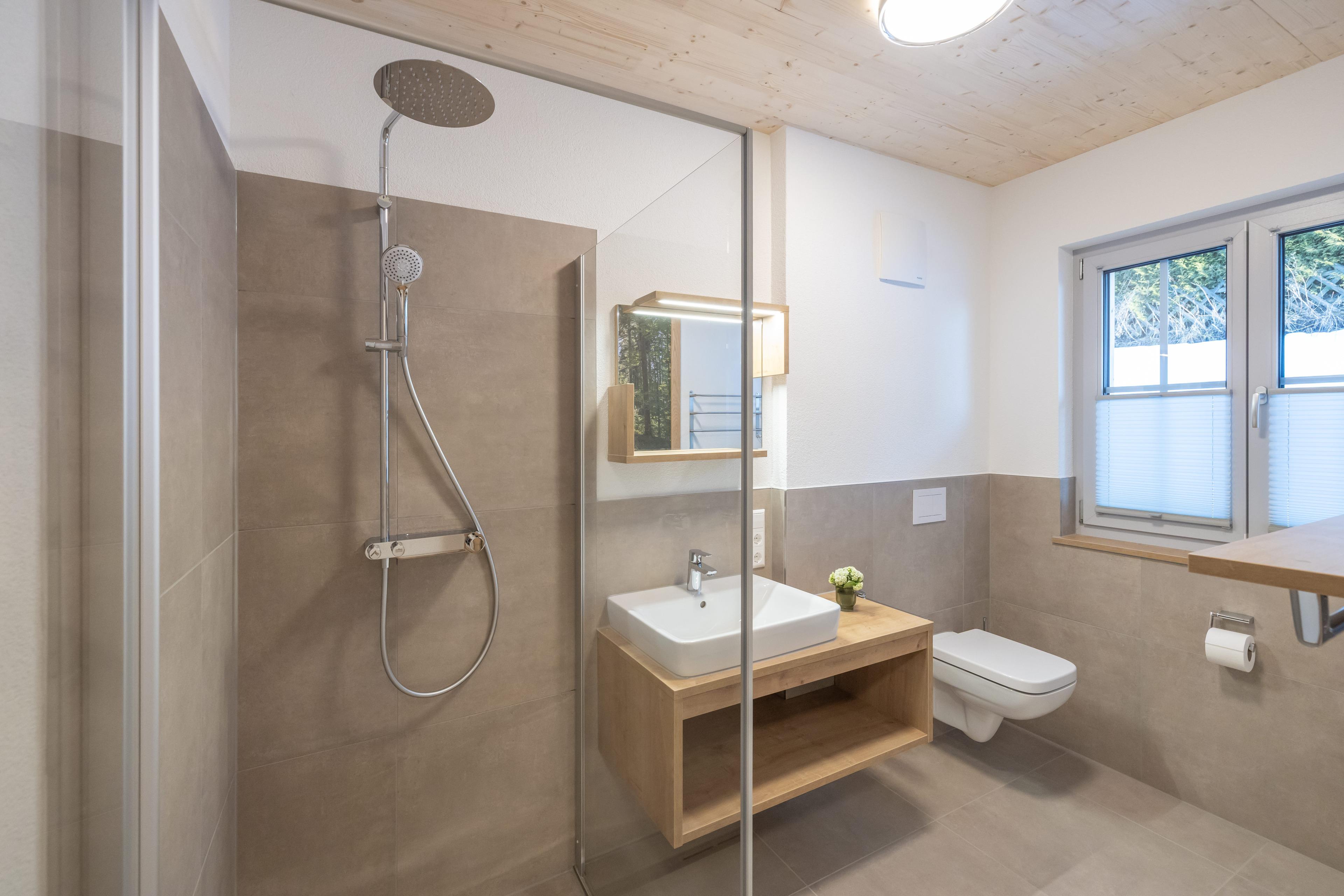 - ein Badezimmer mit WC, bodengleiche Dusche und Föhn