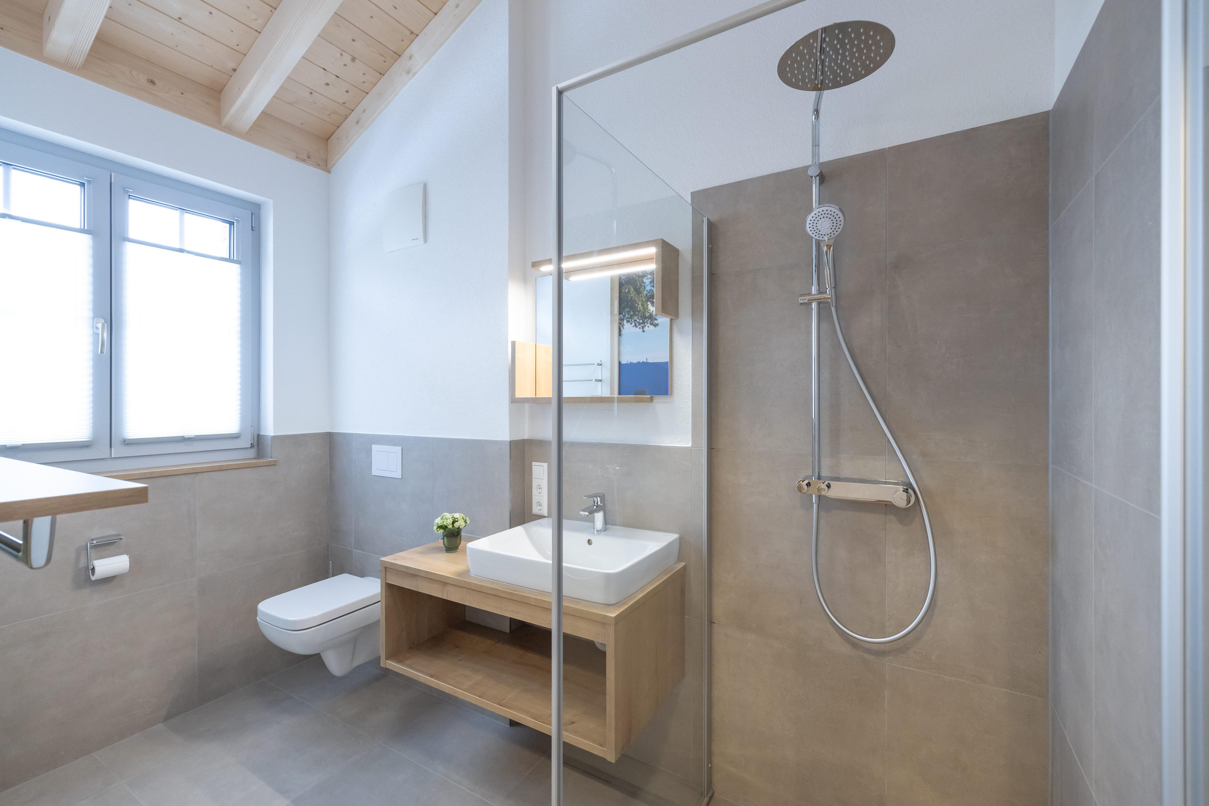 - ein Badezimmer mit WC, bodengleiche Dusche und Föhn