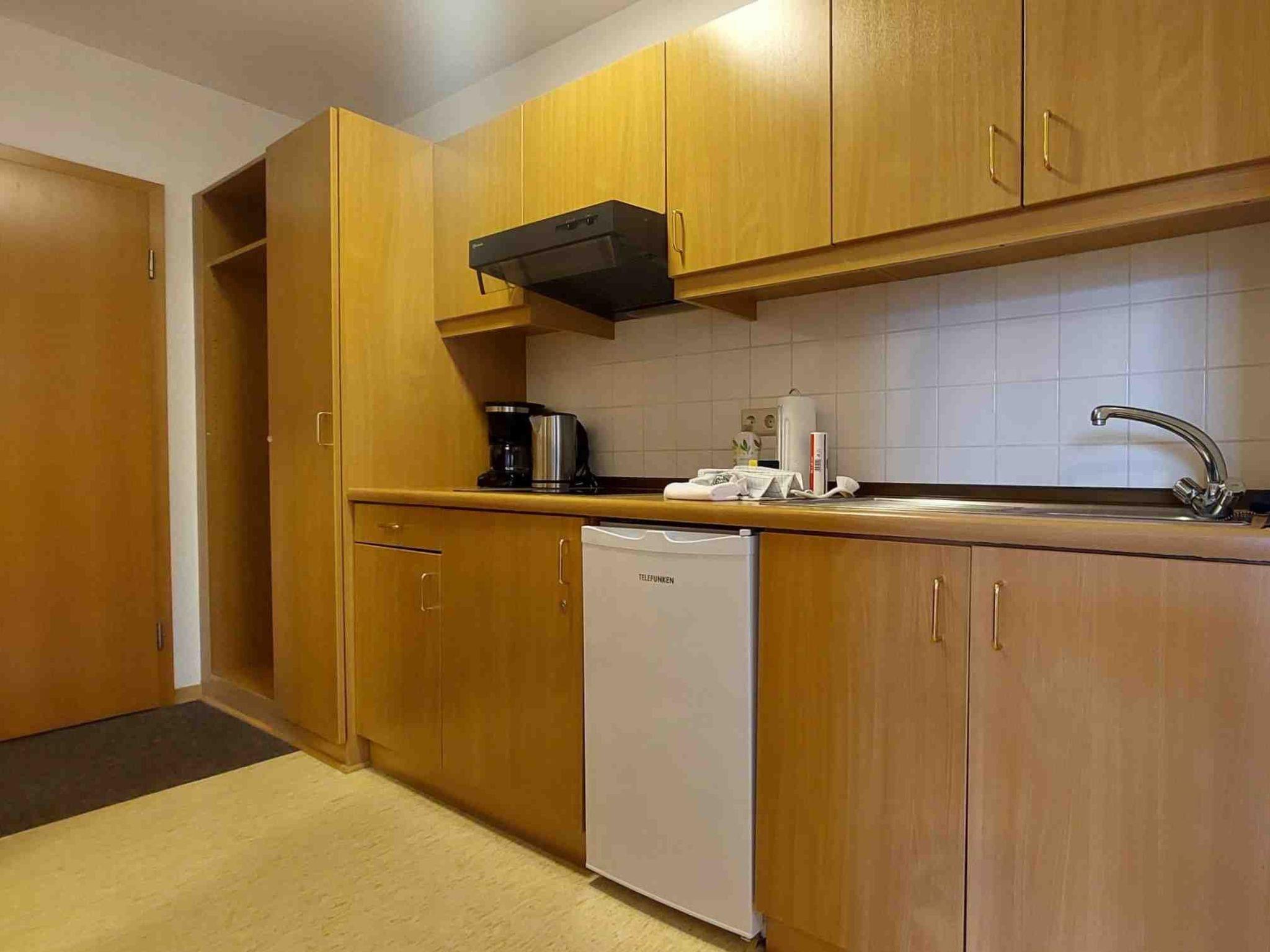 Es gibt eine voll ausgestattete Küche inklusive elektronischer Geräte wie Kühlschrank und Kaffeemaschine sowie einer Grundausstattung zum Kochen (Töpfe, Pfannen, Küchengeräte und Besteck).